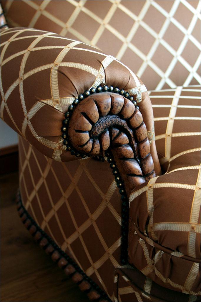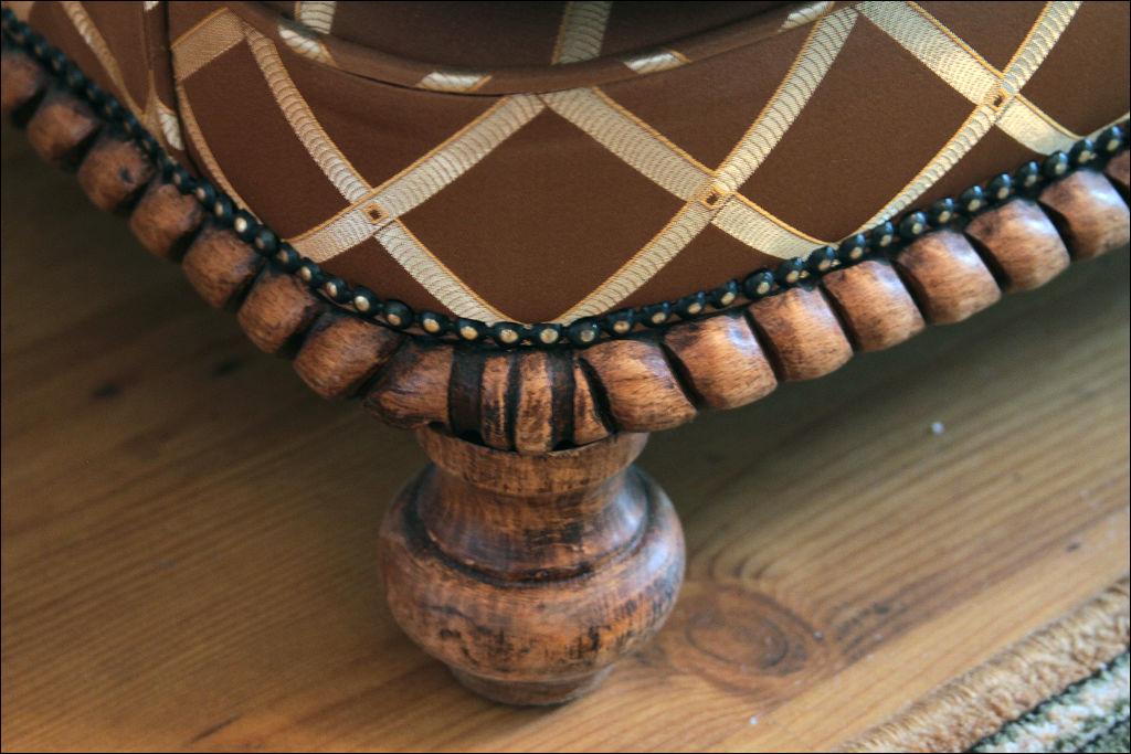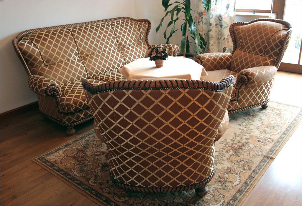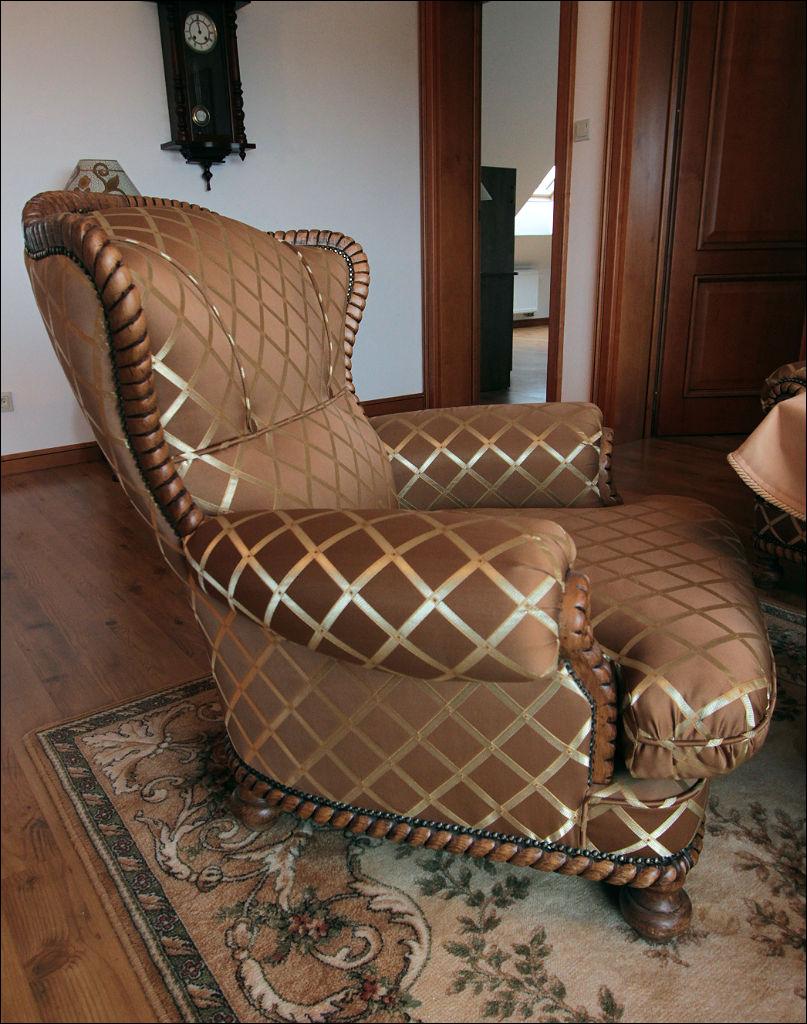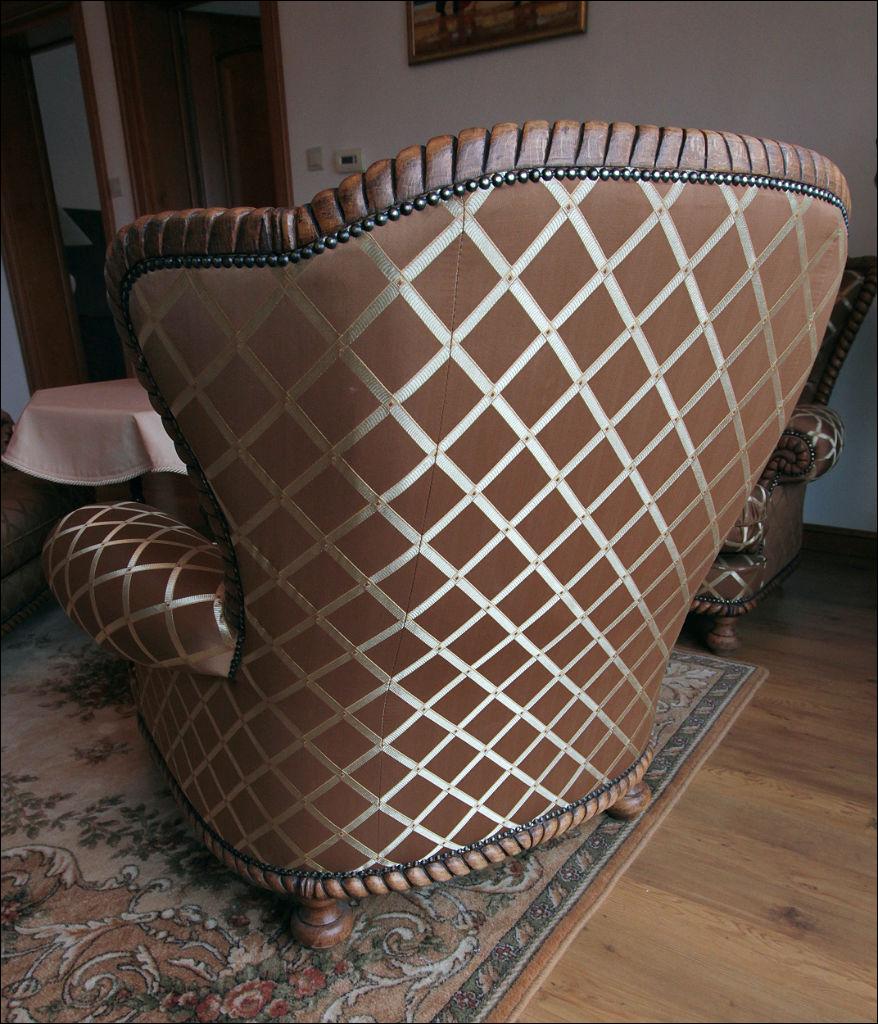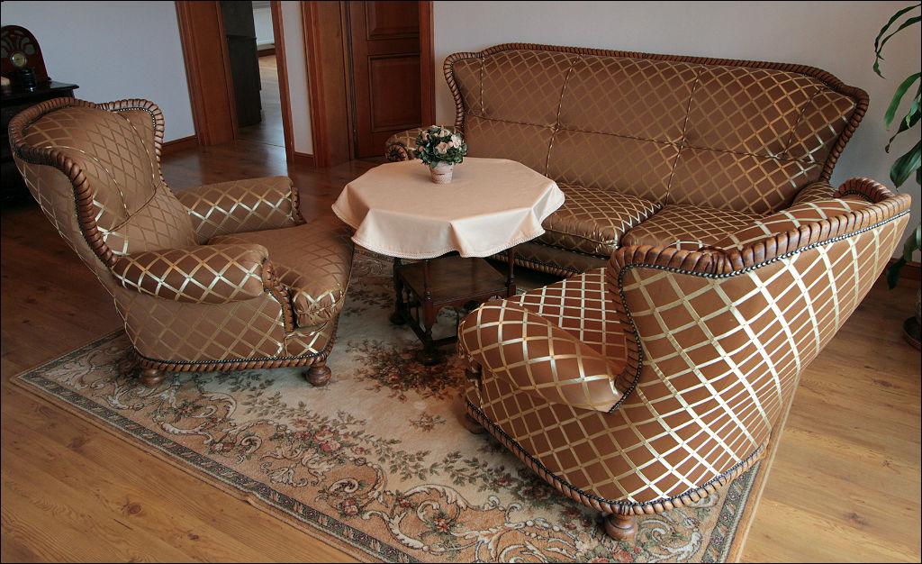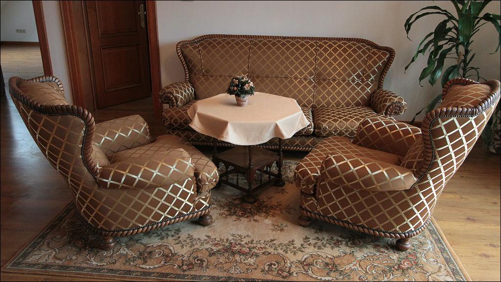 Bardzo efektowny, głównie ze względu na tapicerkę, komplet wypoczynkowy składający się z sofy oraz dwóch foteli. Stelaż dębowy, rzeźbiony, imitujący splecioną linę, nogi toczone.