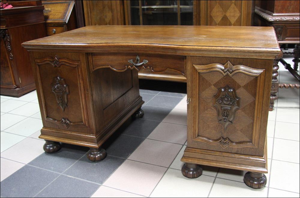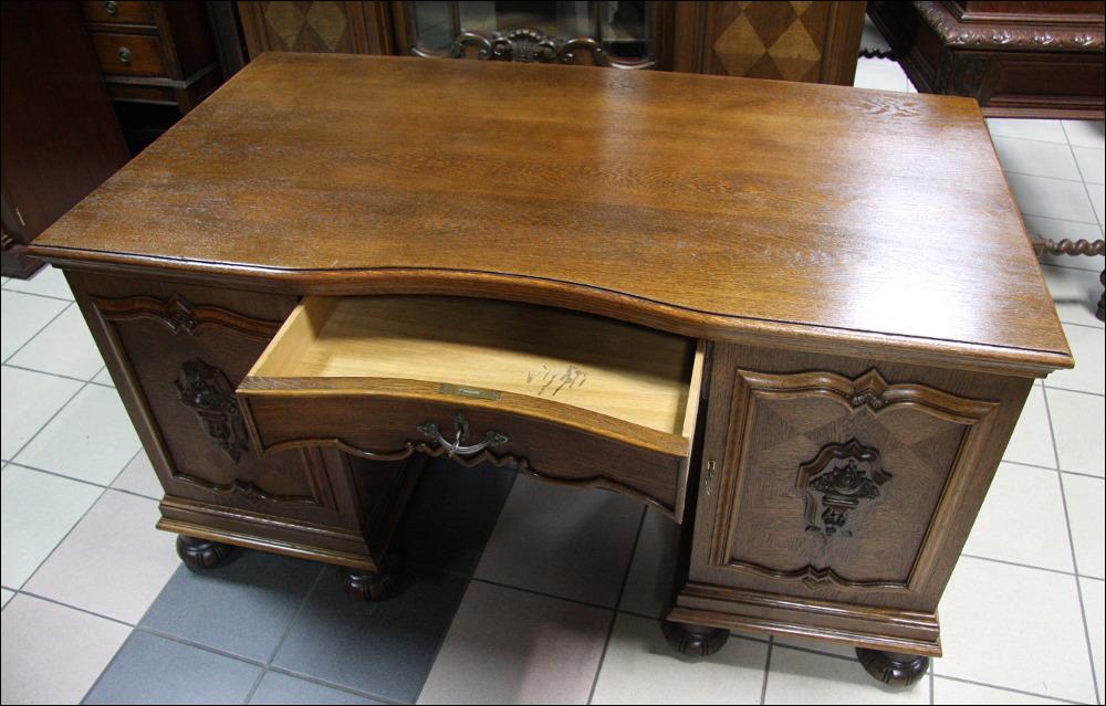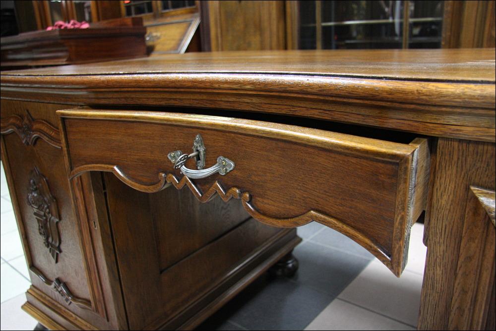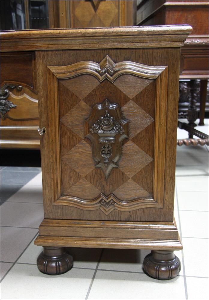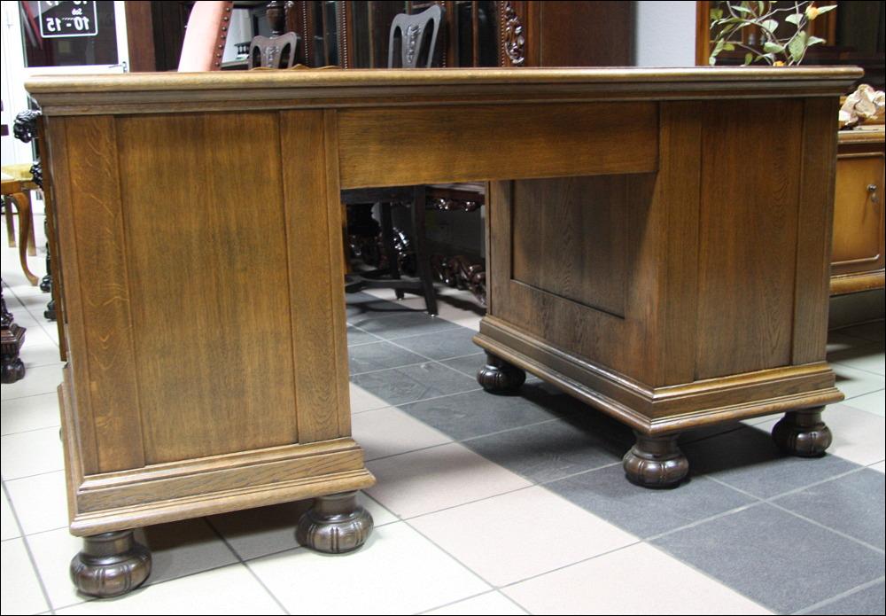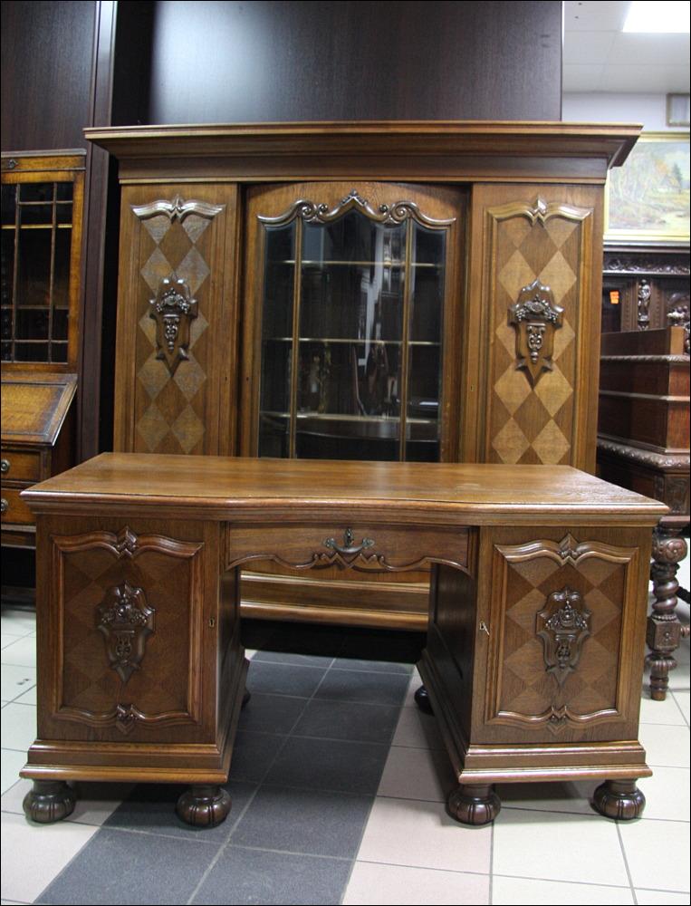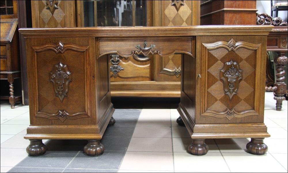 Komplet dębowych mebli gabinetowych z okresu międzywojennego. Biblioteka trzydrzwiowa, środkowe przeszklone szybą fazowaną, boczne zdobione aplikacjami oraz wzorem romboidalnej szachownicy. Nogi toczone i frezowane. Biurko zdobienniczo ideentyczne jak biblioteka, lewa szafka z trzema szufladami, prawa z jedną póką. W środkowej części szudlada zamykana na klucz.