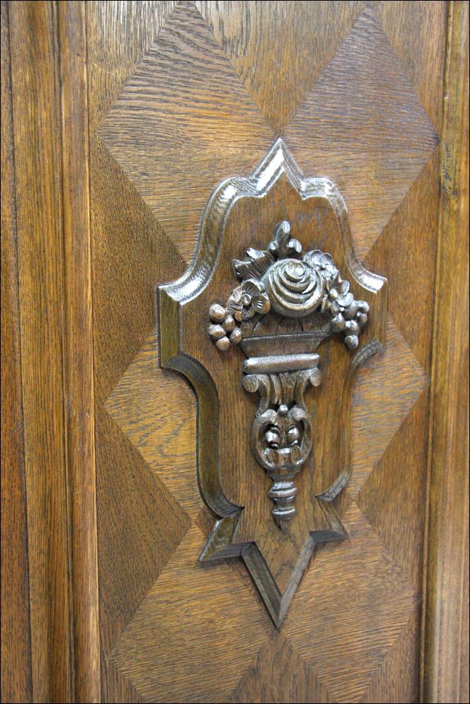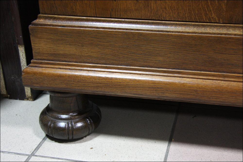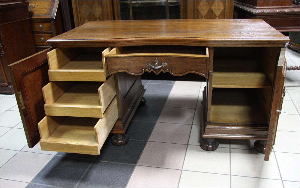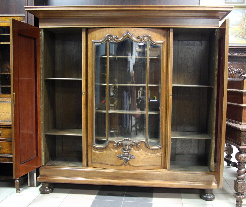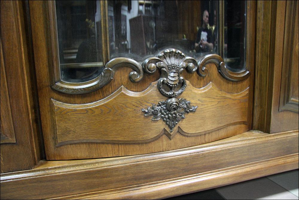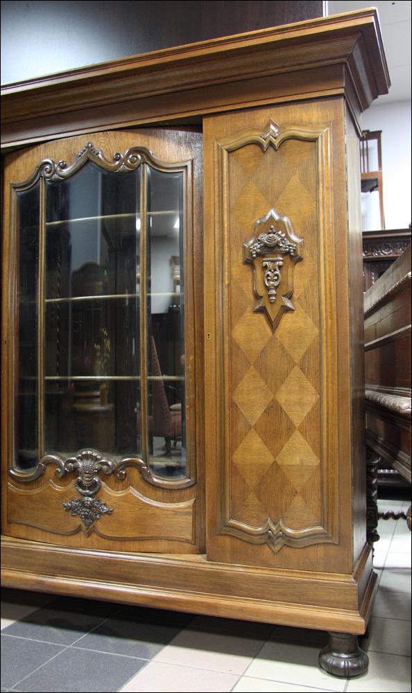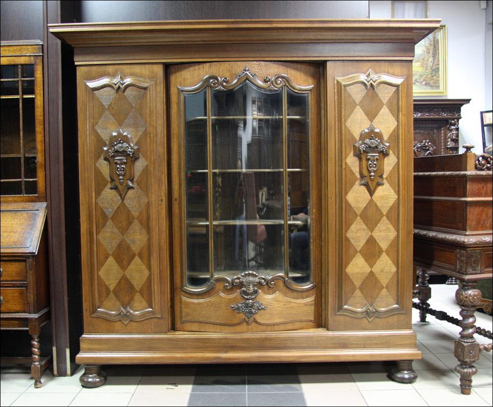 Komplet dębowych mebli gabinetowych z okresu międzywojennego. Biblioteka trzydrzwiowa, środkowe przeszklone szybą fazowaną, boczne zdobione aplikacjami oraz wzorem romboidalnej szachownicy. Nogi toczone i frezowane. Biurko zdobienniczo ideentyczne jak biblioteka, lewa szafka z trzema szufladami, prawa z jedną póką. W środkowej części szudlada zamykana na klucz.