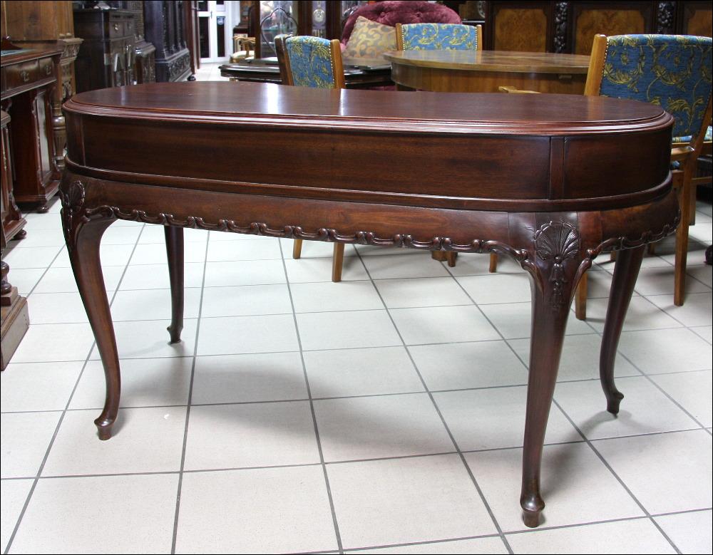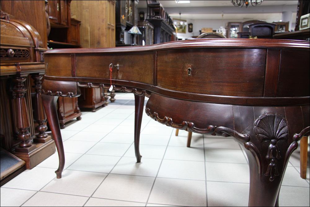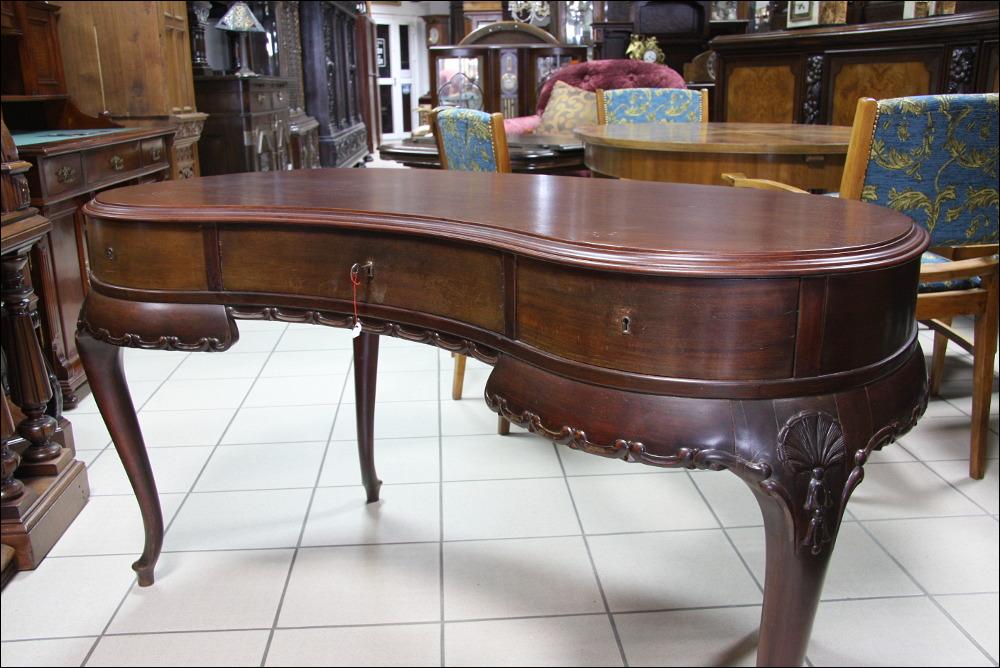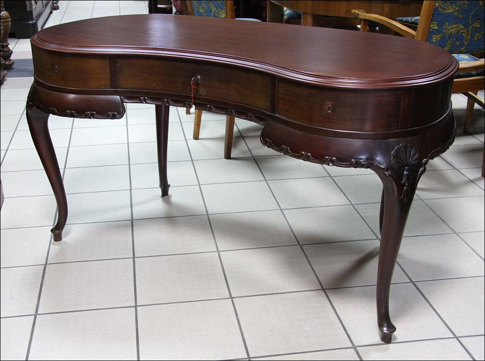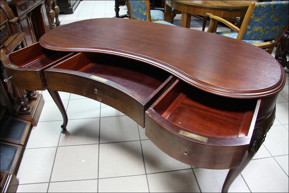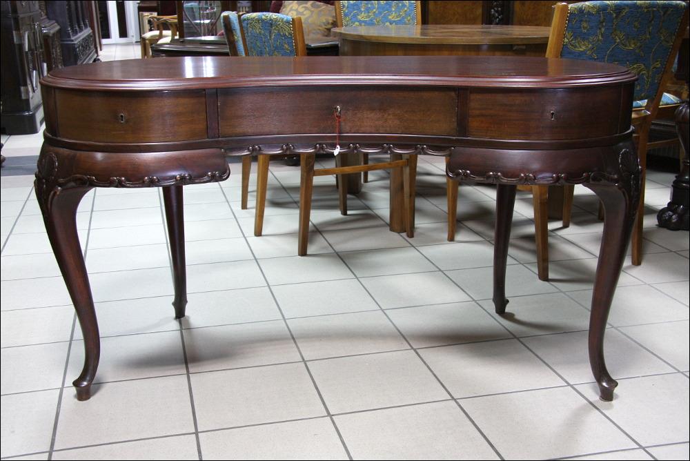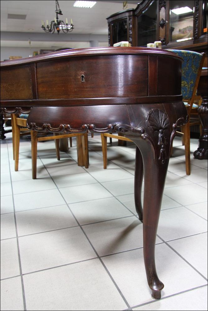 Filigranowe biurko w stylu chippendale. Mebel do niewielkiego pomieszczenia, któremu z pewnością doda uroku. Funkcjonalność mebla podnoszą niewątpliwie trzy głębokie, jak na takich gabarytów mebel, szuflady. Nogi profilowane, ze snycerskimi zdobieniami w górnej części.