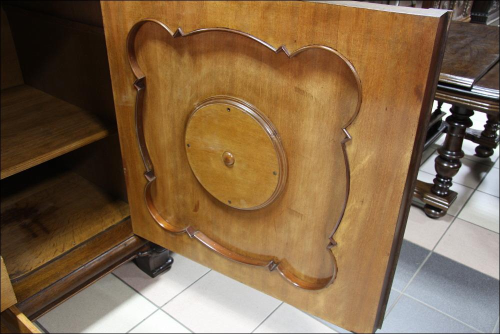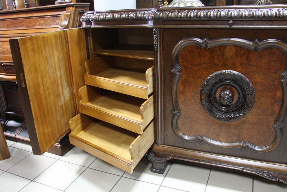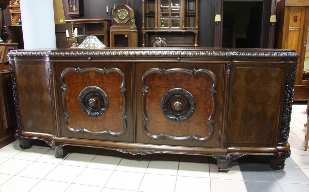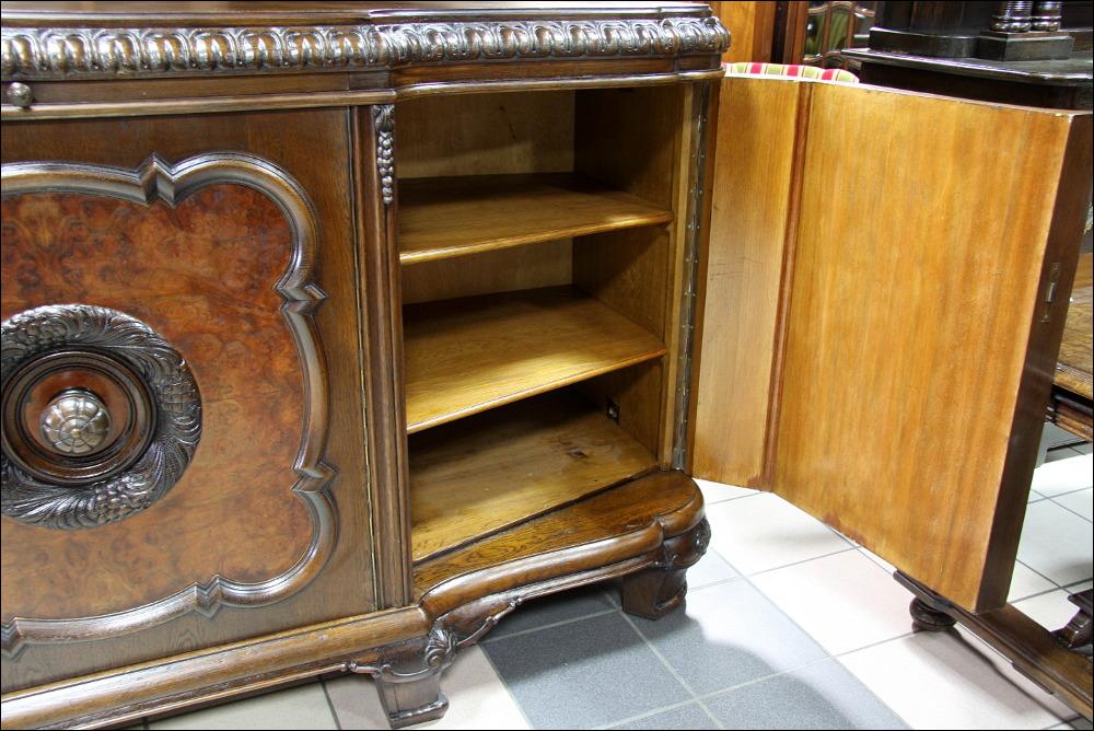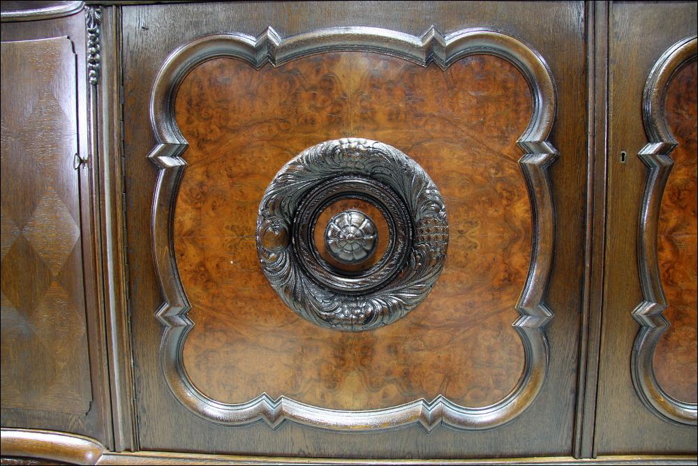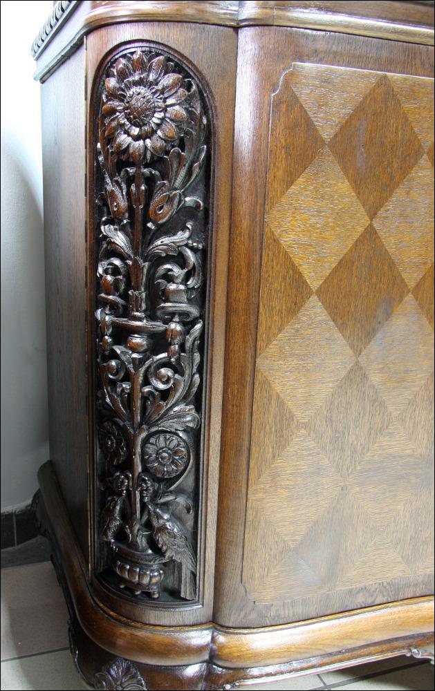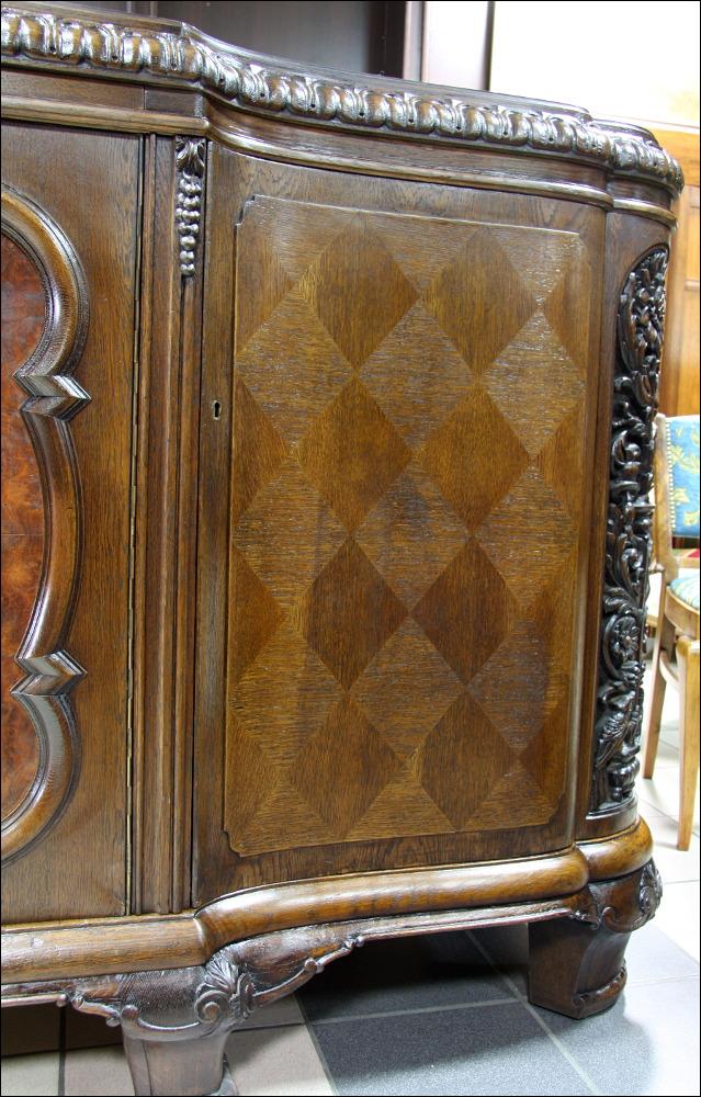 Olbrzymi, dębowy bufet z okresu międzywojennego. Jeśli do określenia 'olbrzymi' dodać jeszcze wagę mebla (transportowanie go w całości jest raczej niewykonalne - na szczęście mebel się rozbiera na części), mówić chyba możemy o monumencie. Fronty środkowych drzwi zdobione czeczotami orzechowymi w środku których znajdują się przepiękne rozety. Płyciny skrajnych drzwiczek dekorowane romboidalną szachownicą. Krawędzie mebla to popis sztuki snycerskiej dekoratora - bogate, głębokie zdobienia o tematyce roślinnej.