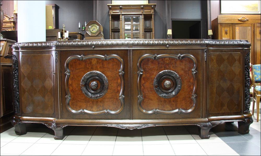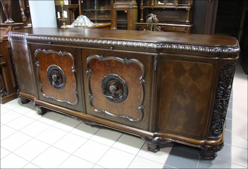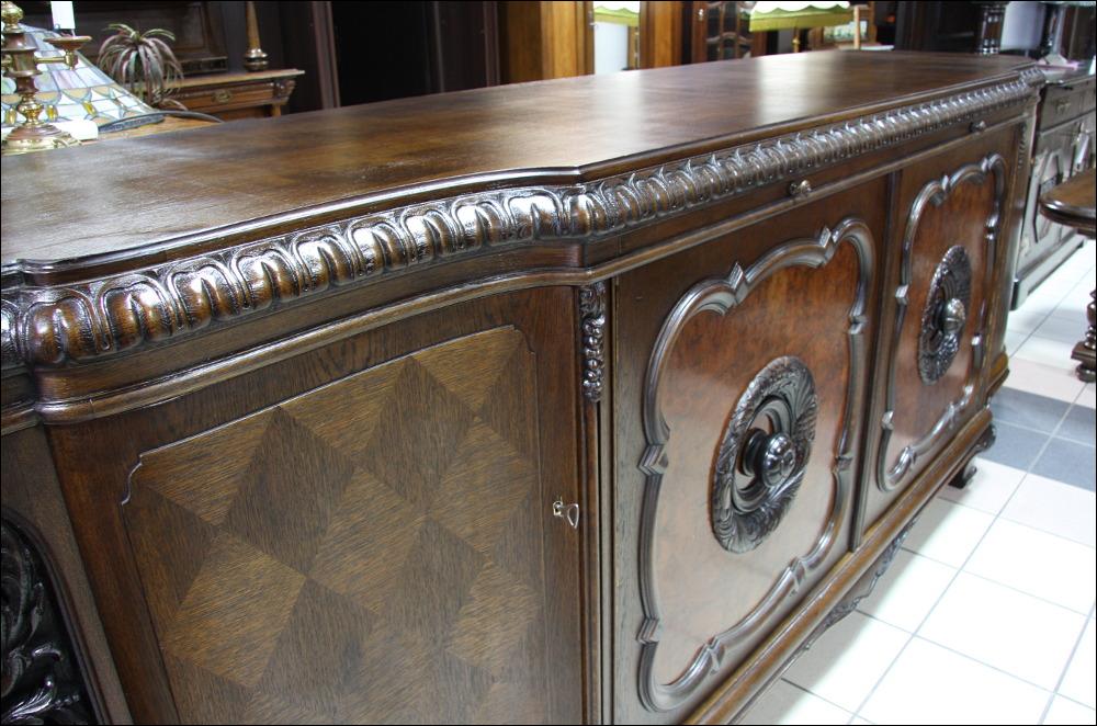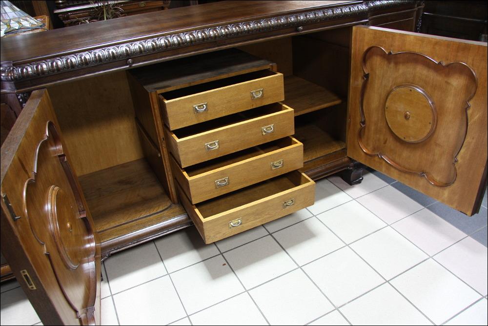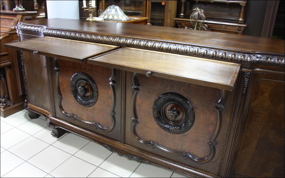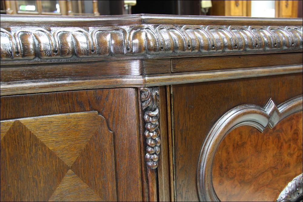 Olbrzymi, dębowy bufet z okresu międzywojennego. Jeśli do określenia 'olbrzymi' dodać jeszcze wagę mebla (transportowanie go w całości jest raczej niewykonalne - na szczęście mebel się rozbiera na części), mówić chyba możemy o monumencie. Fronty środkowych drzwi zdobione czeczotami orzechowymi w środku których znajdują się przepiękne rozety. Płyciny skrajnych drzwiczek dekorowane romboidalną szachownicą. Krawędzie mebla to popis sztuki snycerskiej dekoratora - bogate, głębokie zdobienia o tematyce roślinnej.