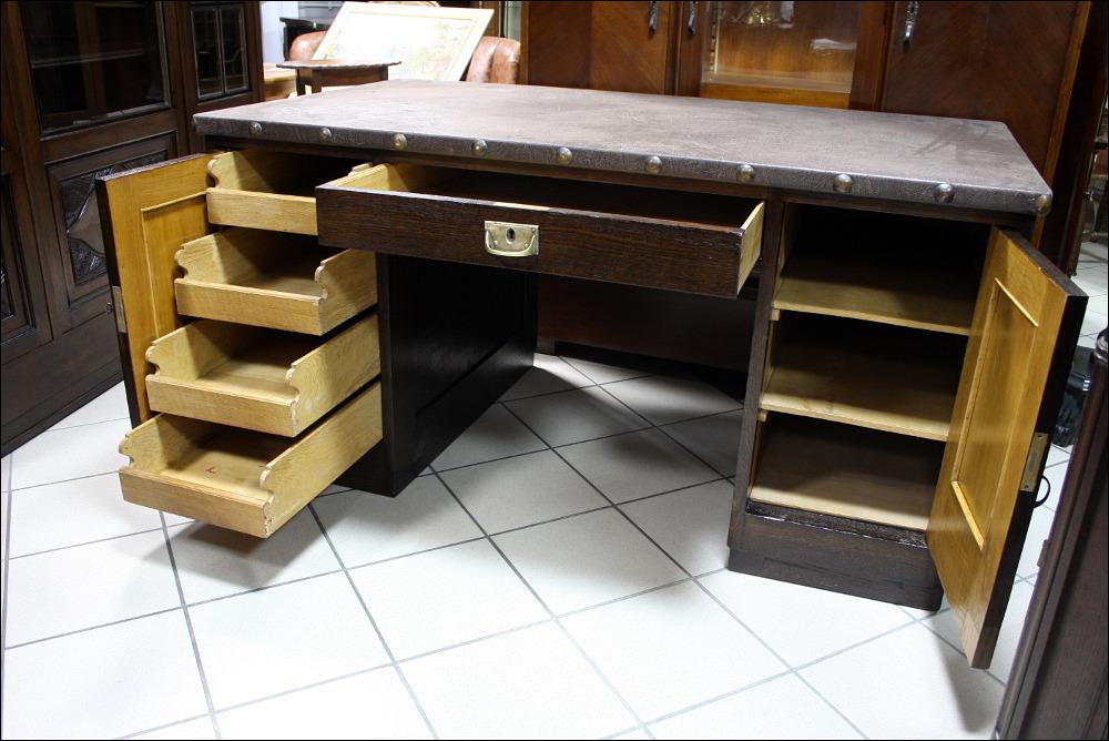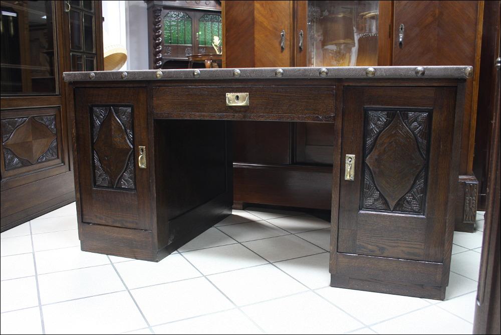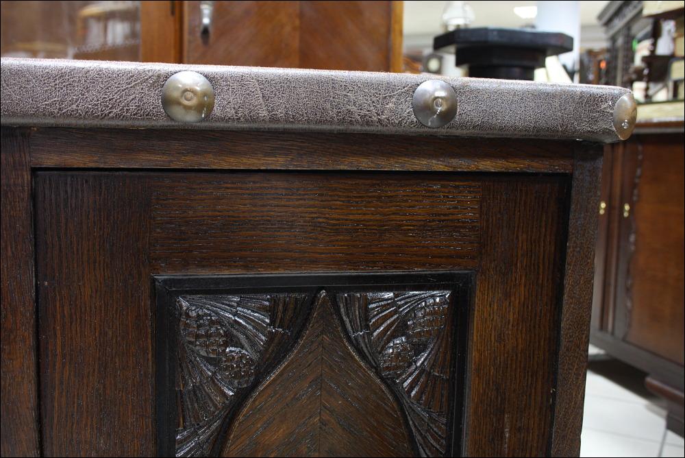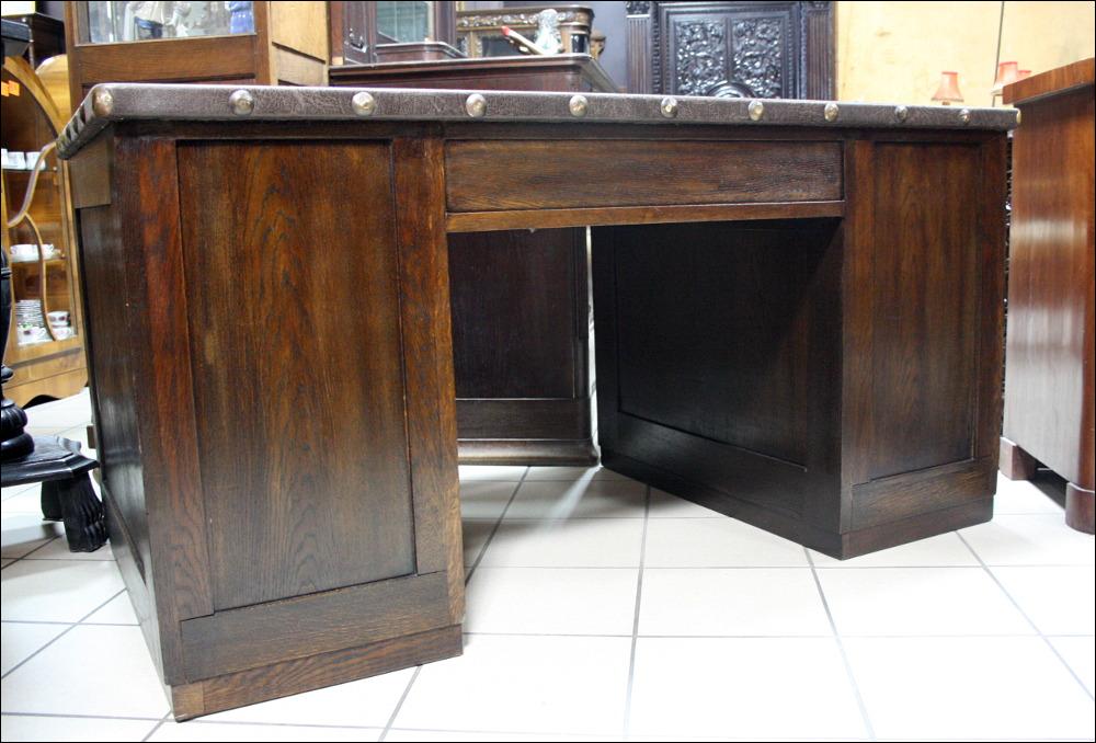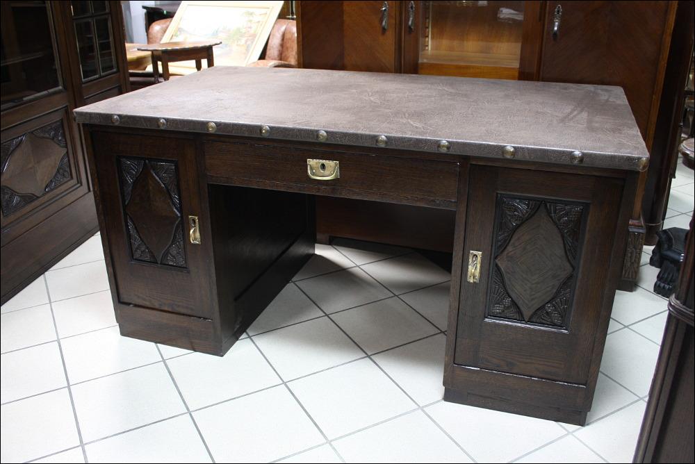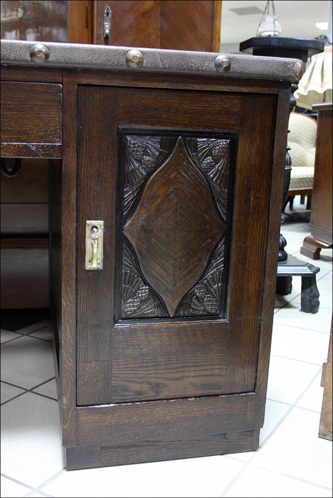 Komplet mebli gabinetowych z początku XX wieku. Biblioteka trzydrzwiowa, przeszklona szybami fazowanymi. W dolnej części subtelne snycerskie dekoracje. Biurko głębokie z blatem pokrytym materiałem przypominającym starą, wysłużoną skórę- w odróżnieniu od skóry, ciepłym w dotyku. Zdobienia analogiczne do tych, które znajdują się na bibliotece. Lewa szafka z czterema szufladami, prawa z dwoma półkami. W środkowej części szuflada zamykana na klucz.