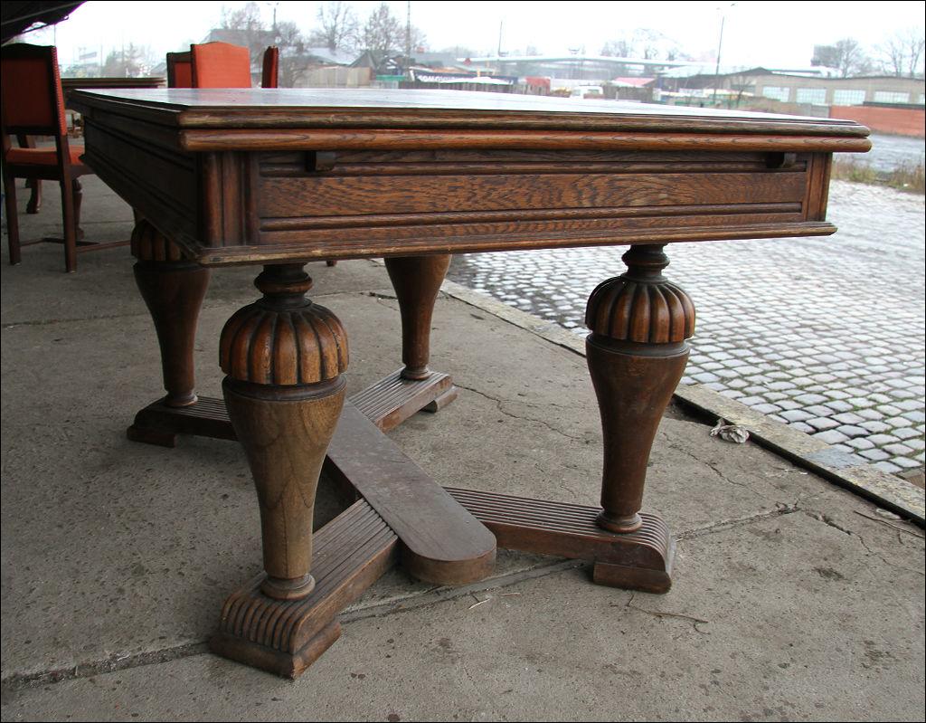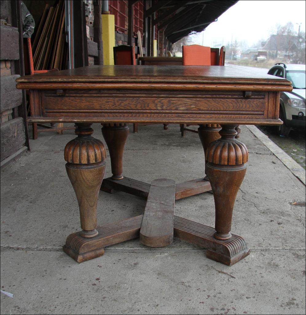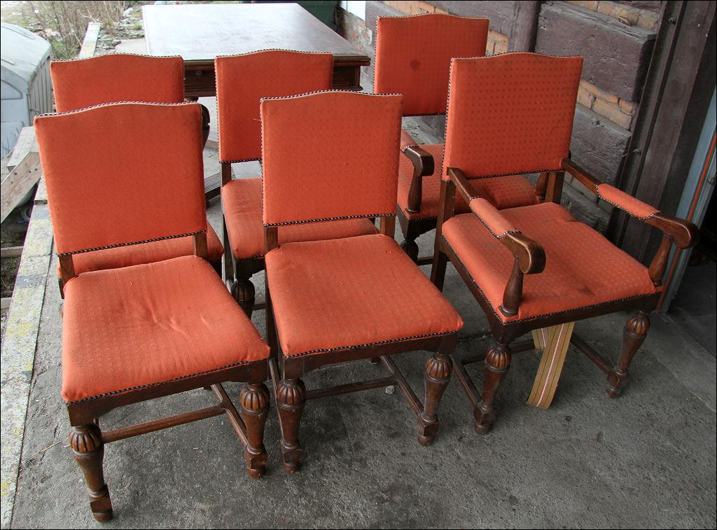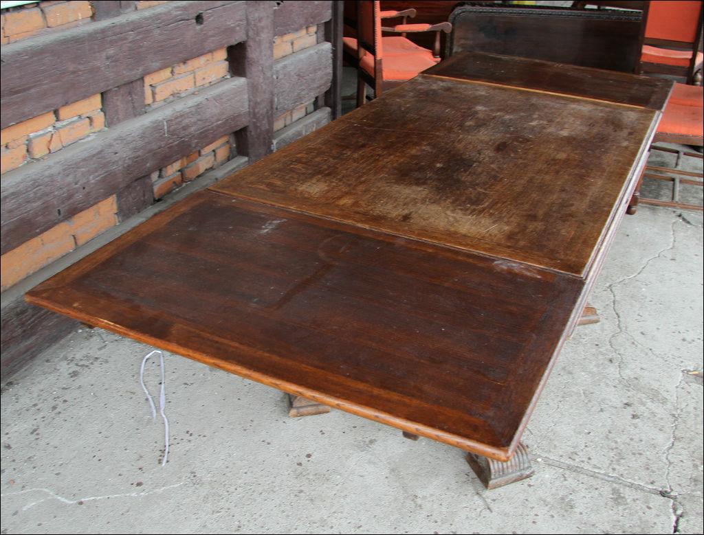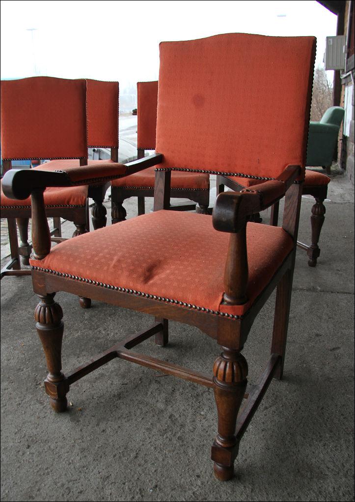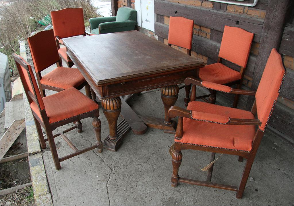 Komplet składający się ze stołu oraz 6 krzeseł. Dwa z nich z oparciami, w formie niewielkich tronów. Stelaż dębowy, masywny.
