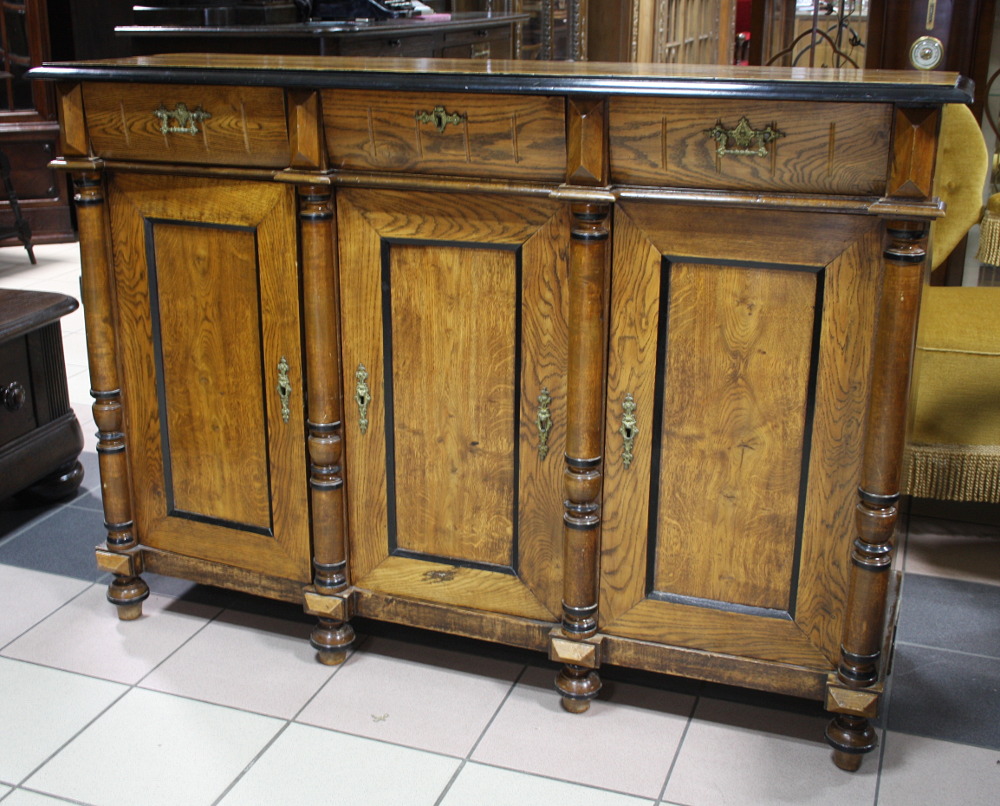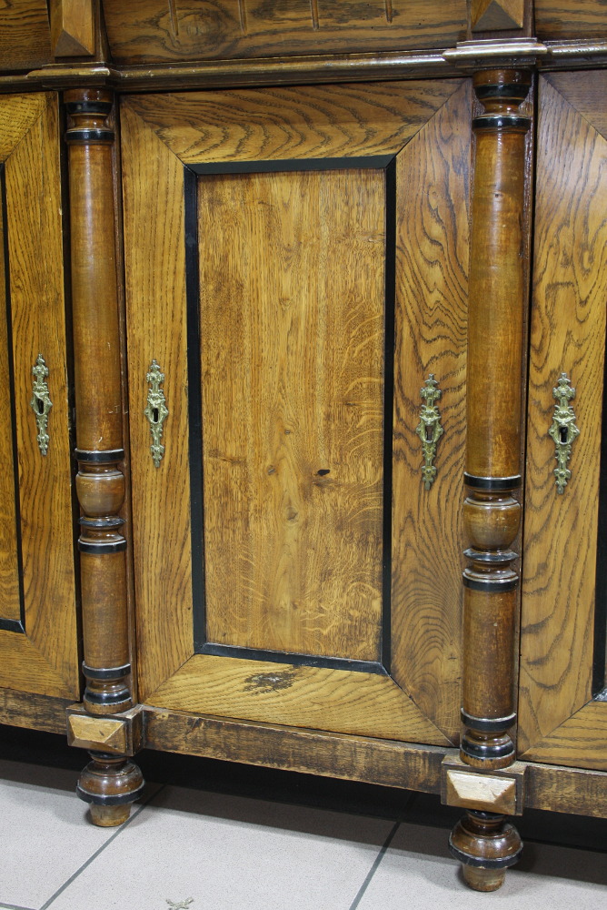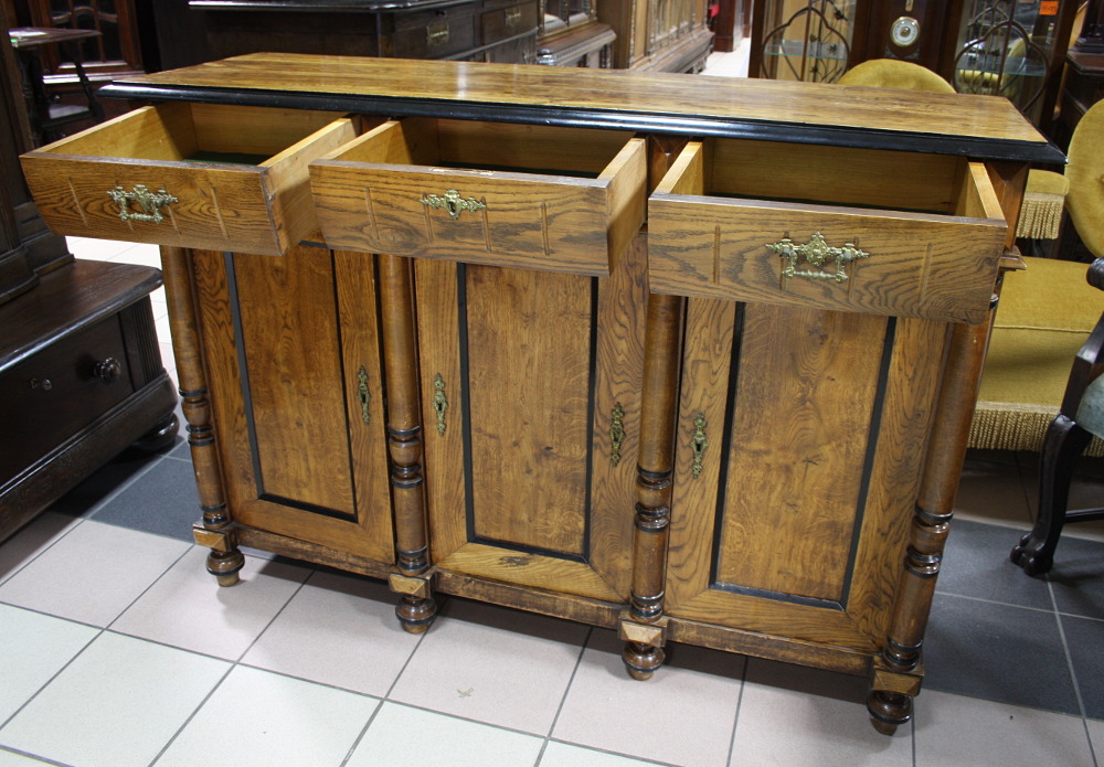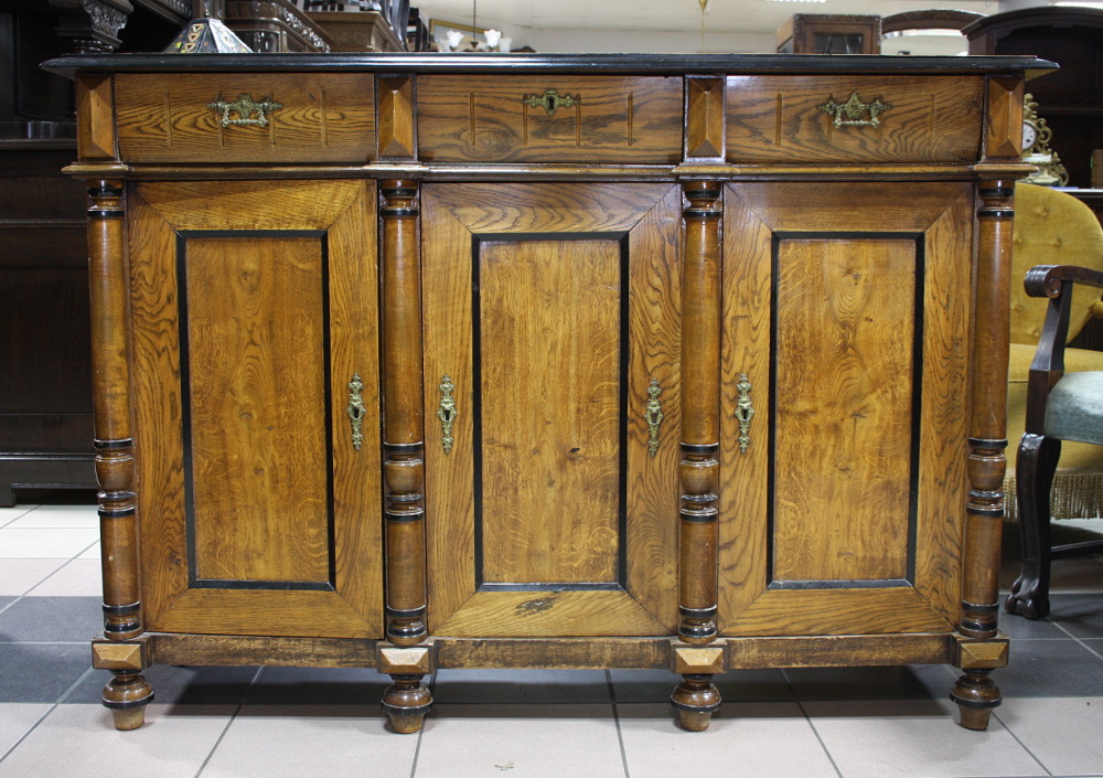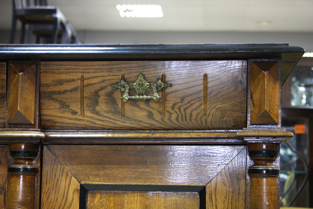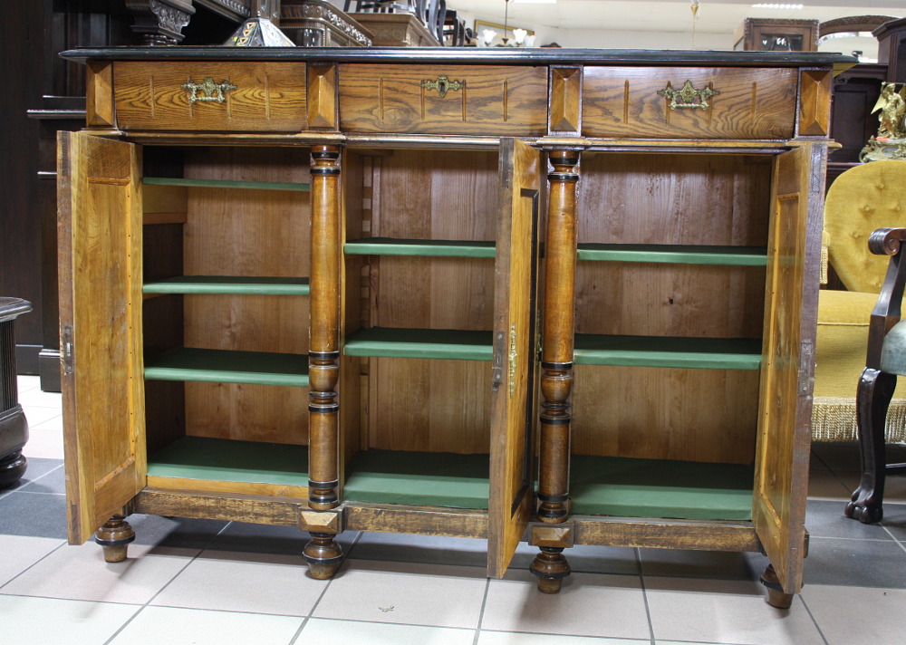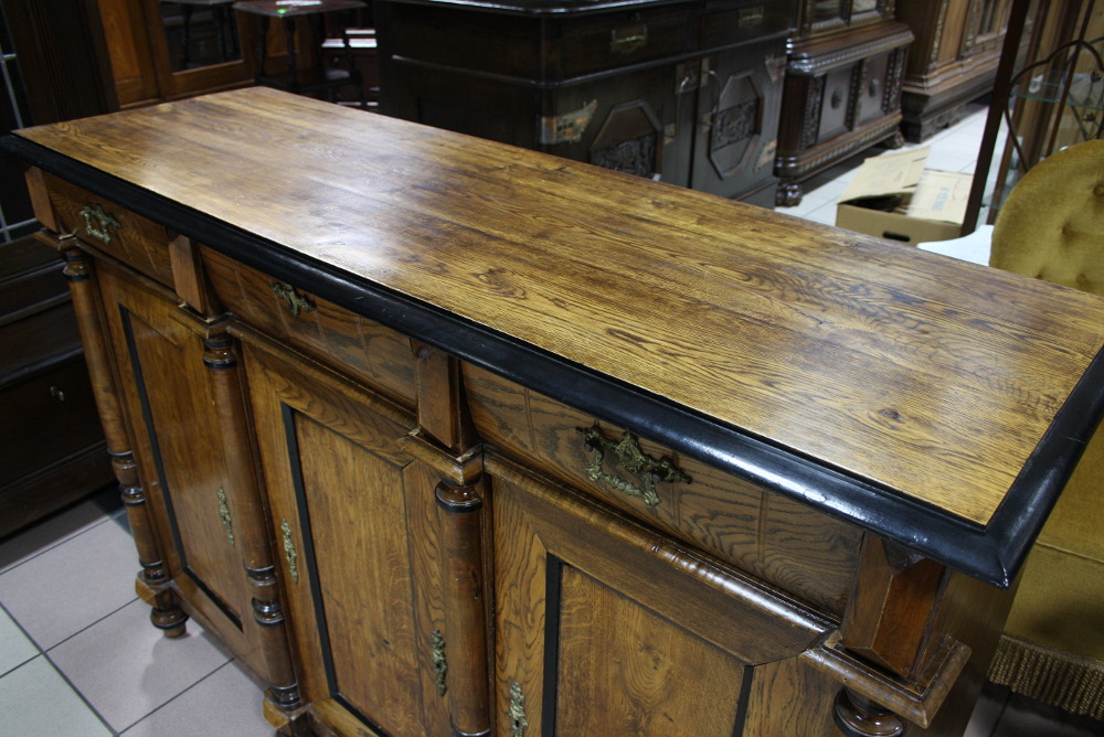 Eklektyczna komoda z końca XIX wieku. Krawędzie blatu oraz płycin w drzwiach barwione na czarny kolor. Nogi toczone, tralki między drzwiczkami mebla.