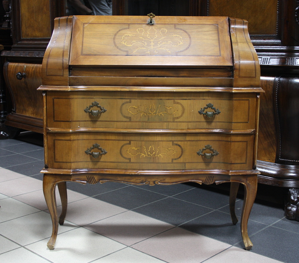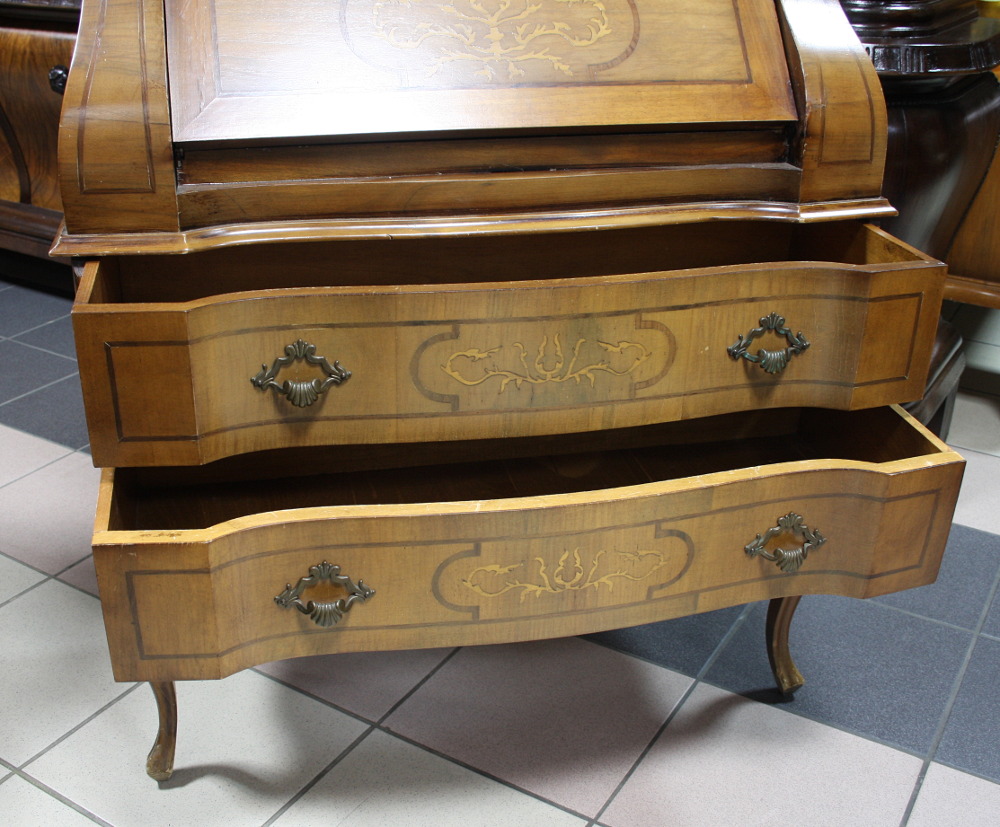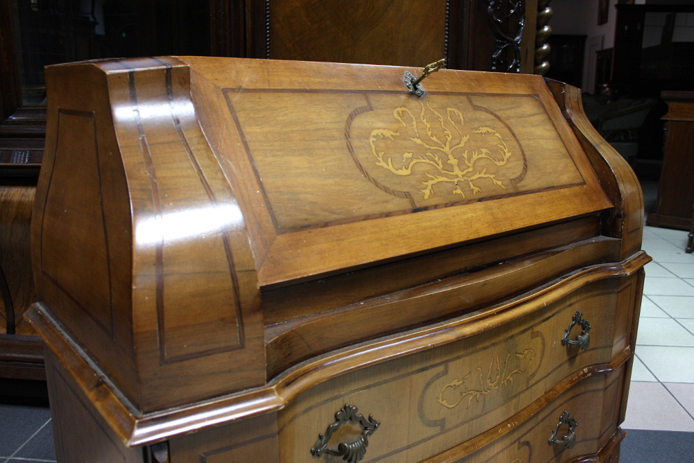 Sekretarzyk w stylu chippendale. Mebel w ciekawej bryle, z wieloma niewielkimi wypukłościami. Liczne zdobienia w postaci intarsji. Nogi profilowane, typowe dla mebli w tym stylu.