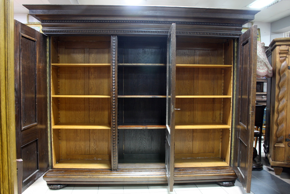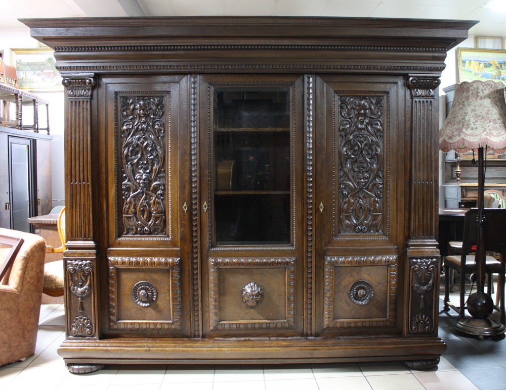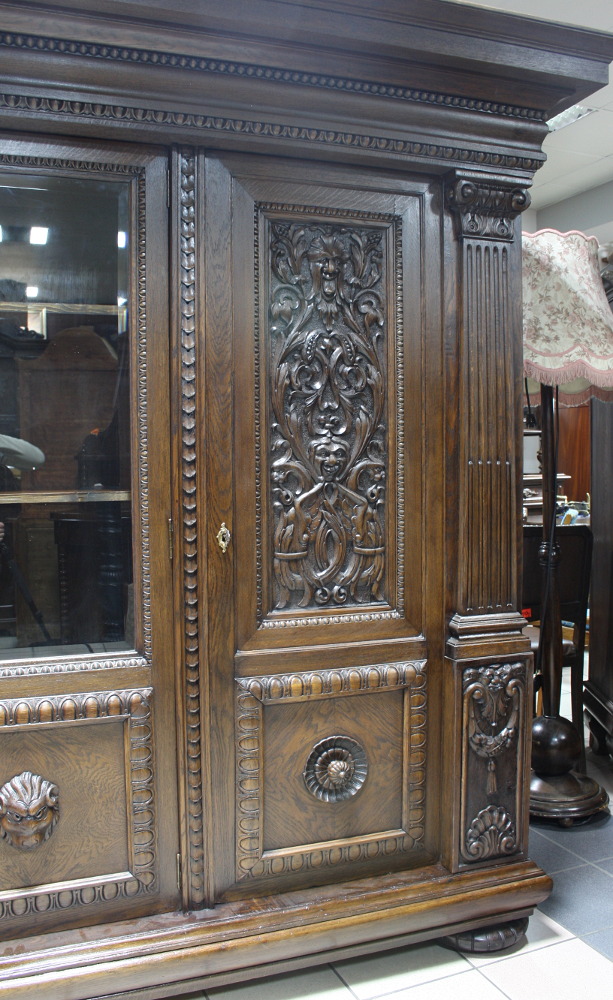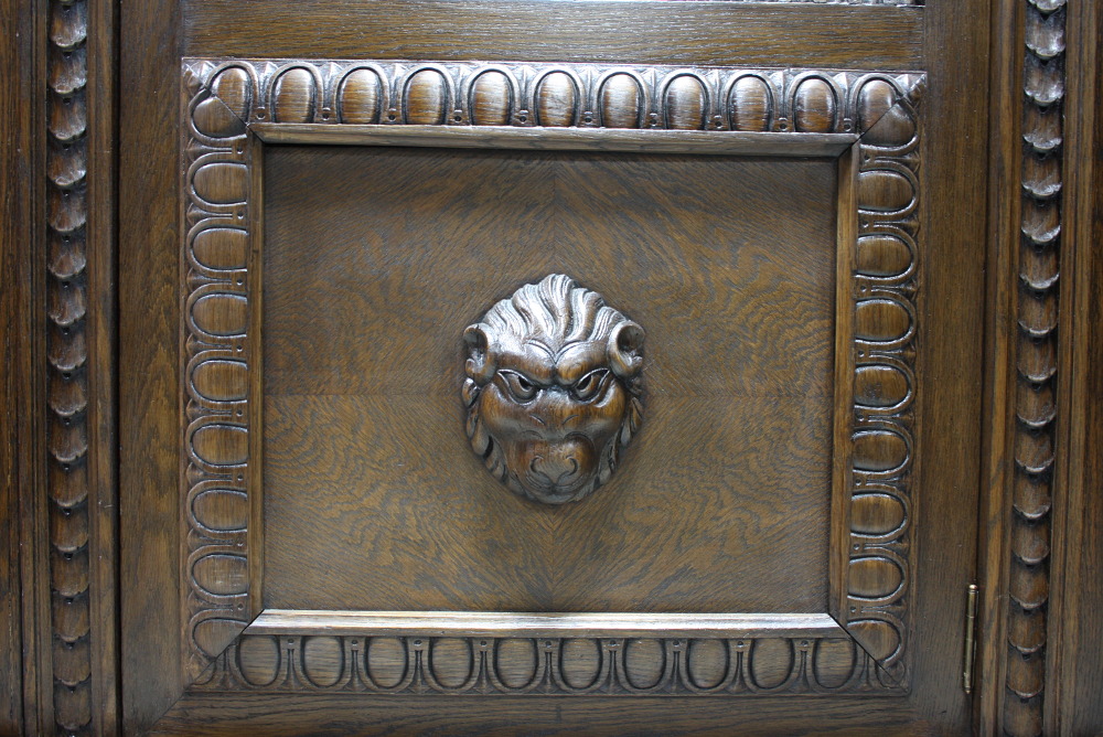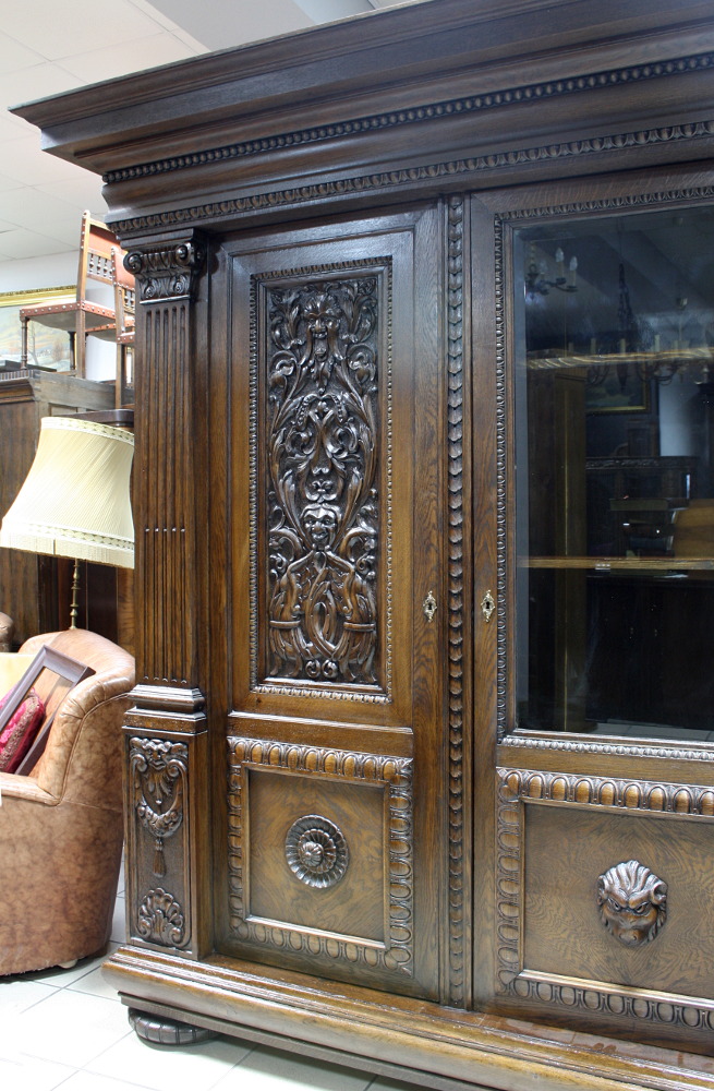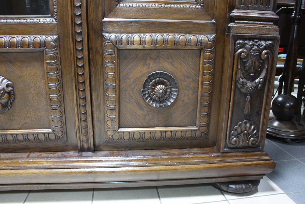 Masywna, dębowa biblioteka z okresu międzywojennego. Mebel typowo gabinetowy, ciężki i solidny. Płyciny bocznych drzwi ze zdobieniami snycerskimi, środkowe z fazowaną szybą. Nogi płaskie, toczone. Wnętrze z 9 półkami, po 3 w każdej częśći