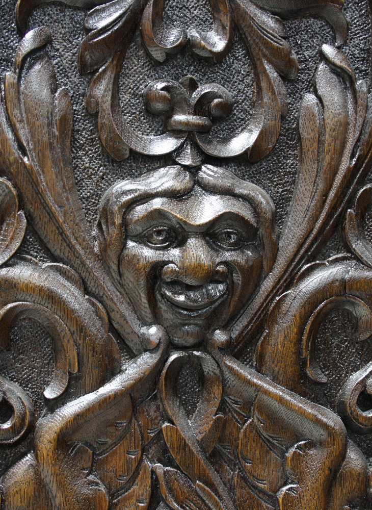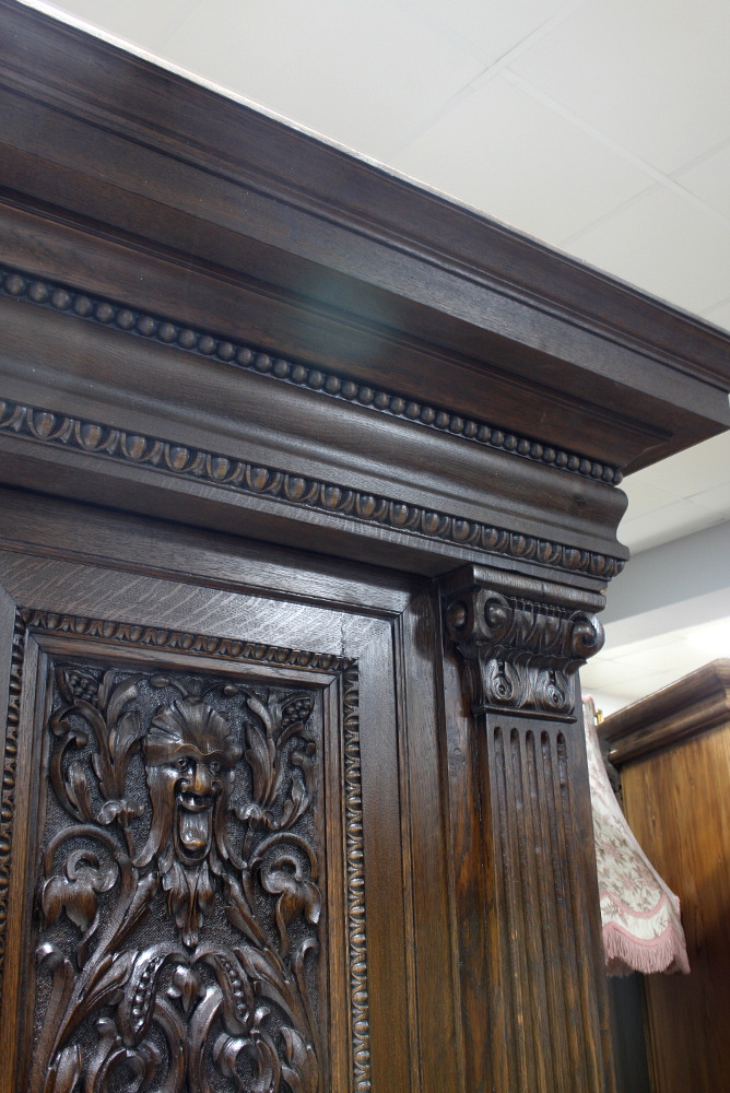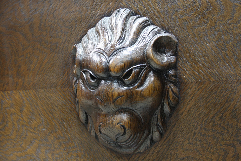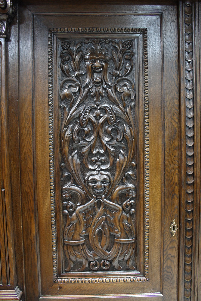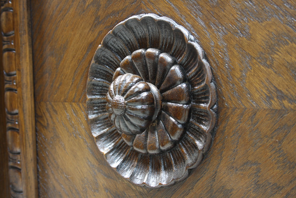 Masywna, dębowa biblioteka z okresu międzywojennego. Mebel typowo gabinetowy, ciężki i solidny. Płyciny bocznych drzwi ze zdobieniami snycerskimi, środkowe z fazowaną szybą. Nogi płaskie, toczone. Wnętrze z 9 półkami, po 3 w każdej częśći