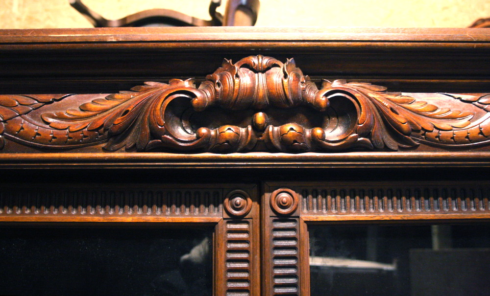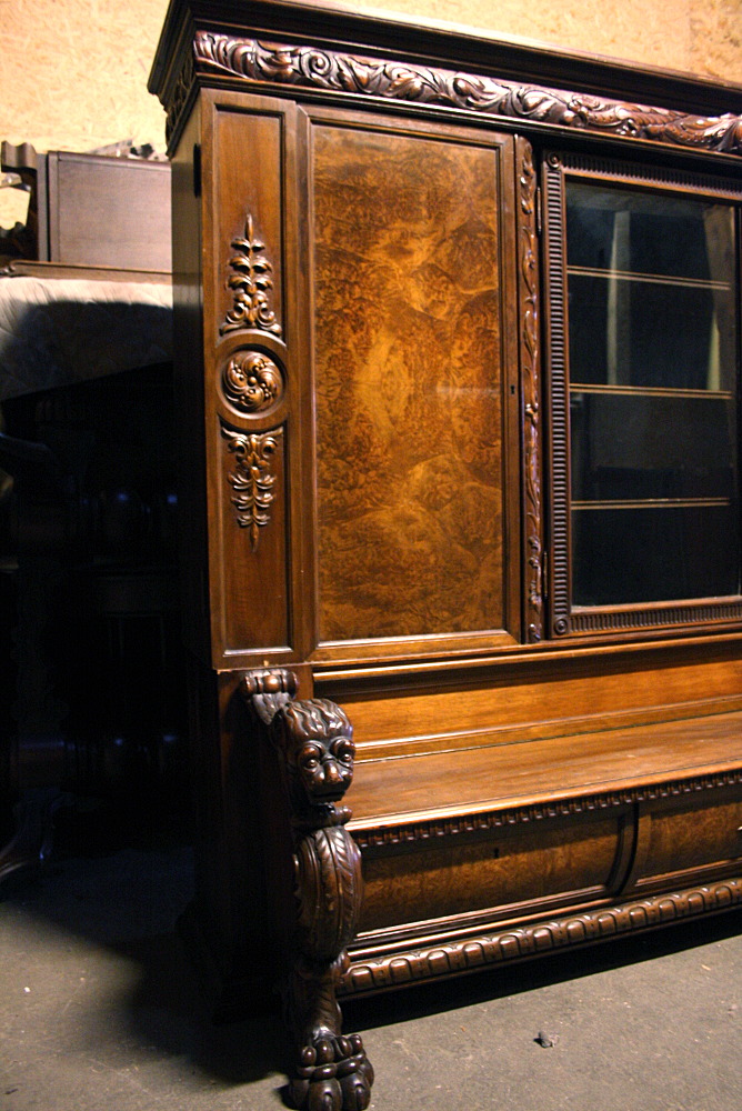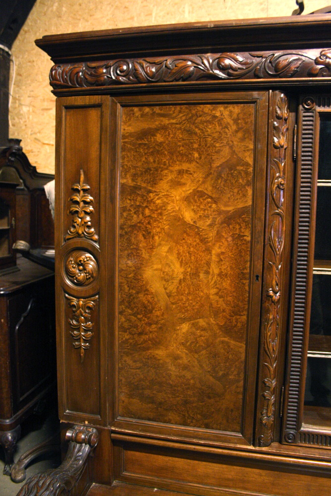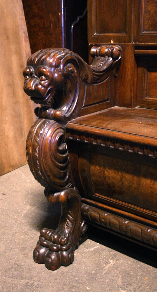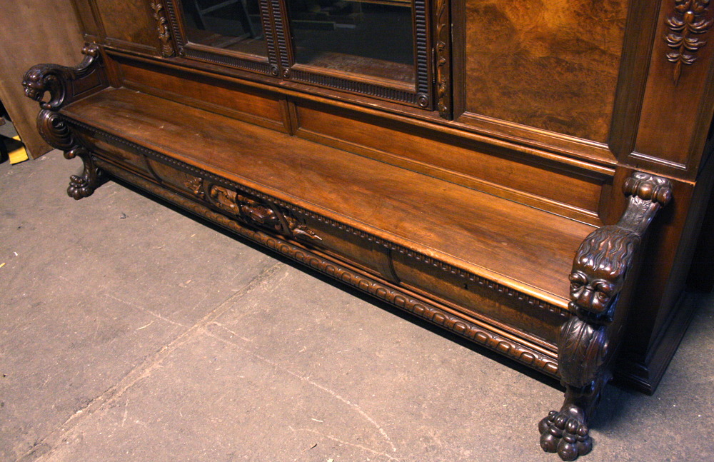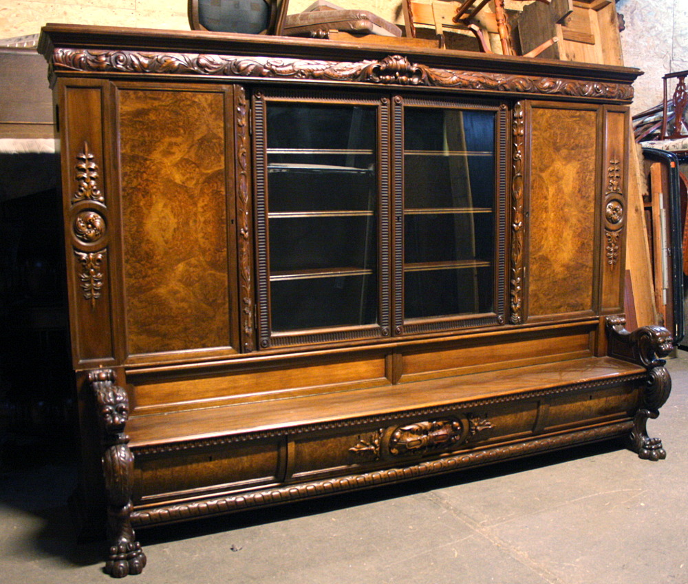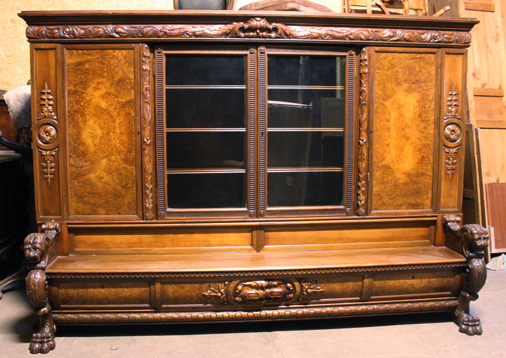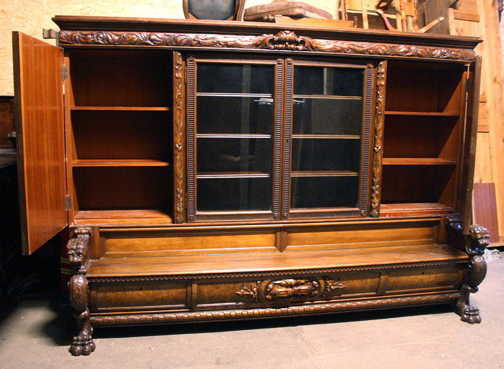 Duża biblioteka z ławką - kolejna pozycja w naszej ofercie stanowiąca połączenie dwóch różnych rodzajów mebli . Tym razem jest to mebel o bardziej okazały i wymagający dużego pomieszczenia. Czterodrzwiowa - w każdej części po trzy półki. Środkowa część przeszklona. W dolnej części, tuż pod siedziskiem ławeczki znajdują się cztery szuflady zamykane na klucz. Oparcia w formie lwich głów, komponujące się idealnie z lwimi łapami stanowiącymi nogi mebla.