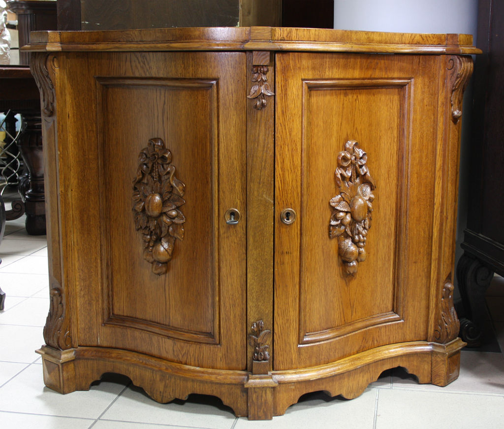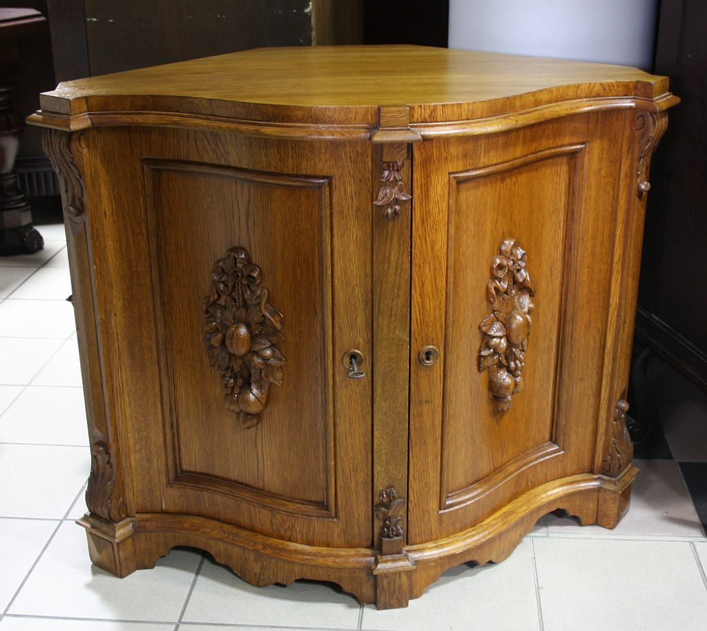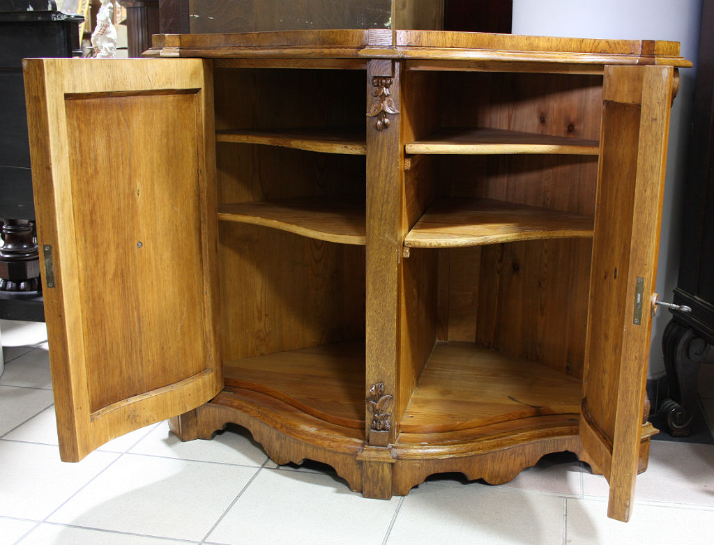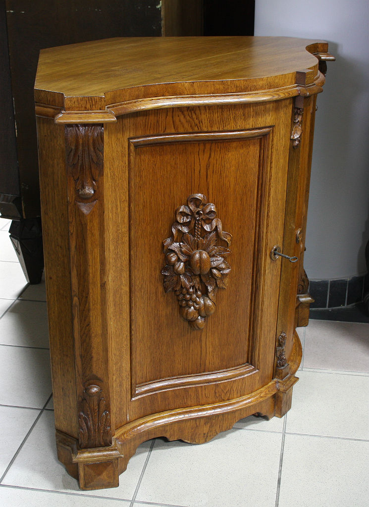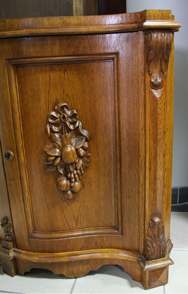 Dębowa komoda narożnikowa z giętymi drzwiami. Płyciny zdobione rzeźbionymi elementami o charakterze roślinnym, krawędzie z pilastrami. Wnętrze dwudzielne, po dwie półki w każdej z części
