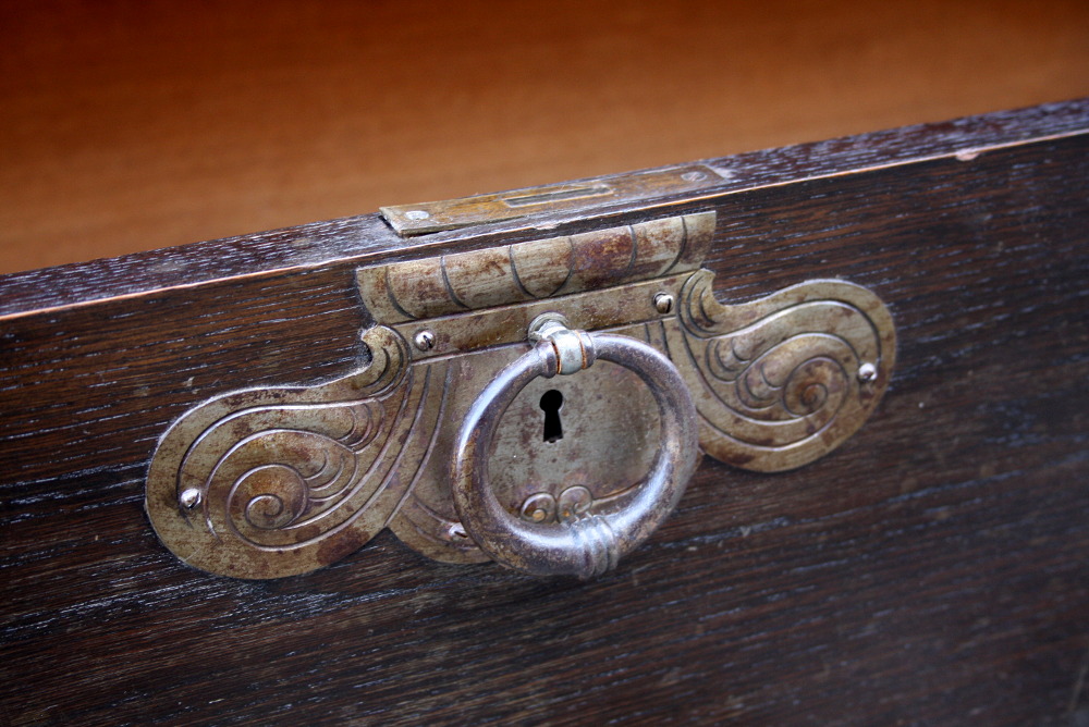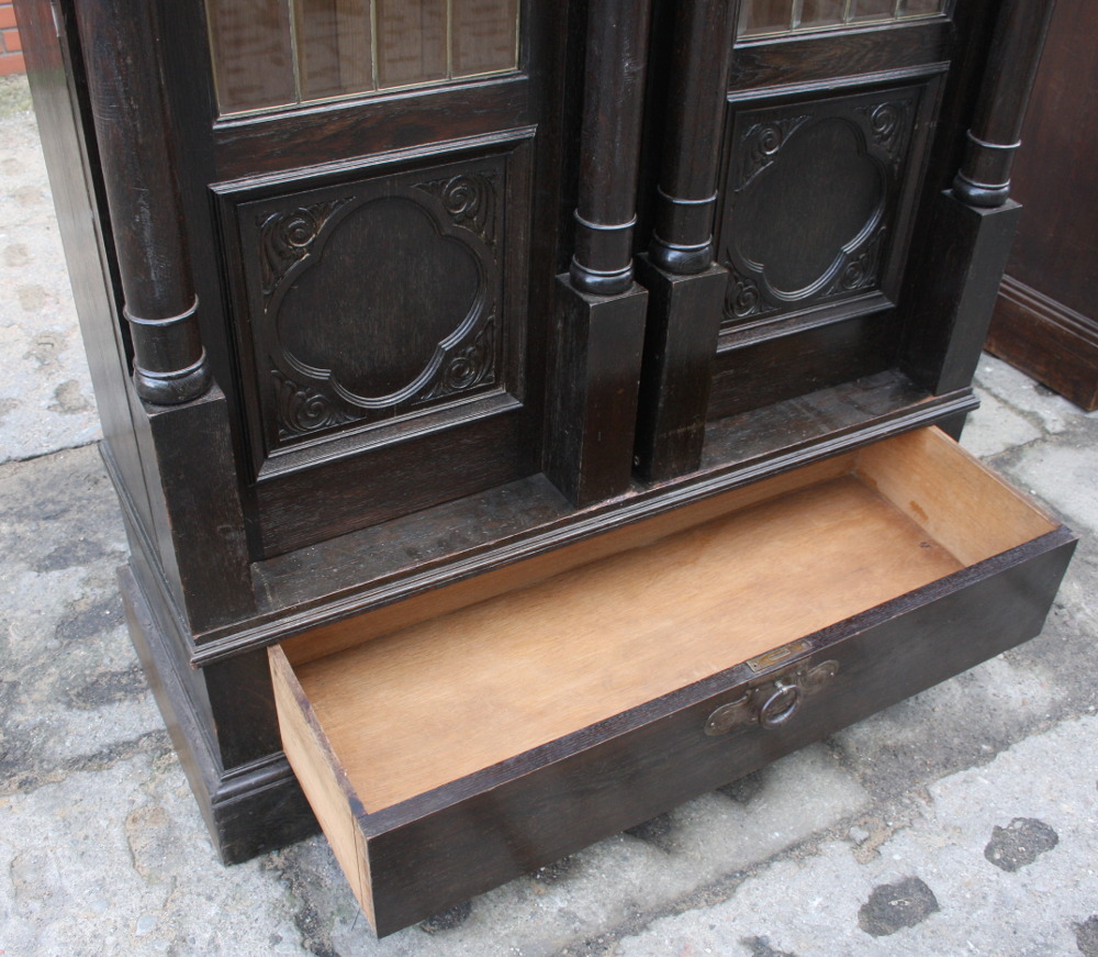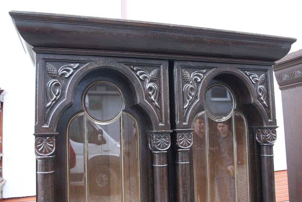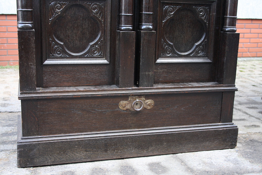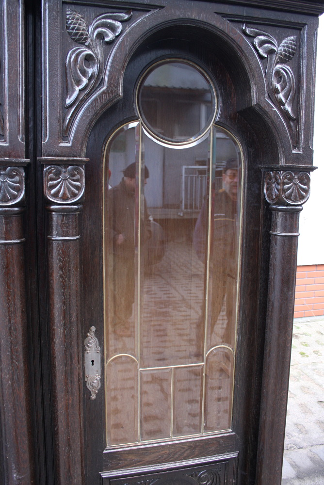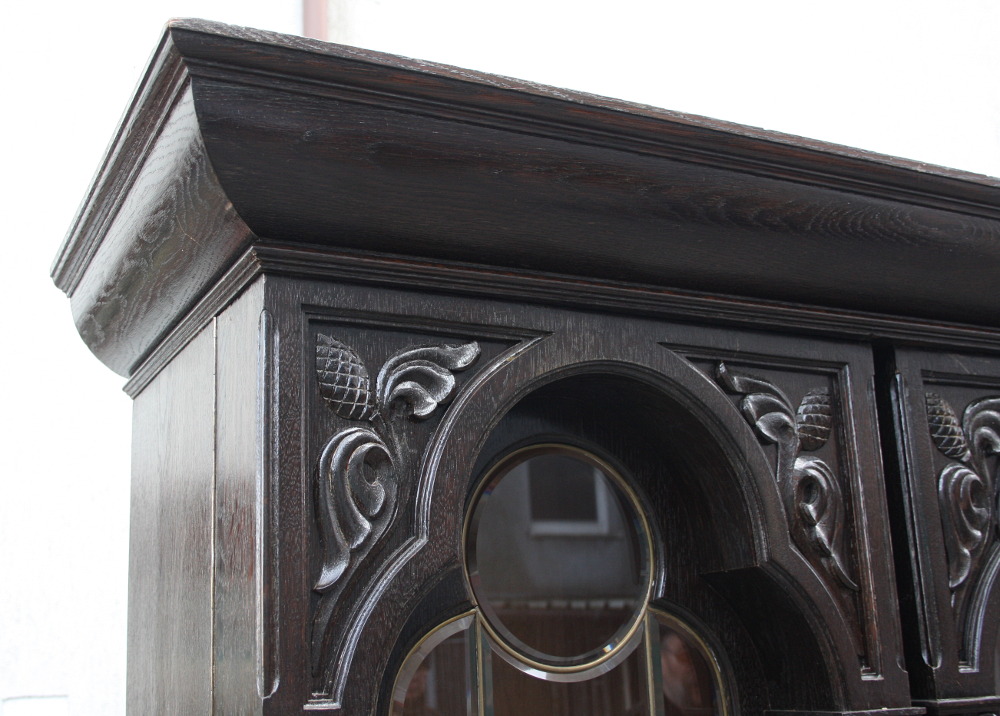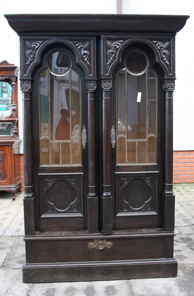 Zgrabna i urokliwa biblioteczka dębowa z początku XX wieku. Drzwi przeszklone - szkło fazowane w formie witrażu nadające meblowi wyjątkowego wyglądu. Boki w postaci kolumn oraz snycerskich zdobień. W dolnej części szuflada zamykana na klucz. Okucia oryginalne.