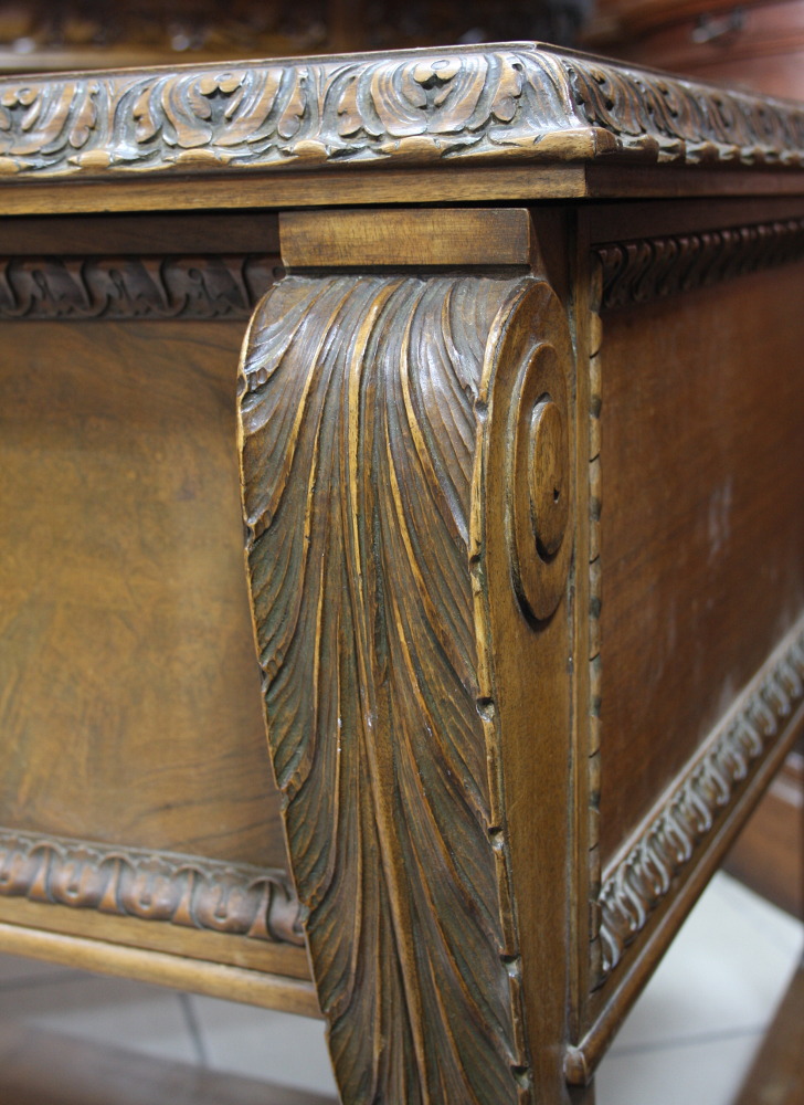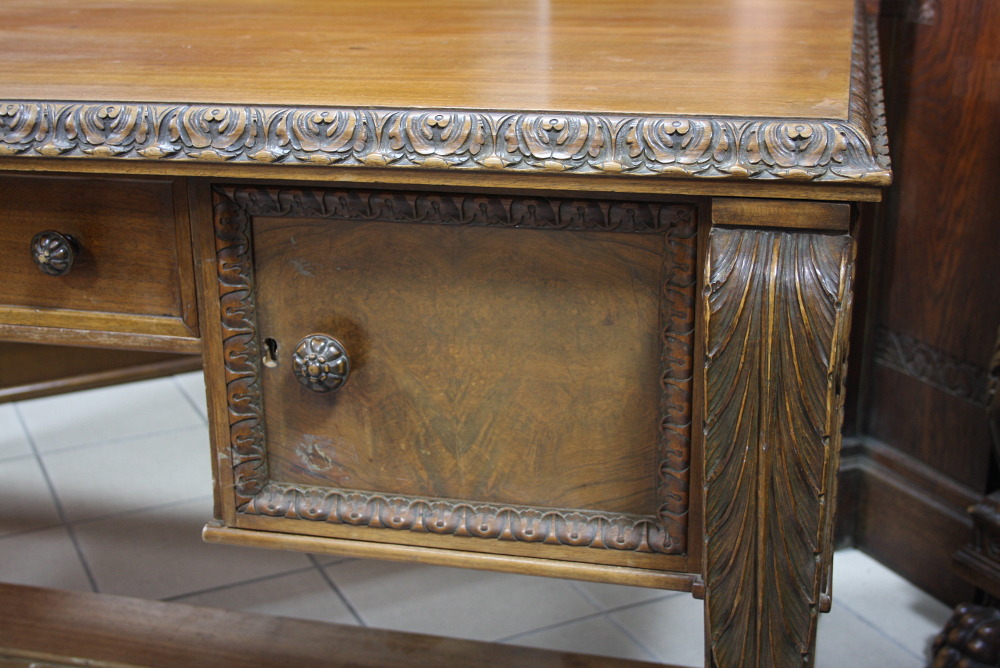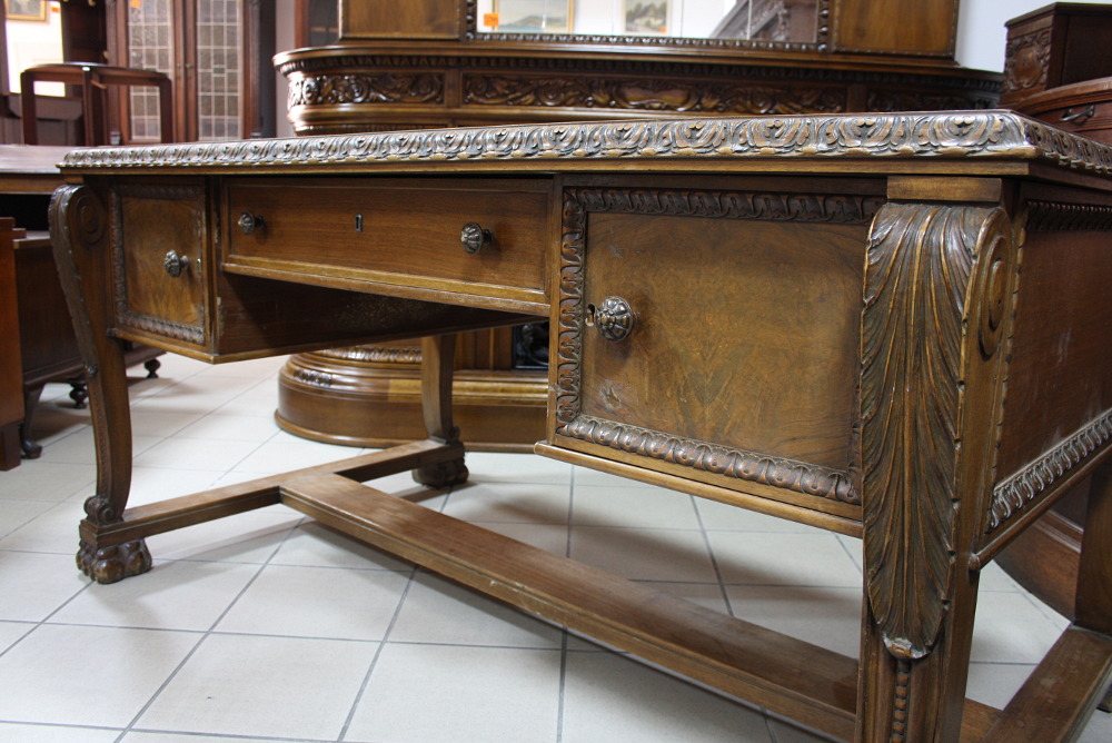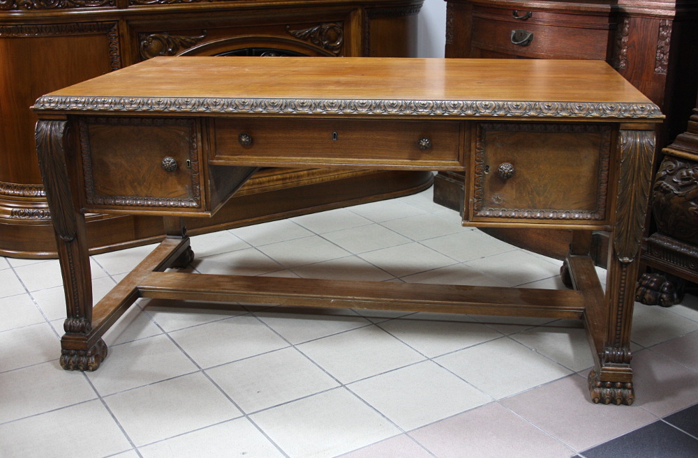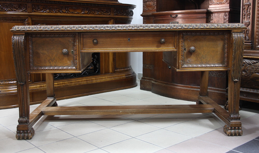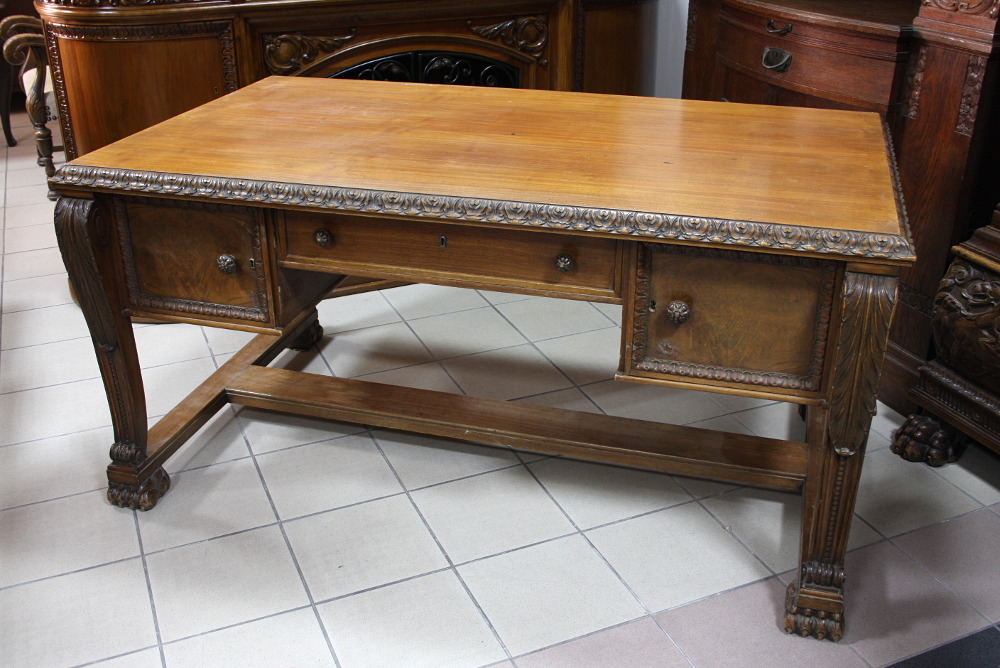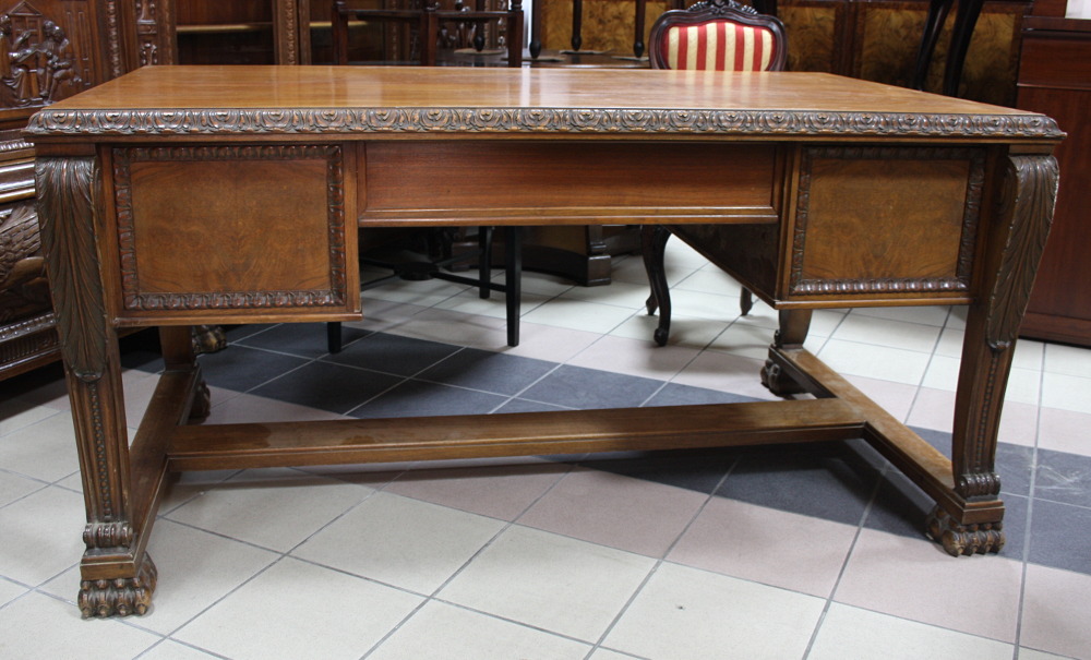 Duże, dwustronne biurko na lwich łapach. Mebel dębowy, dwie szafki z głębokimi szufladami oraz dużą, głęboką szufladą w środkowej części. Nogi zakończone lwimi łapami.