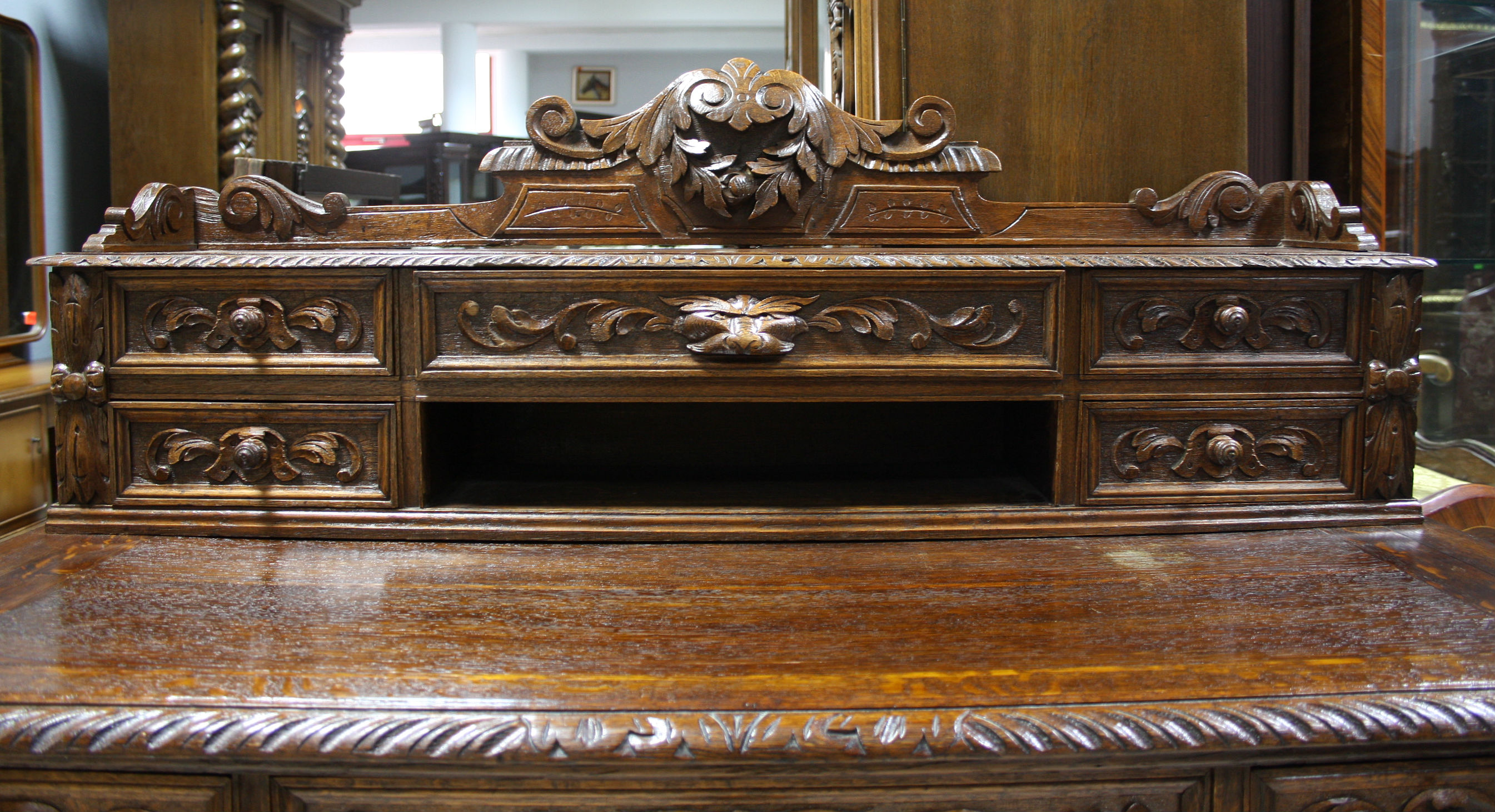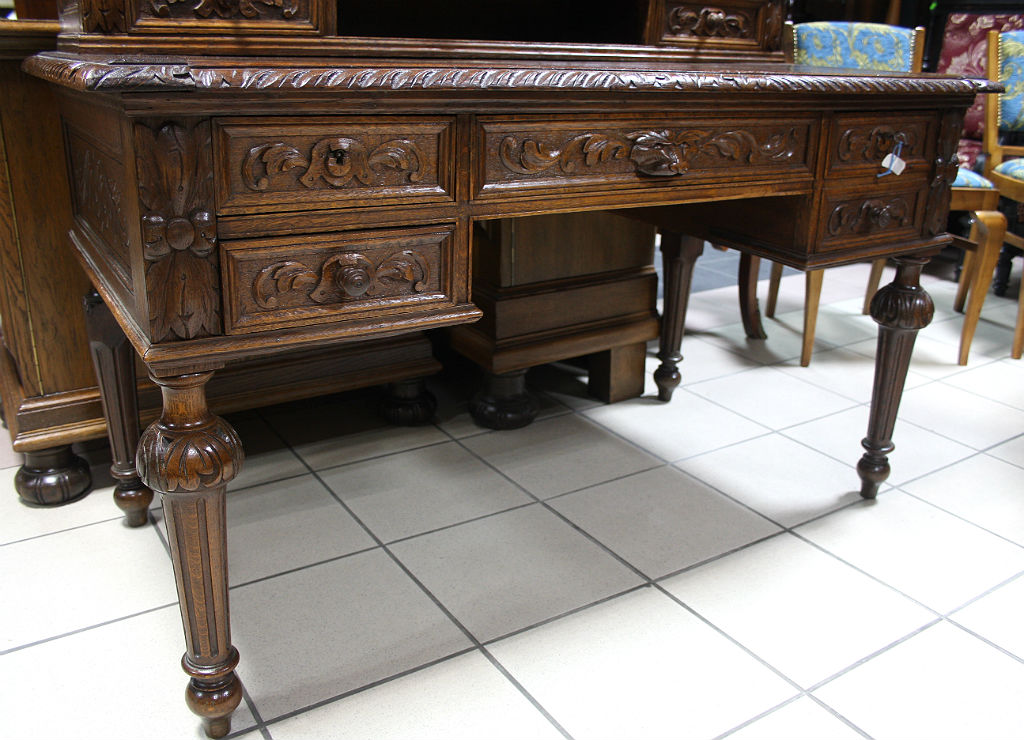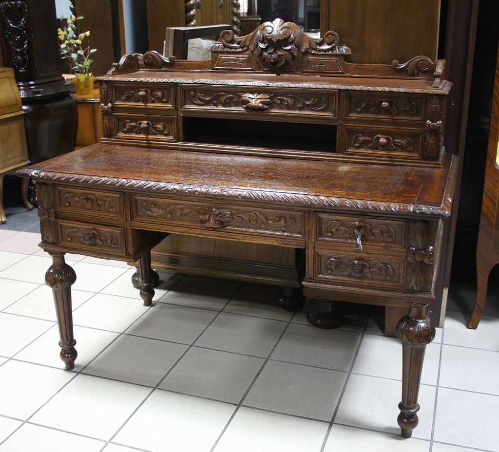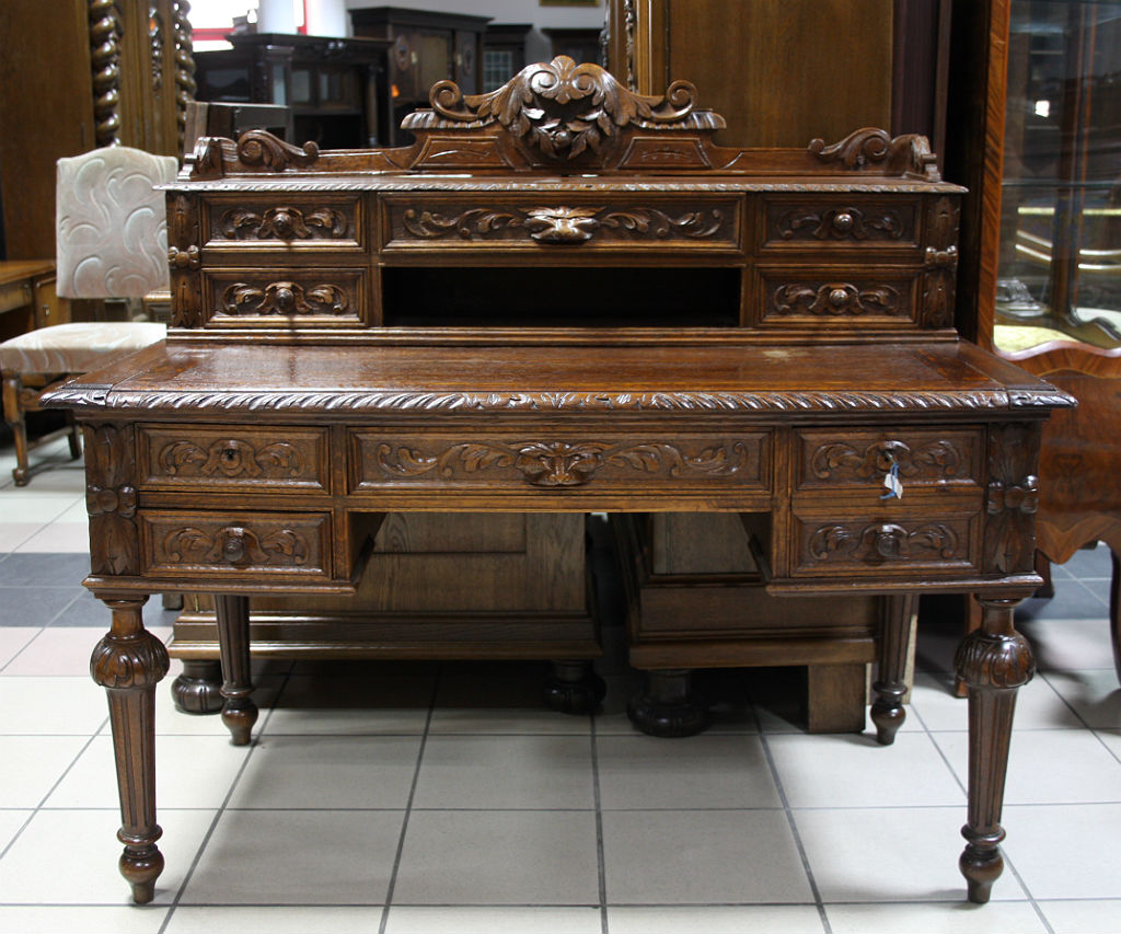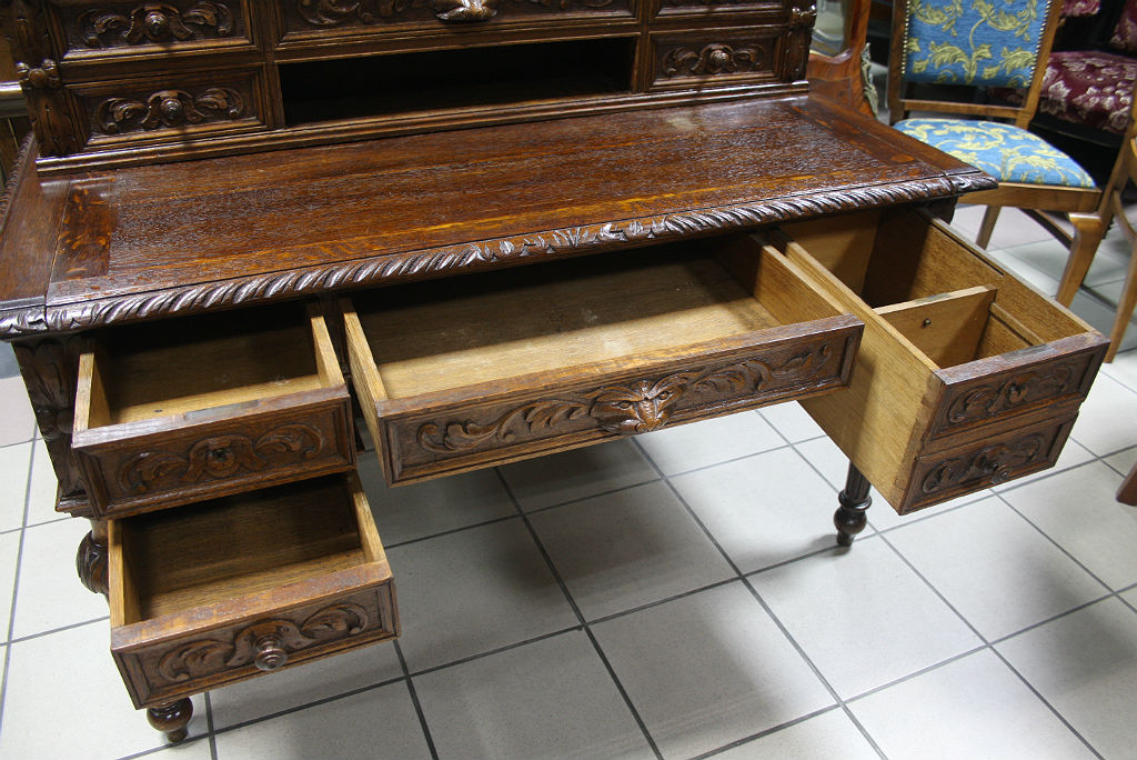 Dębowe, neorenesansowe biurko-sekretarzyk z drugiej połowy XIX wieku. Ciekawostką jest powtórzony układ szuflad w nadstawce mebla z tym, że w dolnej części z prawej strony jest jedna wysoka szuflada z frontem imitującym dwie szuflady. Blat mebla wysuwany.