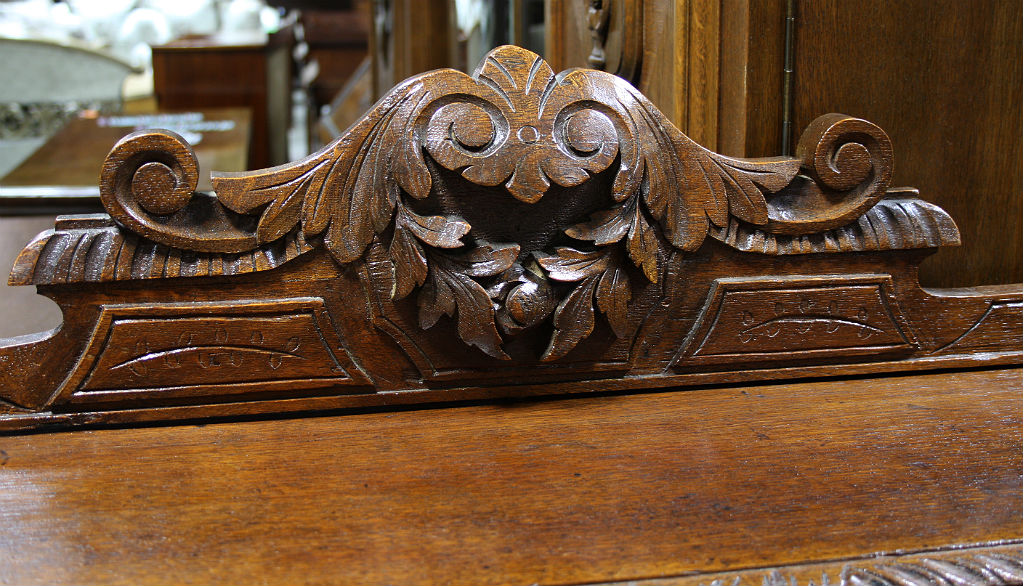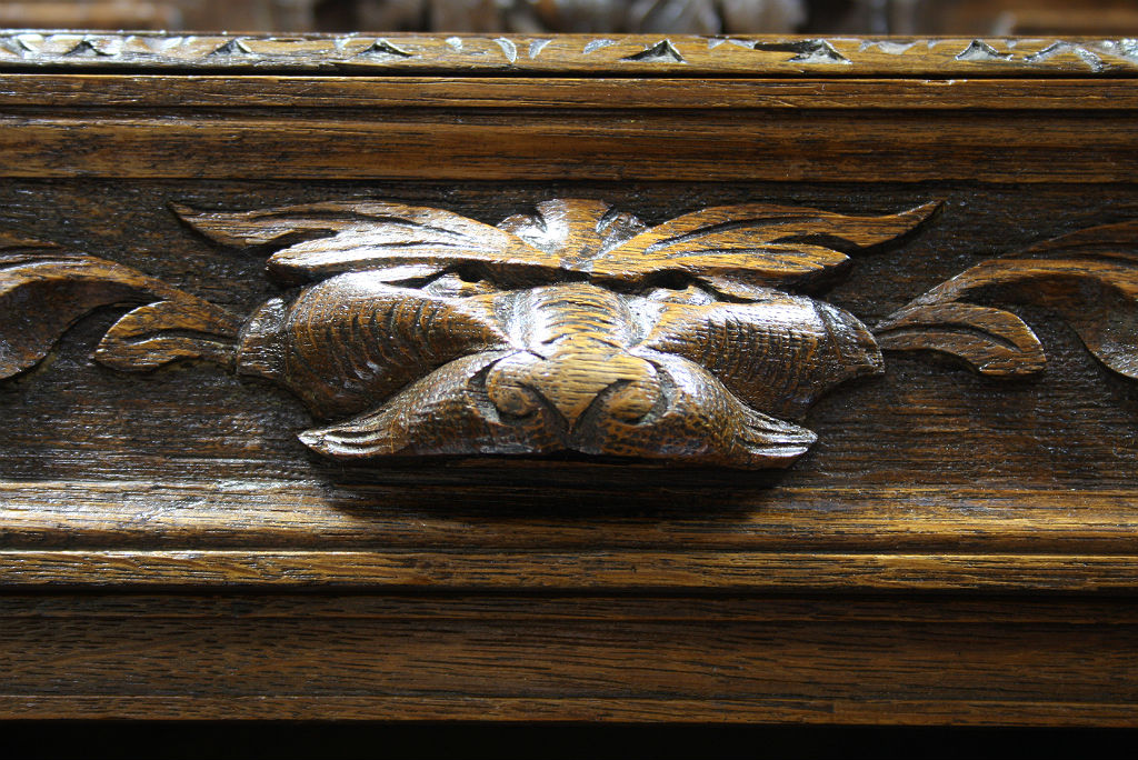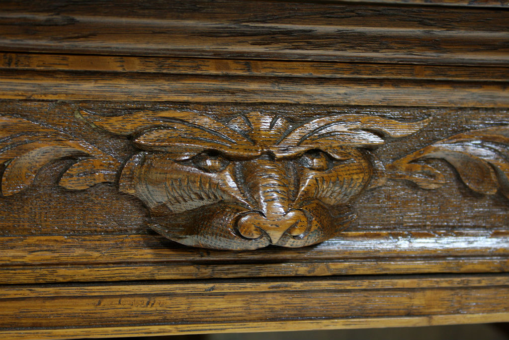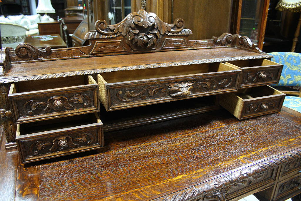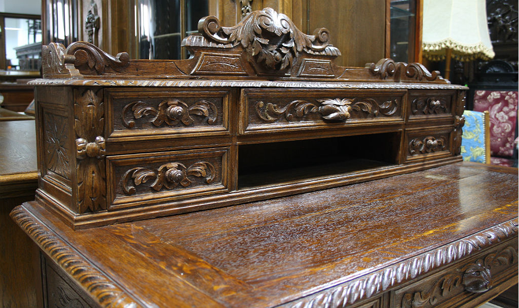 Dębowe, neorenesansowe biurko-sekretarzyk z drugiej połowy XIX wieku. Ciekawostką jest powtórzony układ szuflad w nadstawce mebla z tym, że w dolnej części z prawej strony jest jedna wysoka szuflada z frontem imitującym dwie szuflady. Blat mebla wysuwany.