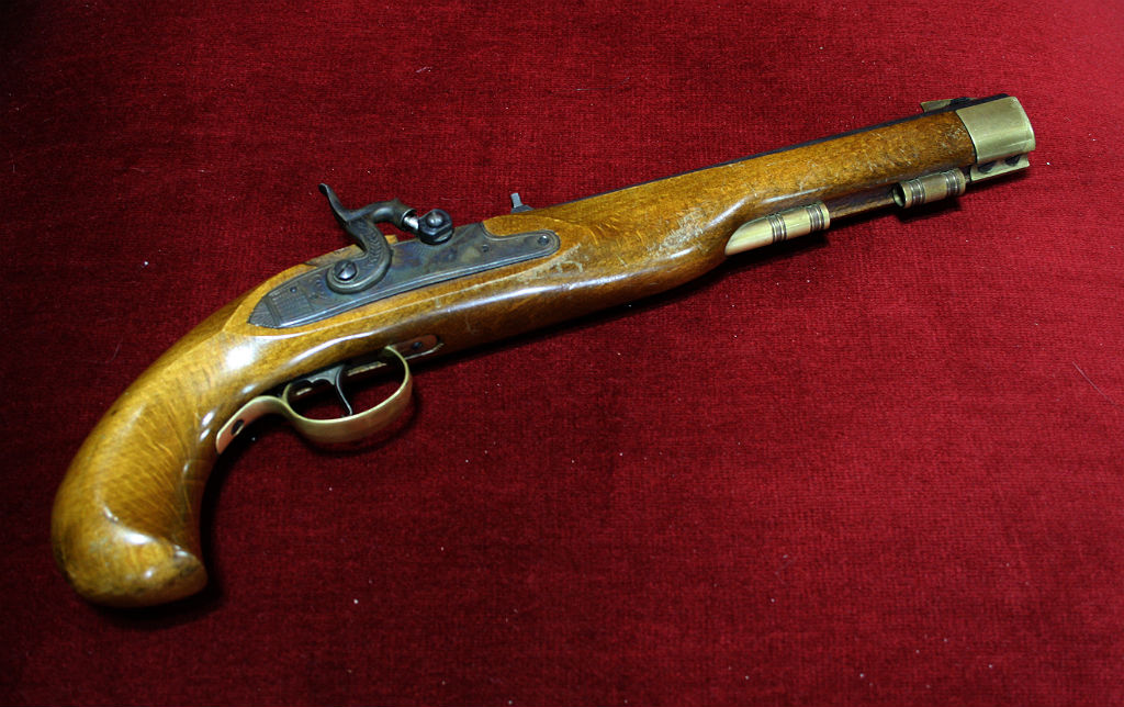 Pistolet prochowy Jukar Spain 45 cali. Przedmiot pięknie i precyzyjnie wykonany, sygnowany, z numerem seryjnym.