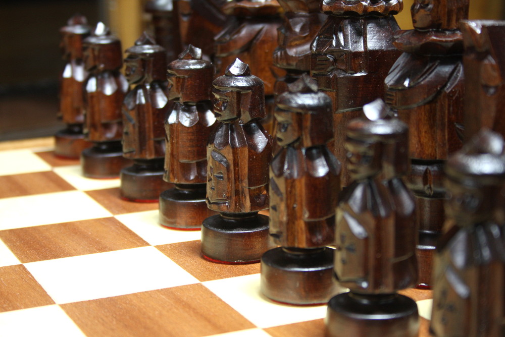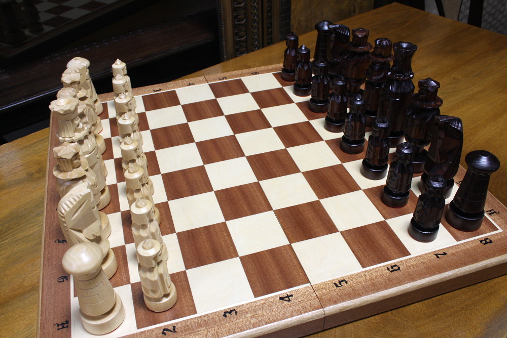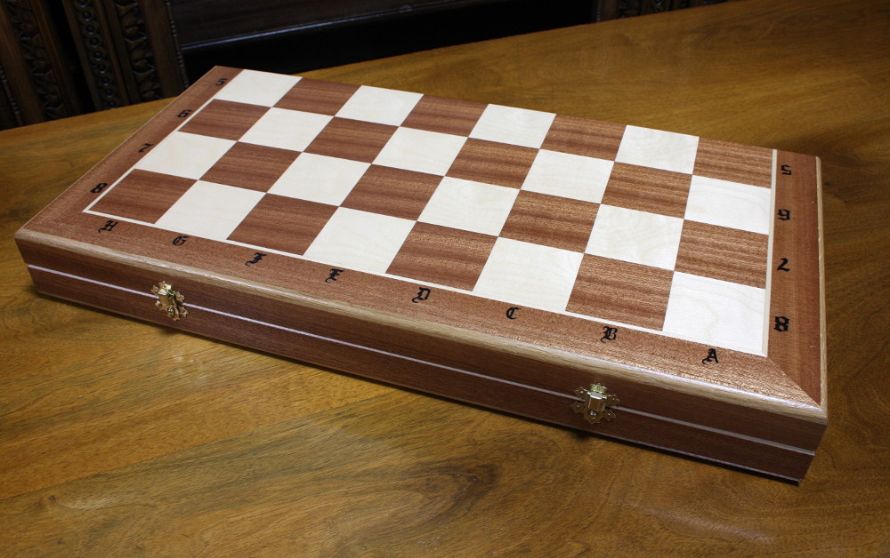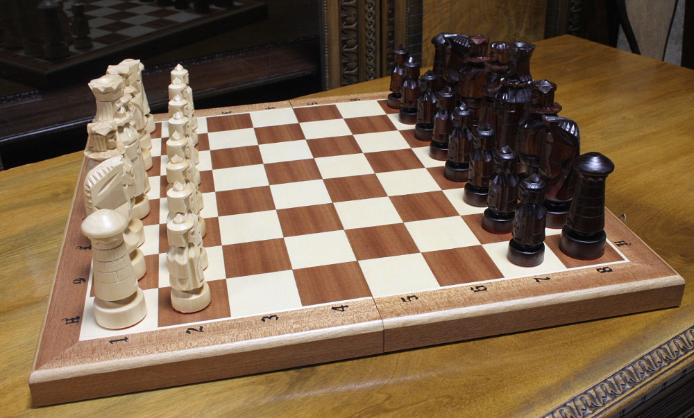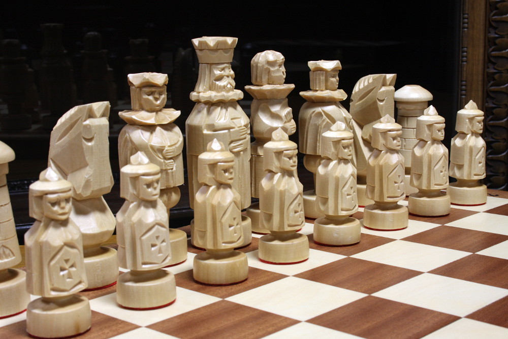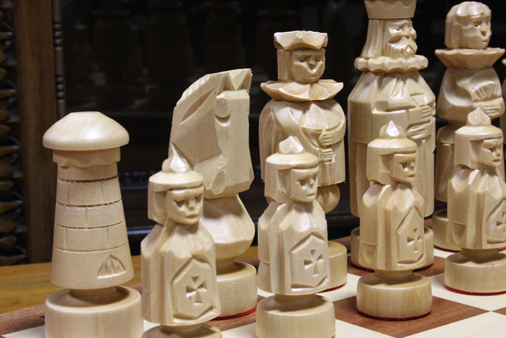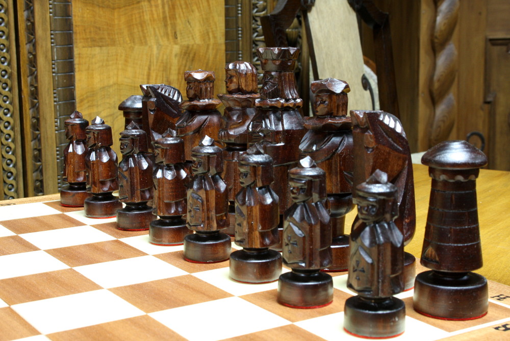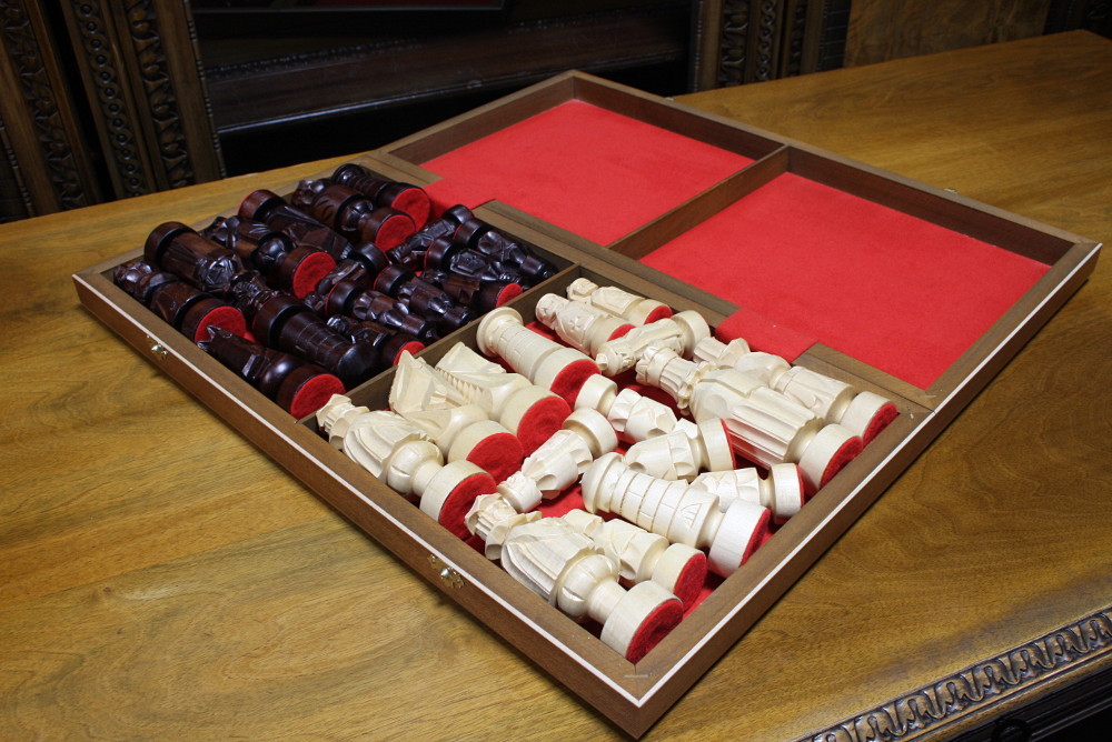 Duże, rzeźbione szachy z drewna czereśniowego. Wszystkie figury są lakierowane, ciemne dodatkowo malowane, oraz podklejone filcem i obciążone metalem. Kaseta wykonana również z drewna, malowana. Jej wnętrze wyścielone jest filcem i posiada przegrody.