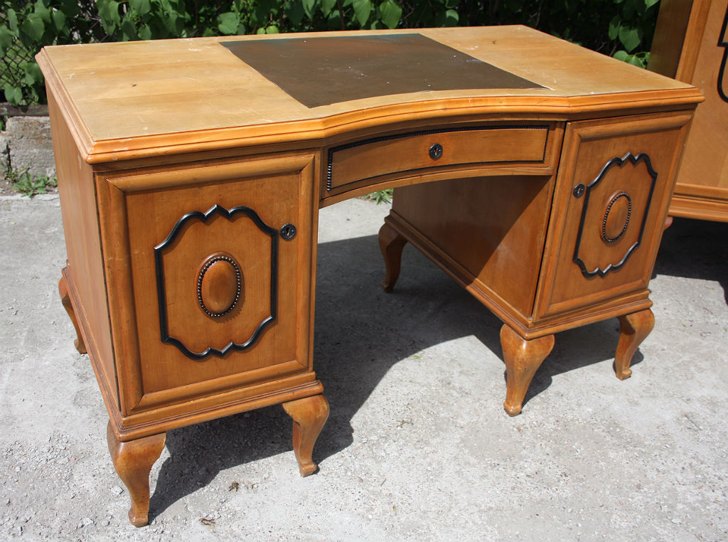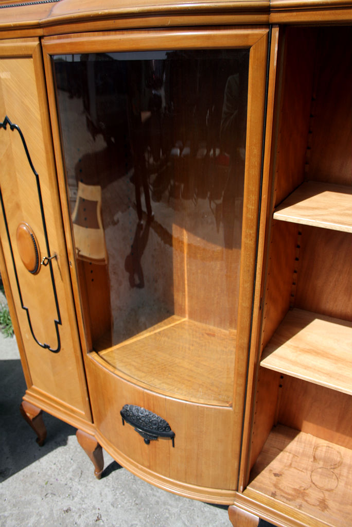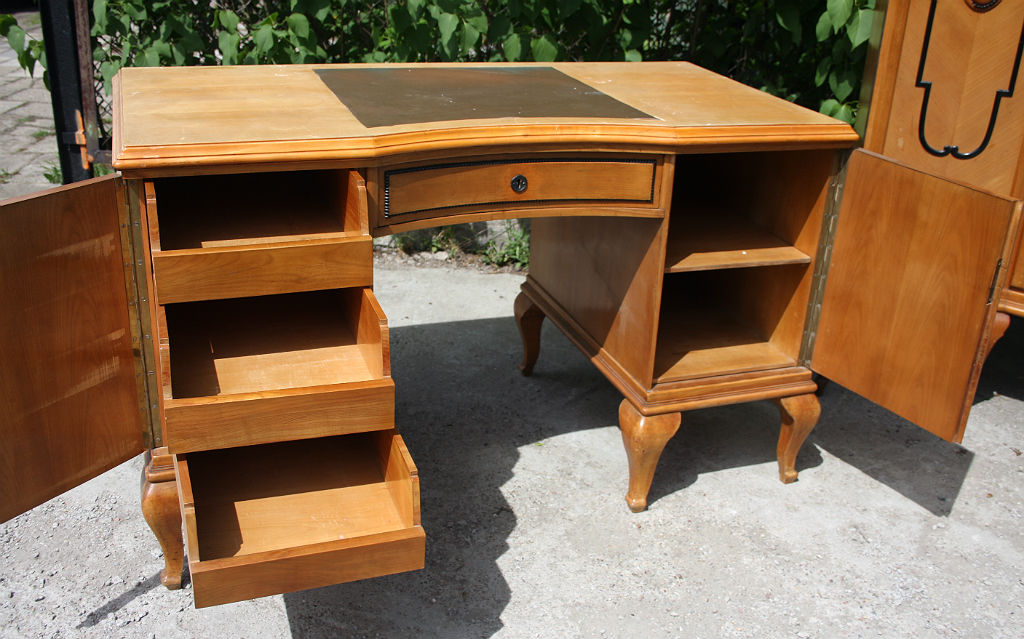Ekskluzywny damski gabinecik na giętych nogach wykonany z czereśni. Gięta, szlifowana szyba w środkowej części biblioteki. Tego typu zestawy kobiecych mebli biurowych są rzadko spotykane