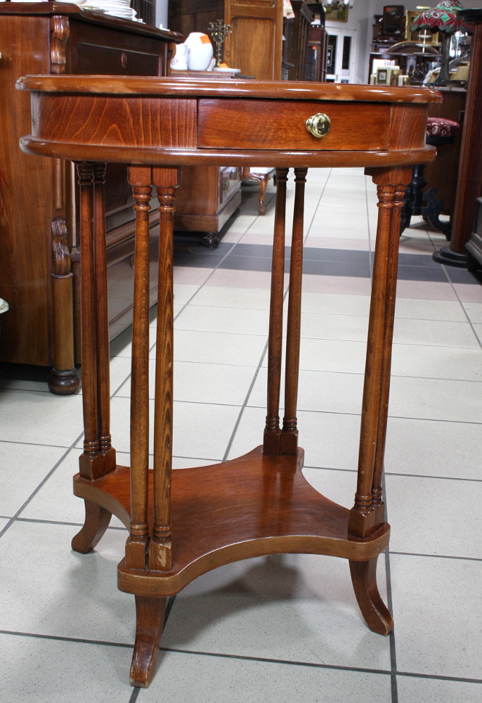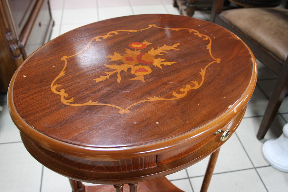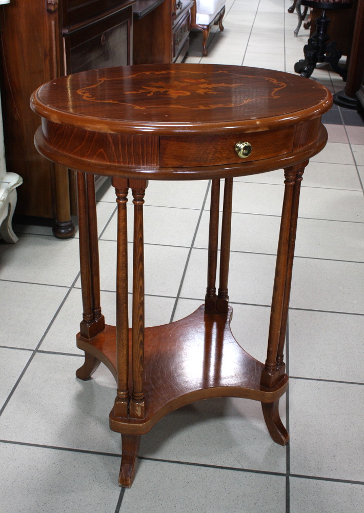 Stylizowany, orzechowy niciak. Blat zdobiony intarsją o wzorze kwiatowym, cztery nogi w postaci z par tralek osadzonych na blacie stanowiącym wzmocnienie stabilności mebla.