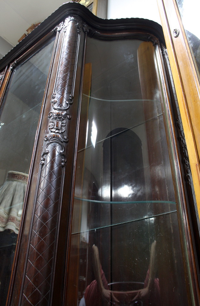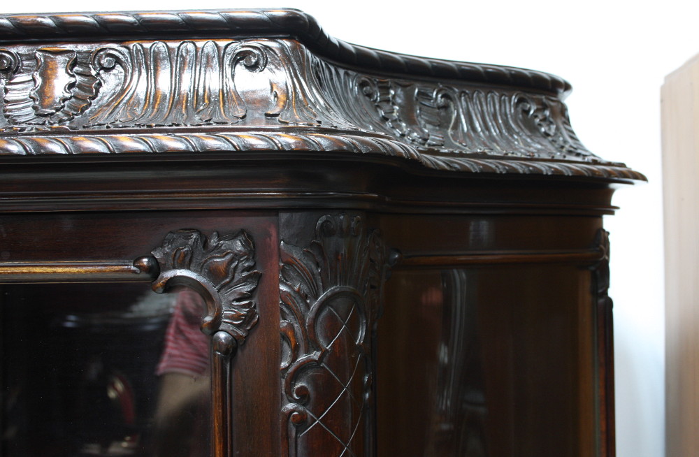 Duża i piękna serwantka w stylu chippendale. Nogi charakterystycznie profilowane, krawędzie zdobione snycerką, boczne szyby faliście gięte, półki szklane. W ofercie posiadamy również stół z okrągłym blatem (art. nr 6404), który stanowił niegdyś komplet z prezentowaną witryną - postanowiliśmy jednak wystawić te meble na sprzedaż w osobnych ofertach.