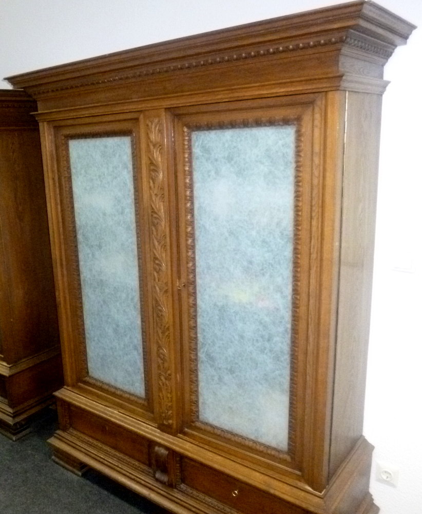 Dębowa biblioteczka z okresu międzywojennego. Szyby fazowane, w środku cztery drewniane półki, w dolnej części dwie szuflady.