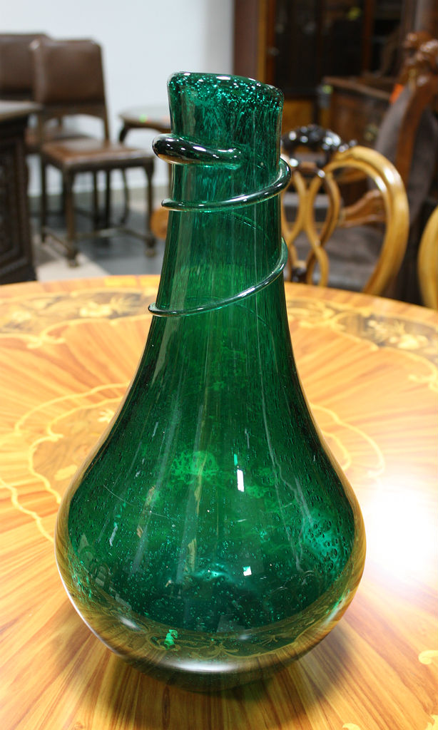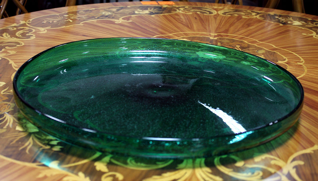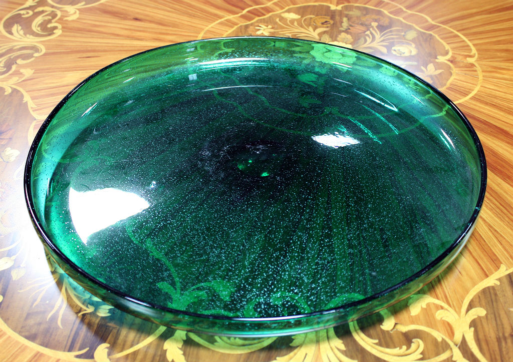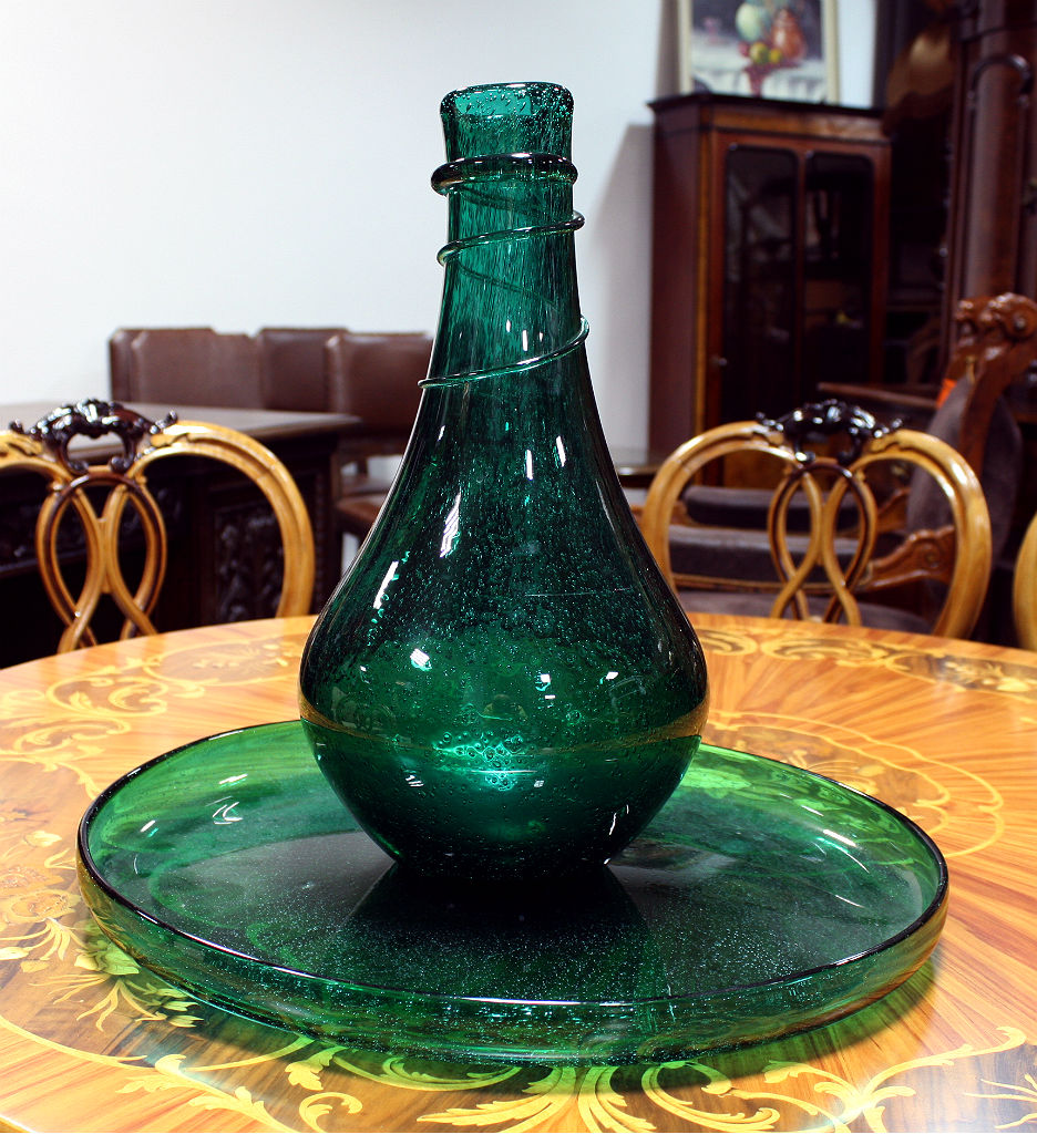 Komplet okazałych naczyń grubego, zielonego szkła w skład którego wchodzi wazon oraz taca-patera.