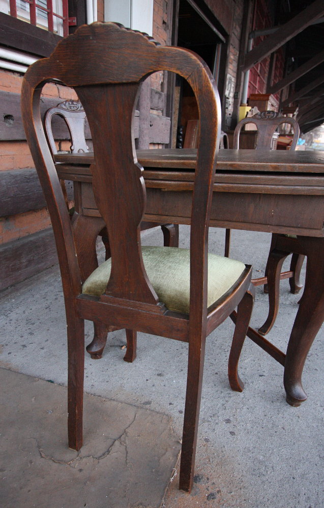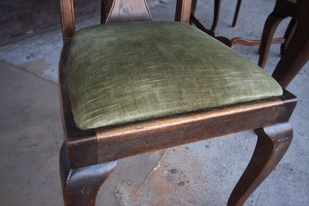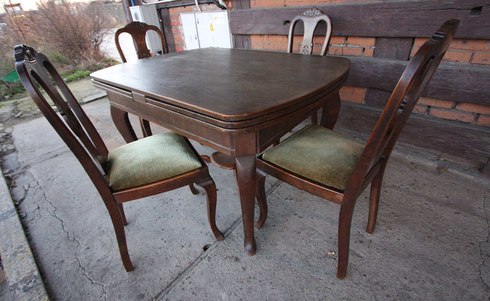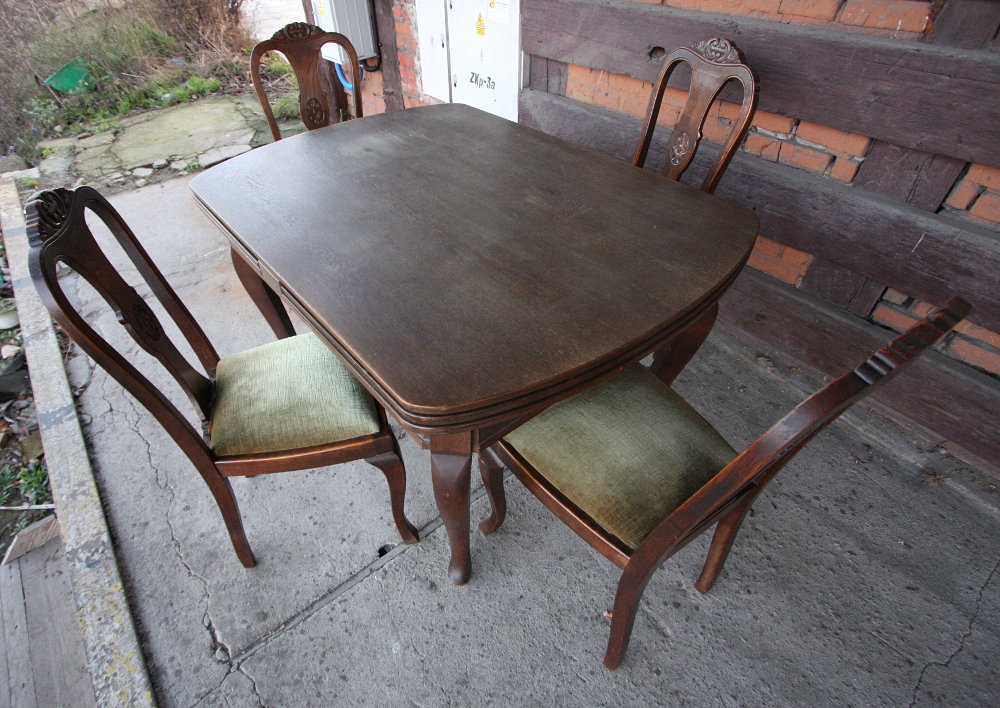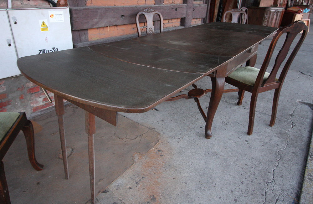Stan: ogólny przynajmniej dobry, do poprawki bądź wymiany fornir na głównym blacie stołu. Tapicerka krzeseł bez uszkodzeń