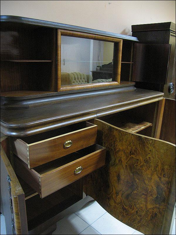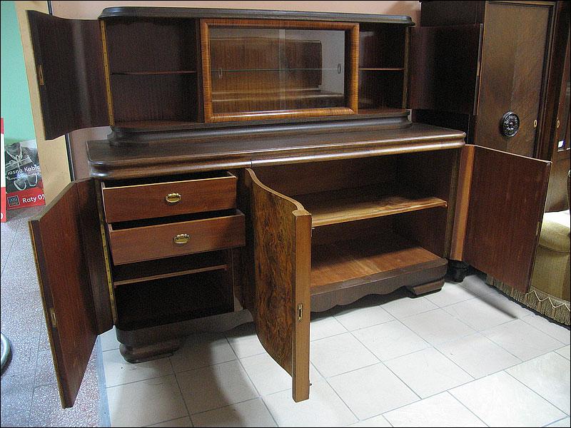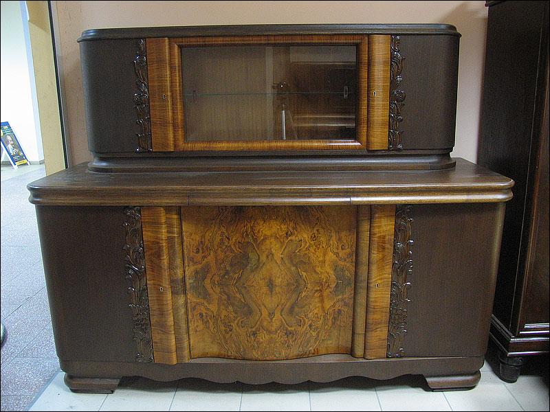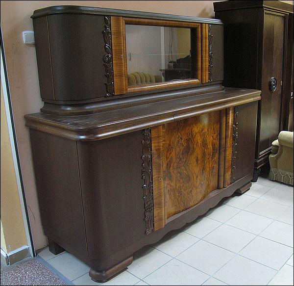 Dębowy kredens art deco z lat trzydziestych. Zdobiony orzechowymi wstawkami. Na dolnych drzwiach czeczota.