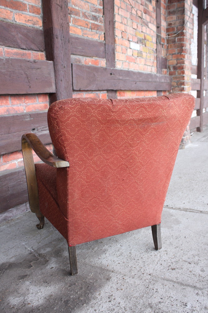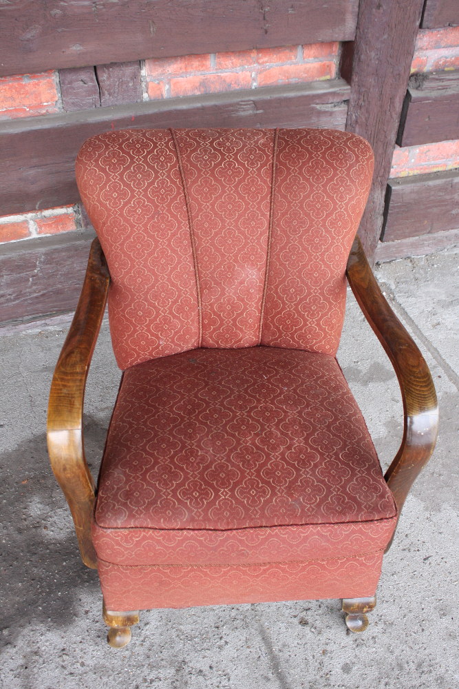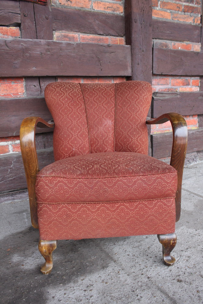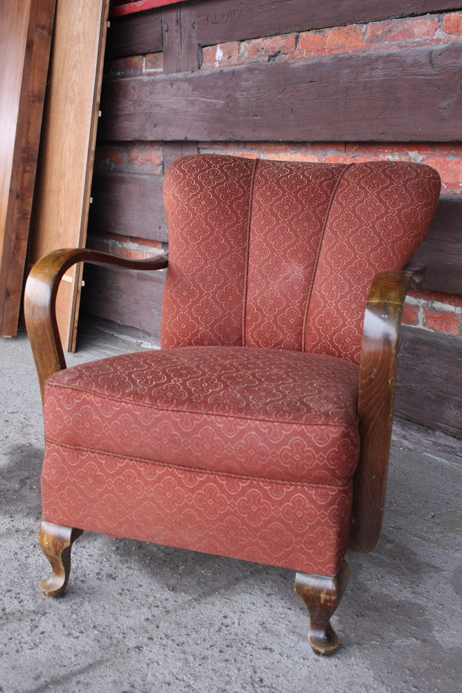 Fotel w stylu art deco. Stelaż dębowy, charakterystyczny dla stylu. Mebel duży i wygodny.