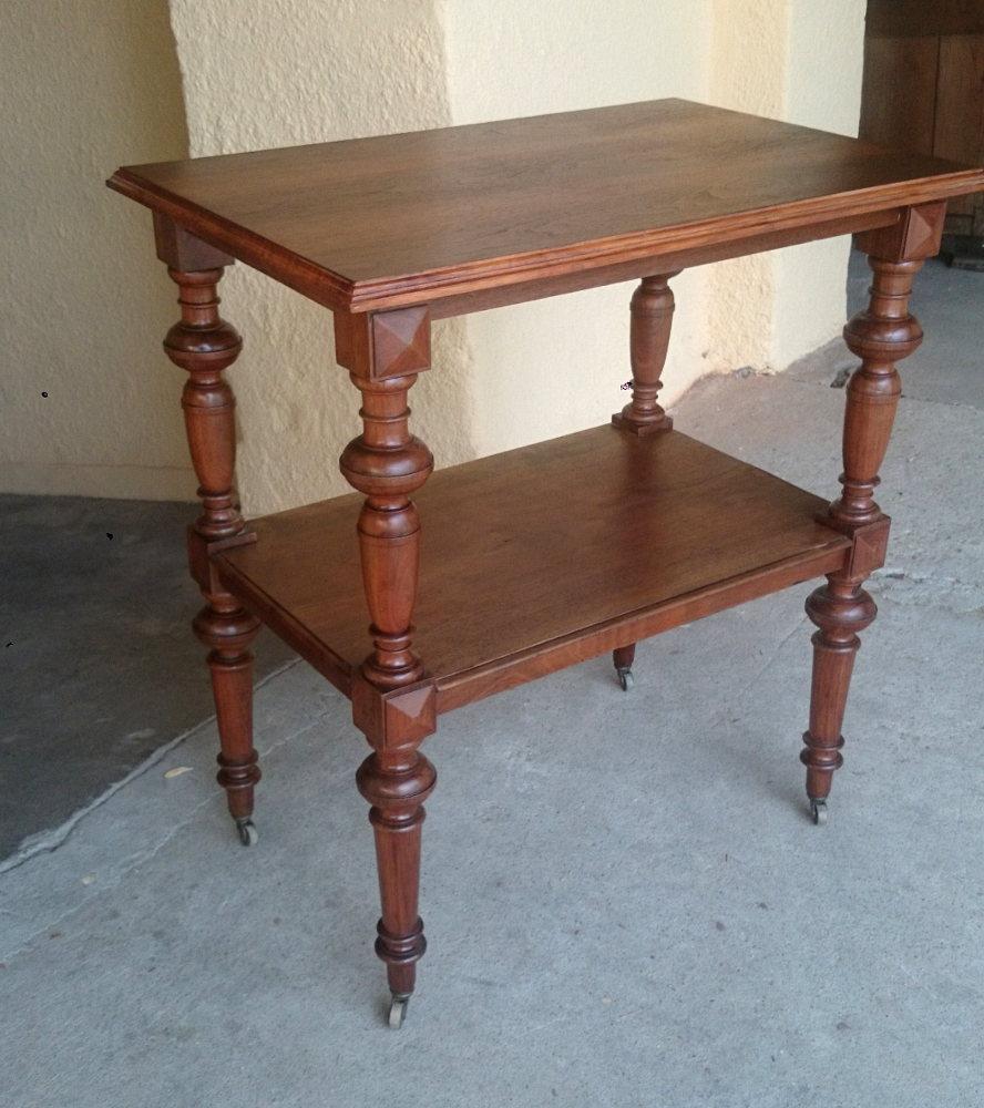 Orzechowy stolik w stylu eklektycznym. Nogi zakończone kółkami, drugi, podnoszący funkcjonalność mebla, blat w połowie wysokości.