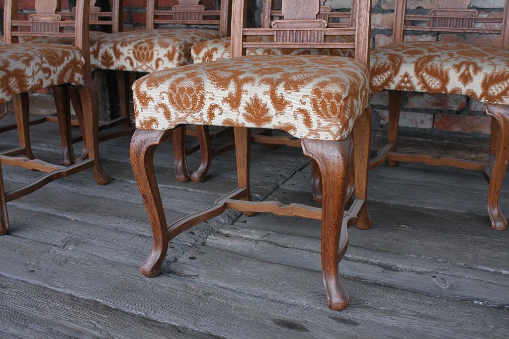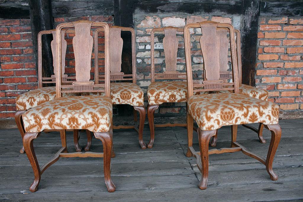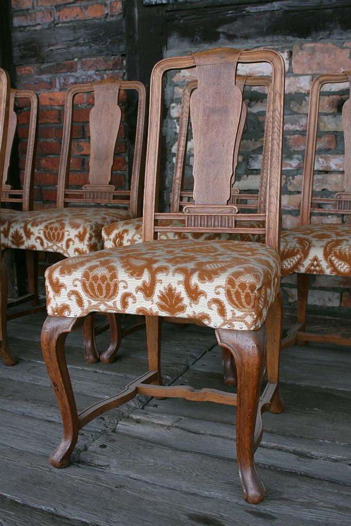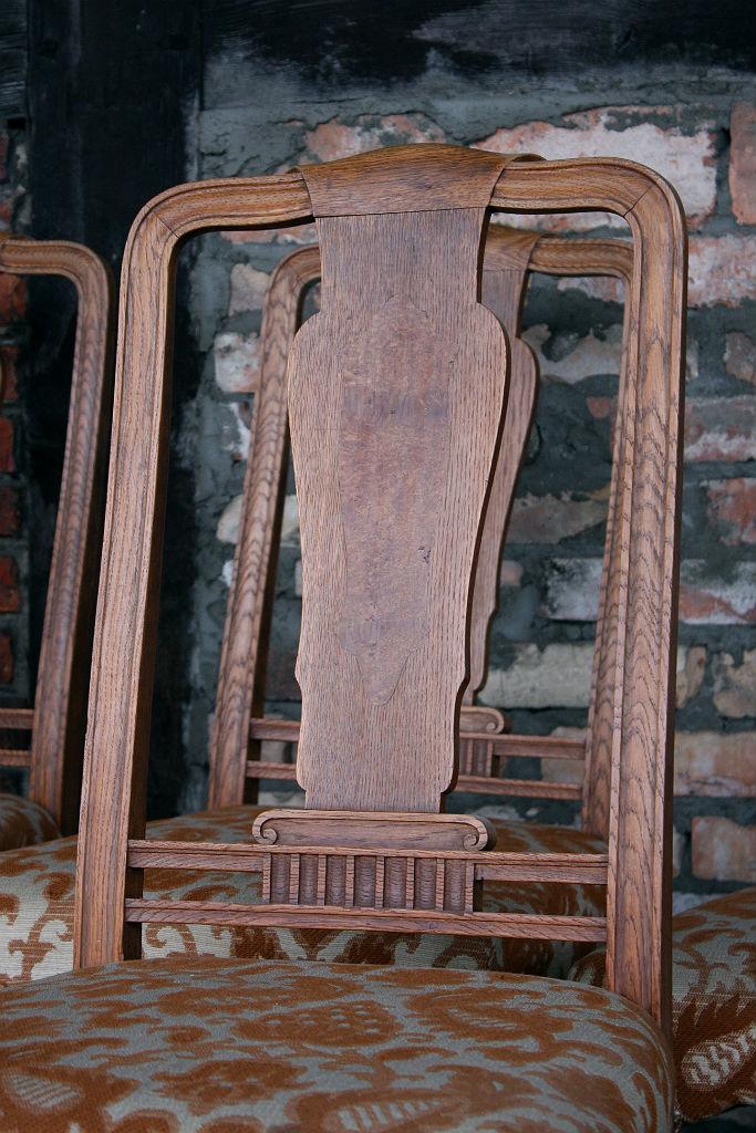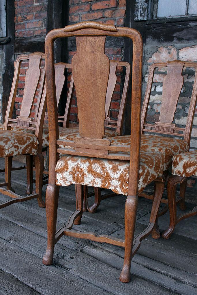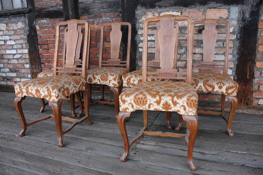 Komplet 6 dębowych krzeseł w stylu chippendale. Stelaż stabilny, nogi złączone poprzeczkami.