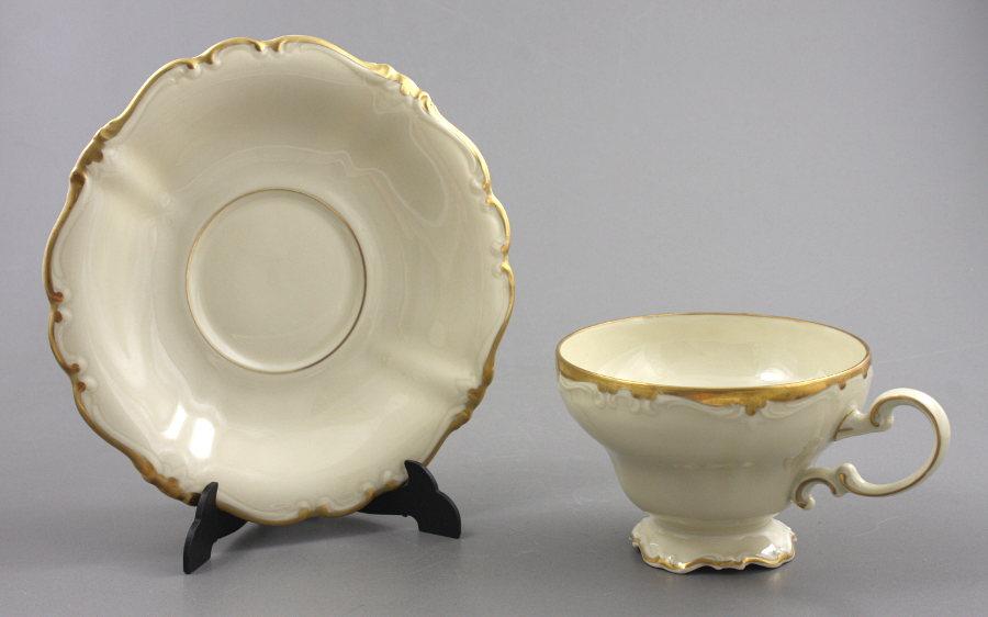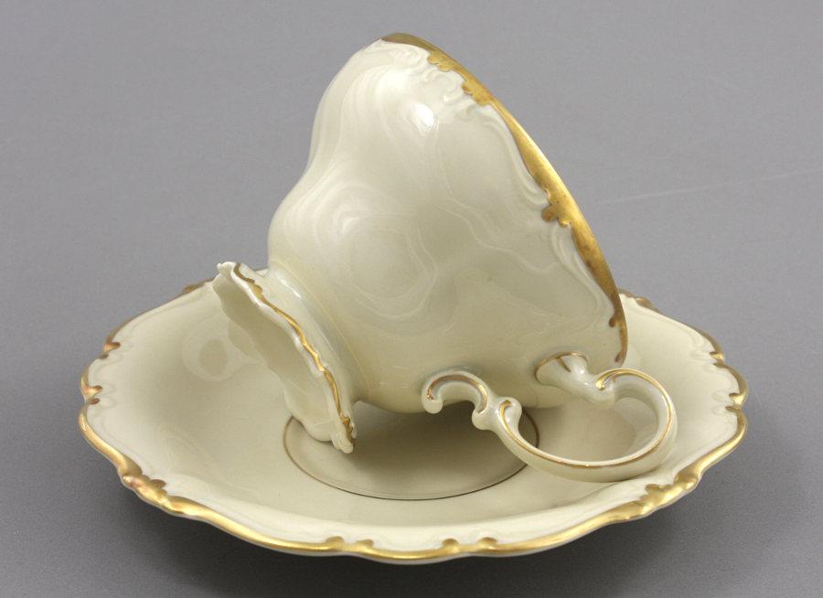Duża filiżanka Rosenthal Pompadour. Porcelana w kolorze ecru z szerokim złoceniem krawędzi. Sygnowana znakami z lat 30-tych XX wieku.