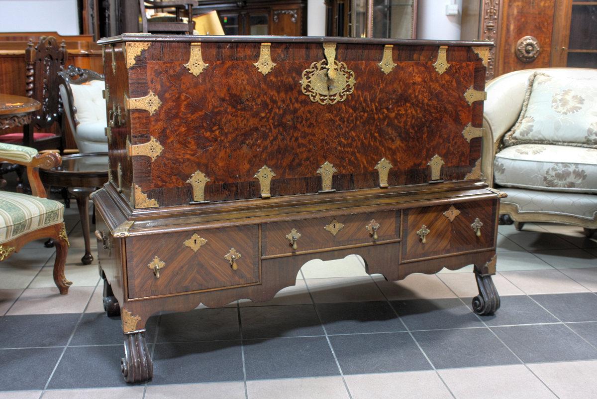 Kufer/Skrzynia na czterech nogach, frontowa ścianka z okuciami otwierana, w wewnętrznej części znajduje się lustro. Na bokach znajdują się uchwyty (po 2 z każdej strony), w dolnej części 3 szuflady zamykane na klucz.