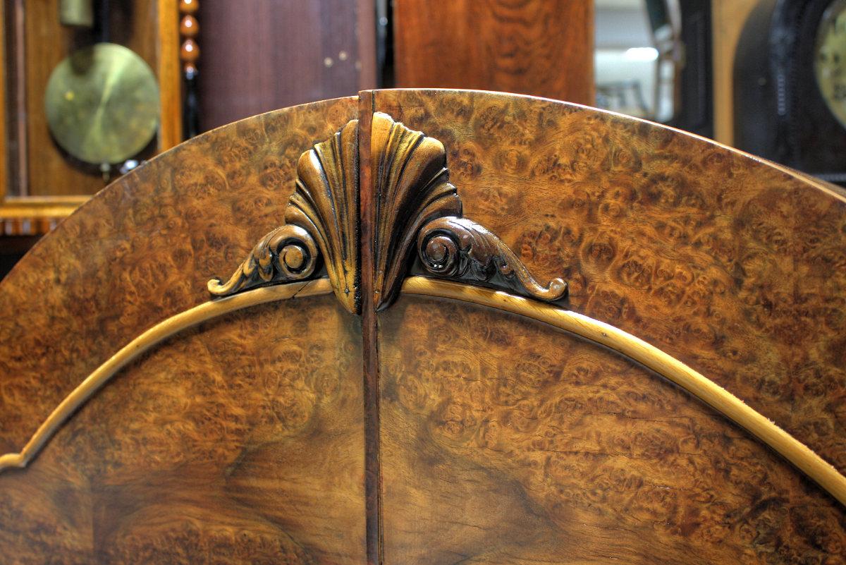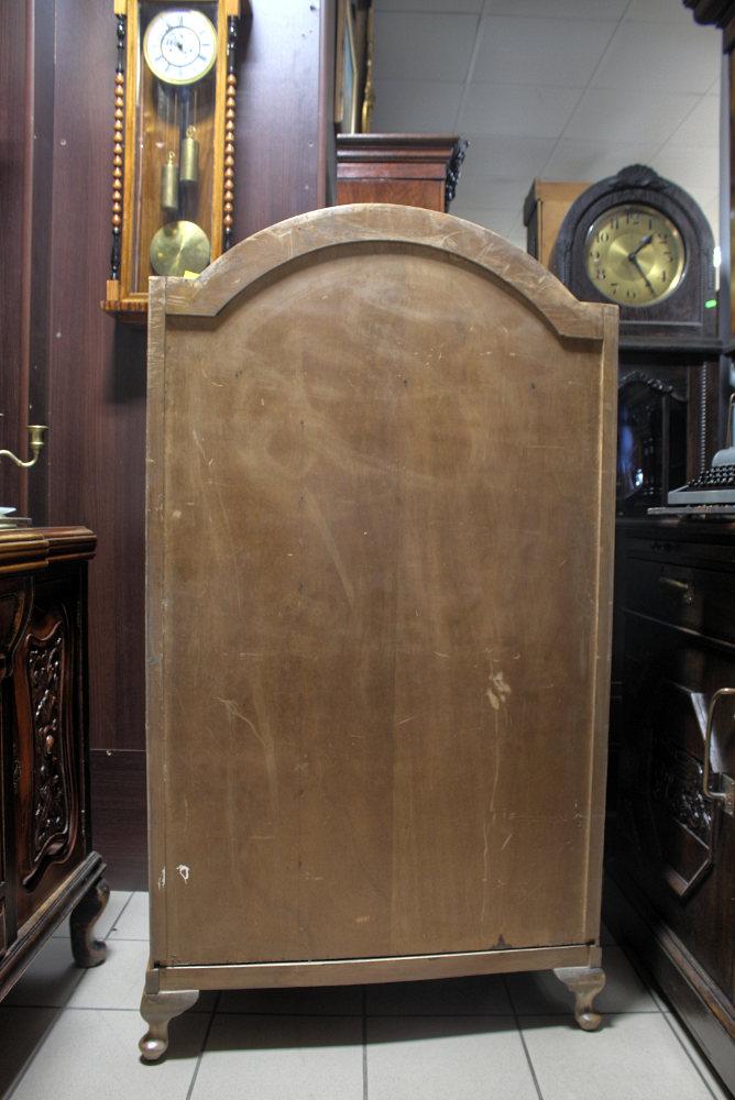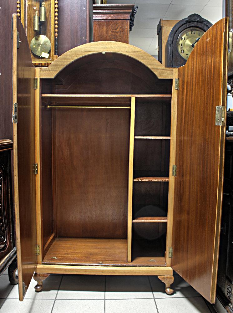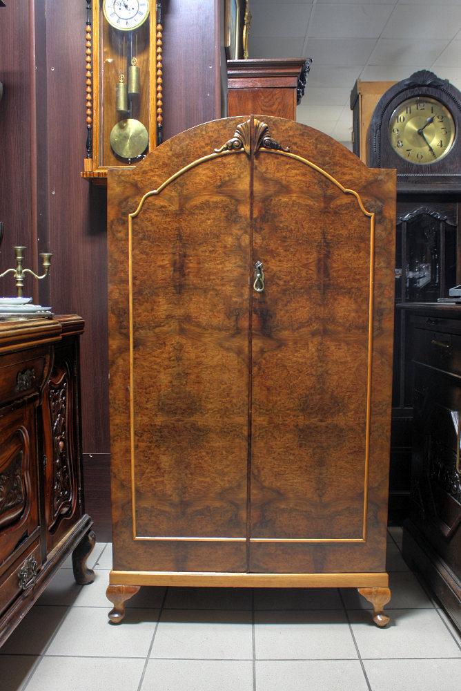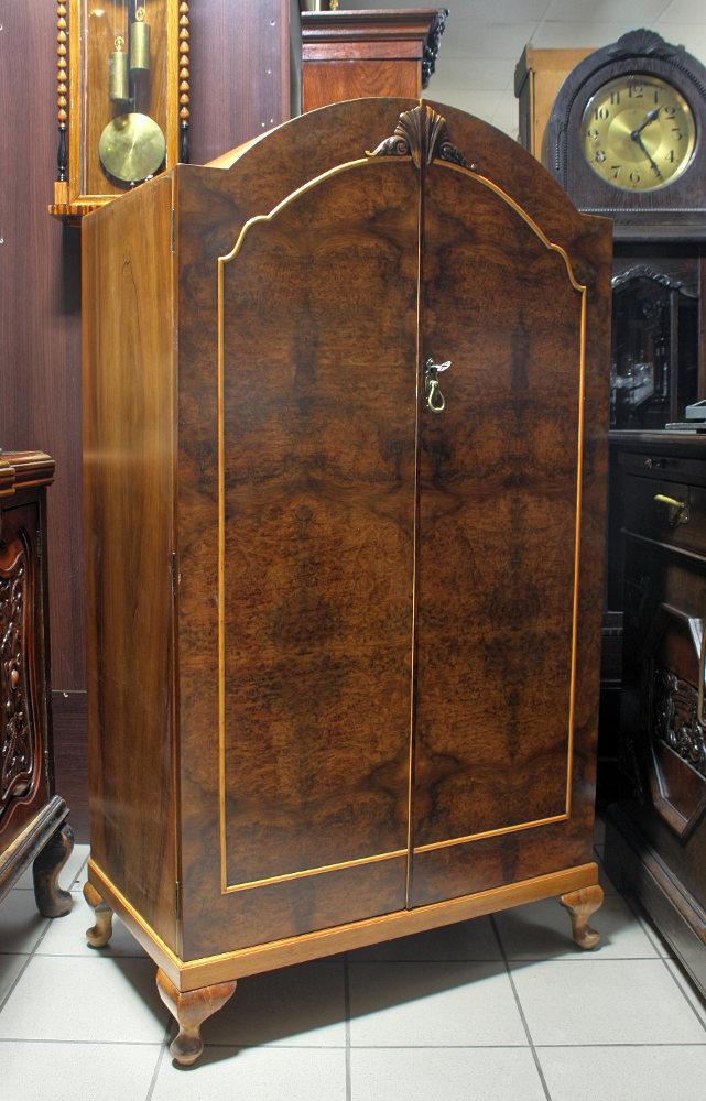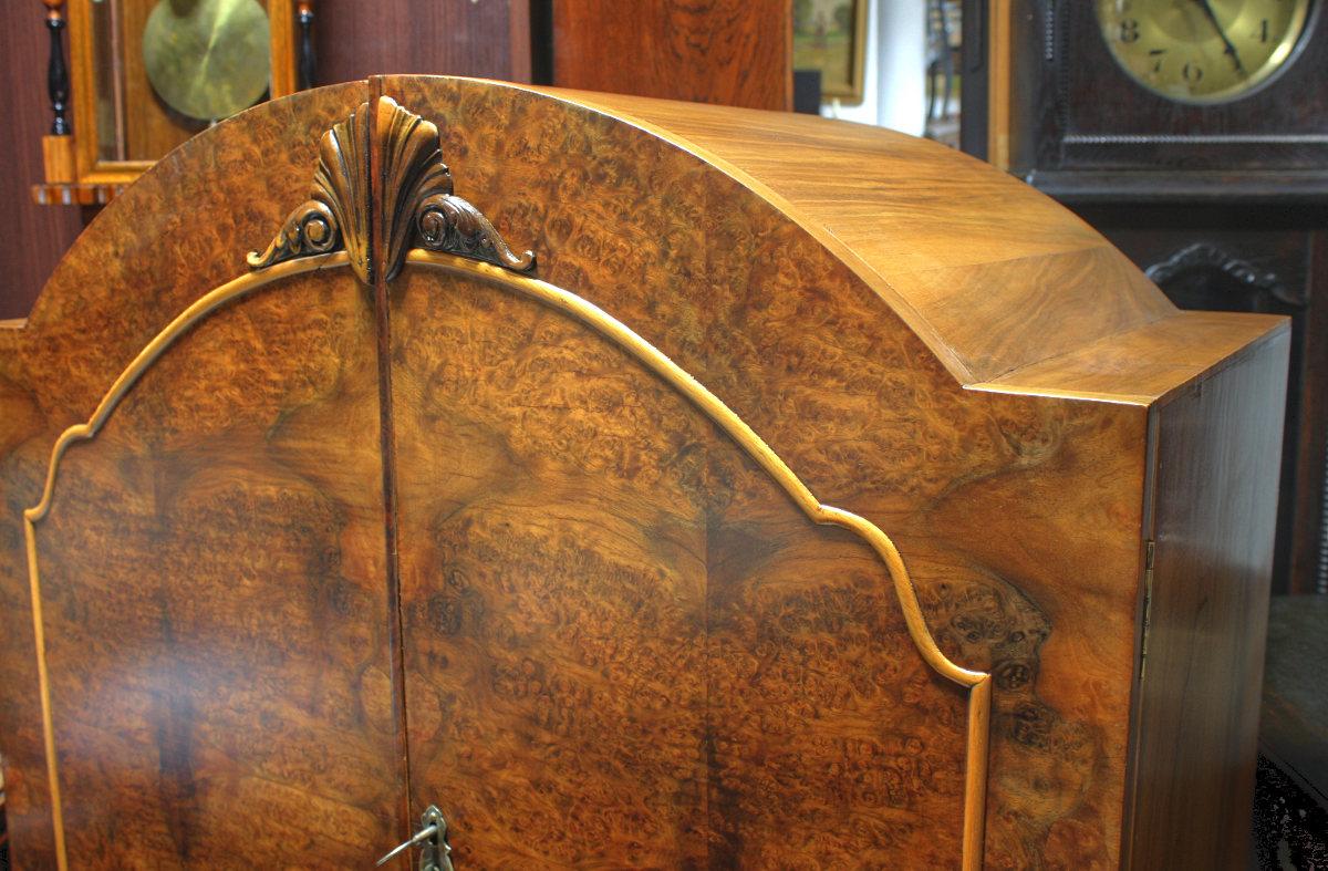Niewielka, orzechowa szafa Art Deco. Frontowa część zdobiona pięknym rysunkiem czeczoty oraz snycerską aplikacją. Nóżki małe, filigranowe.