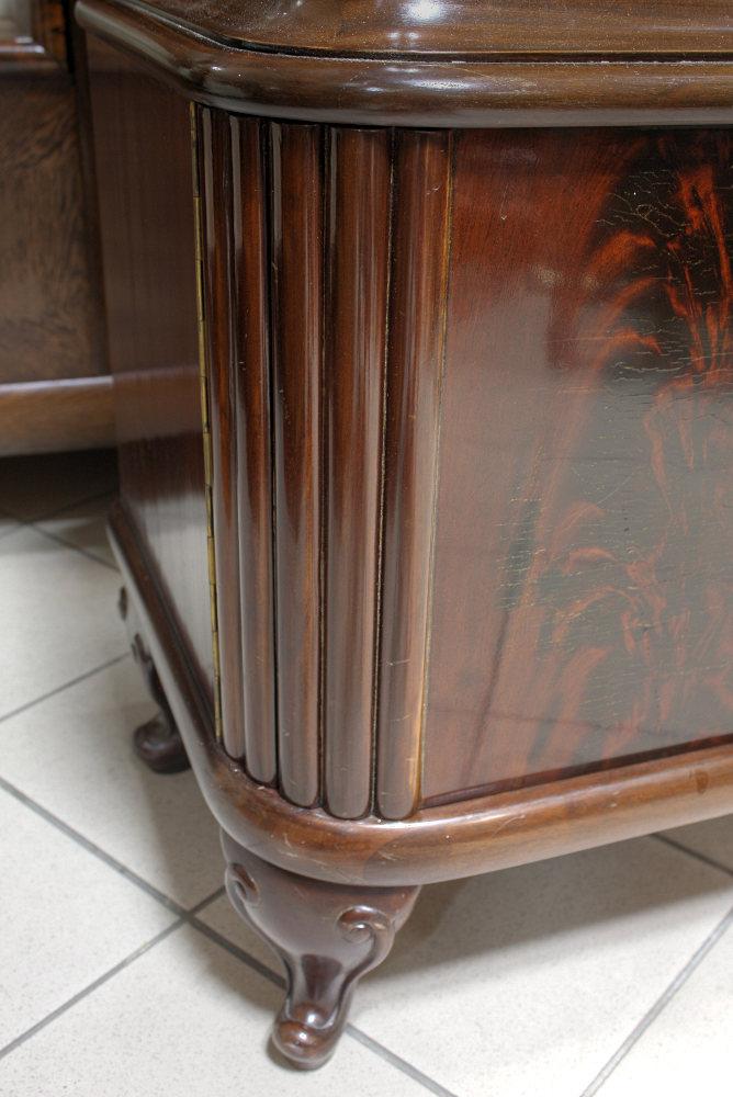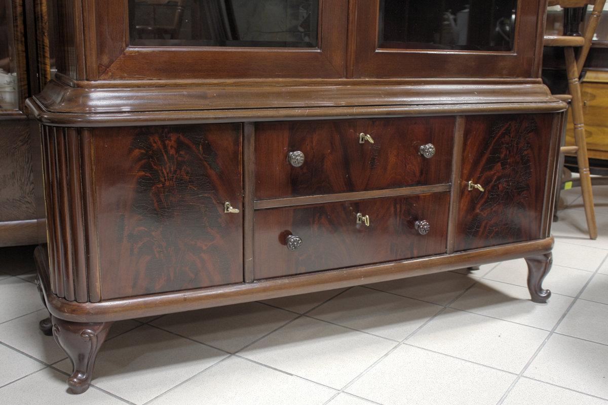 Dwuczęściowa mahoniowa biblioteczka. Dolna część z dwoma szufladami zamykanymi na klucz oraz dwoma szafkami. Część ekspozycyjna z grubymi, drewnianymi półkami. Szyby fazowane.