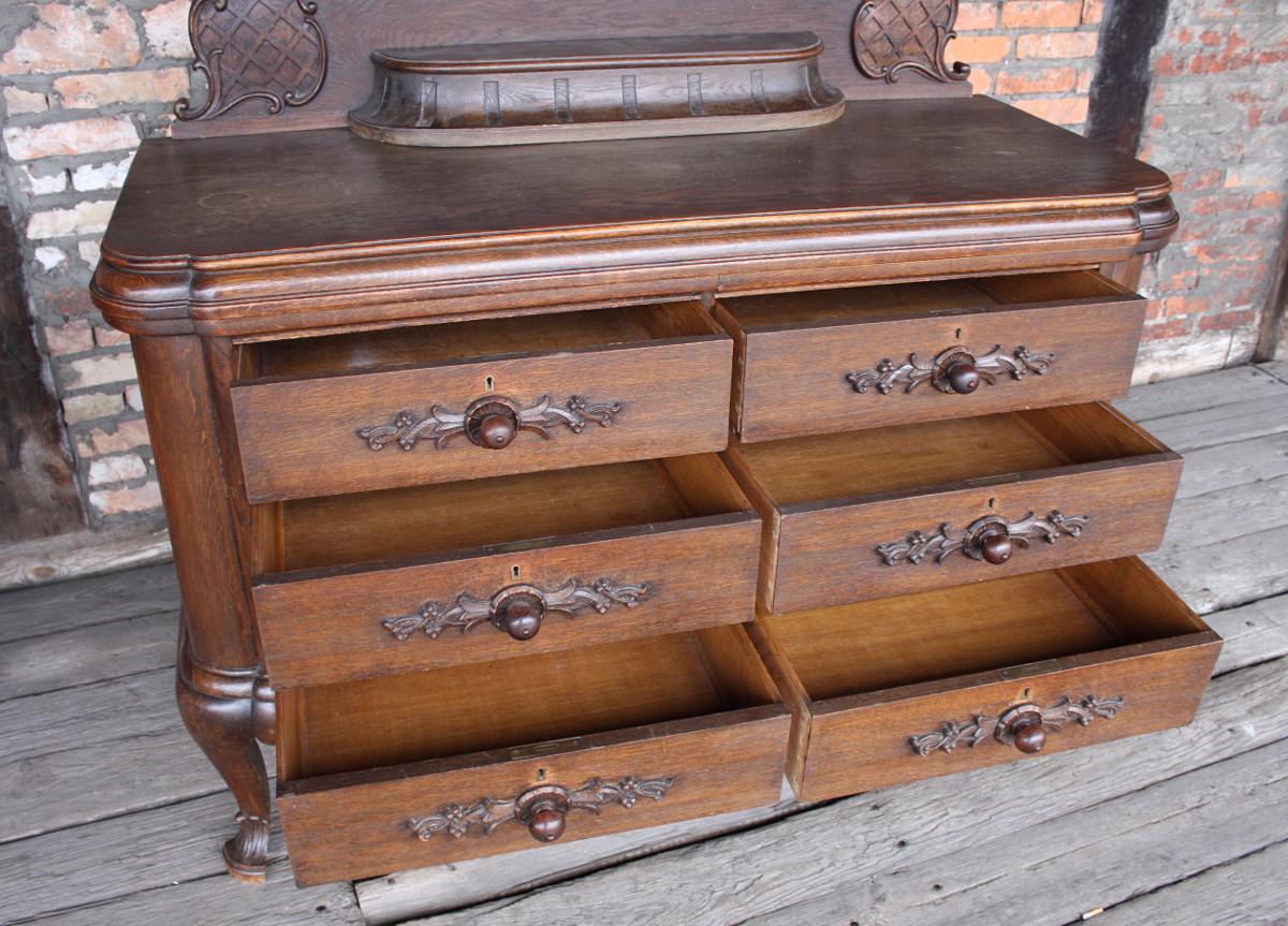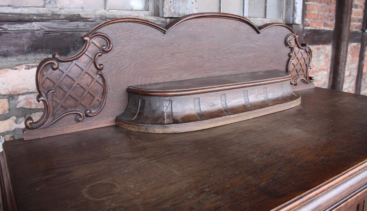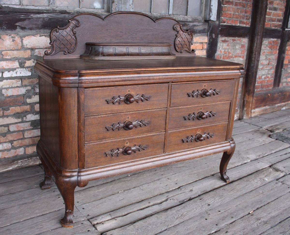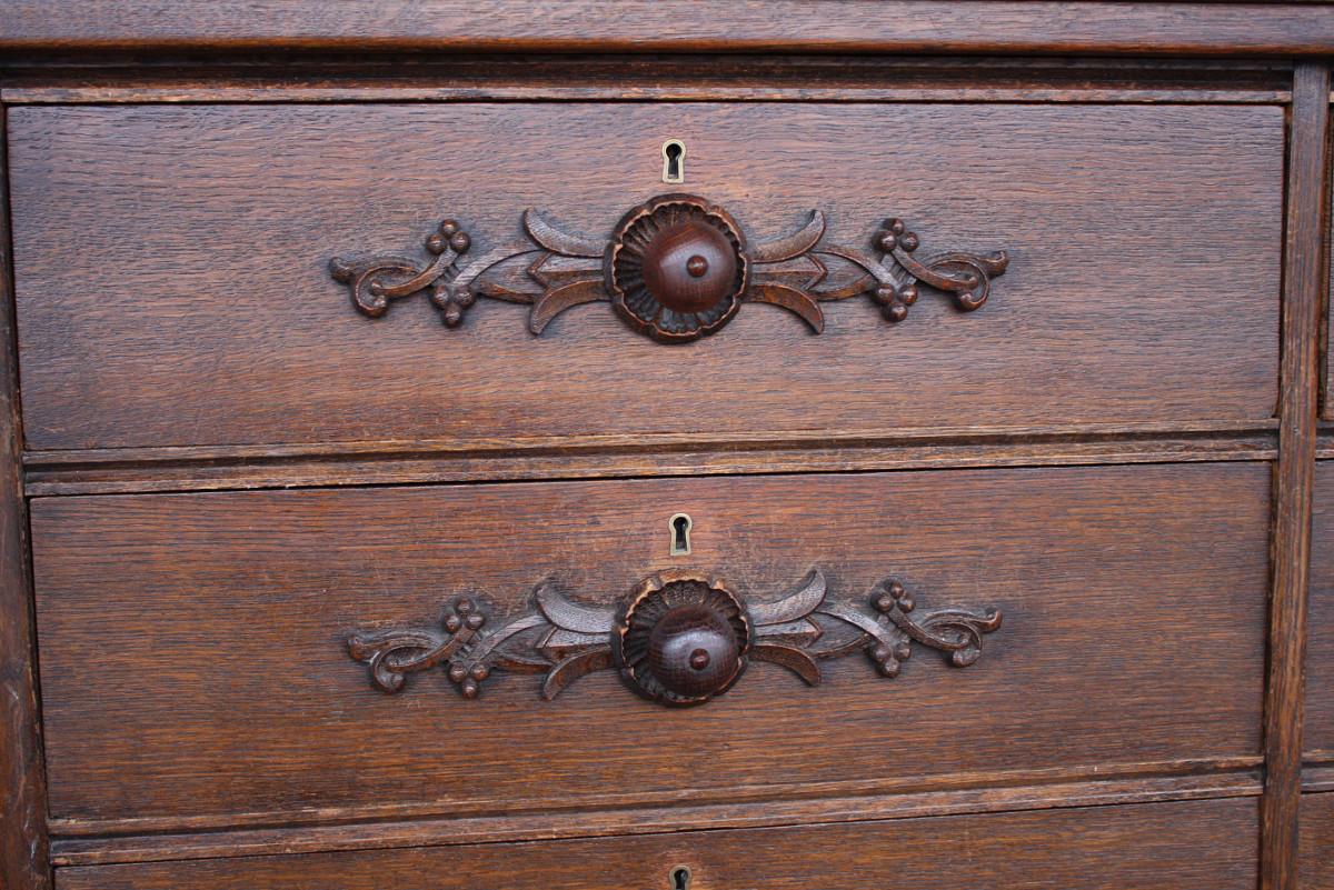 Dębowa komoda-pomocnik z sześcioma szufladami. Uchwyty drewniane, rzeźbione, nogi stosunkowo wysokie, profilowane. Nadstawa z pięknym profilem oraz ciekawymi bocznymi aplikacjami. Funkcjonalności mebla dopełniają dwa wysuwane blaty.