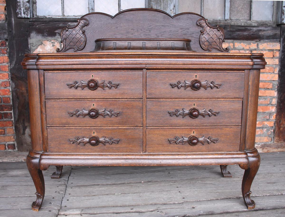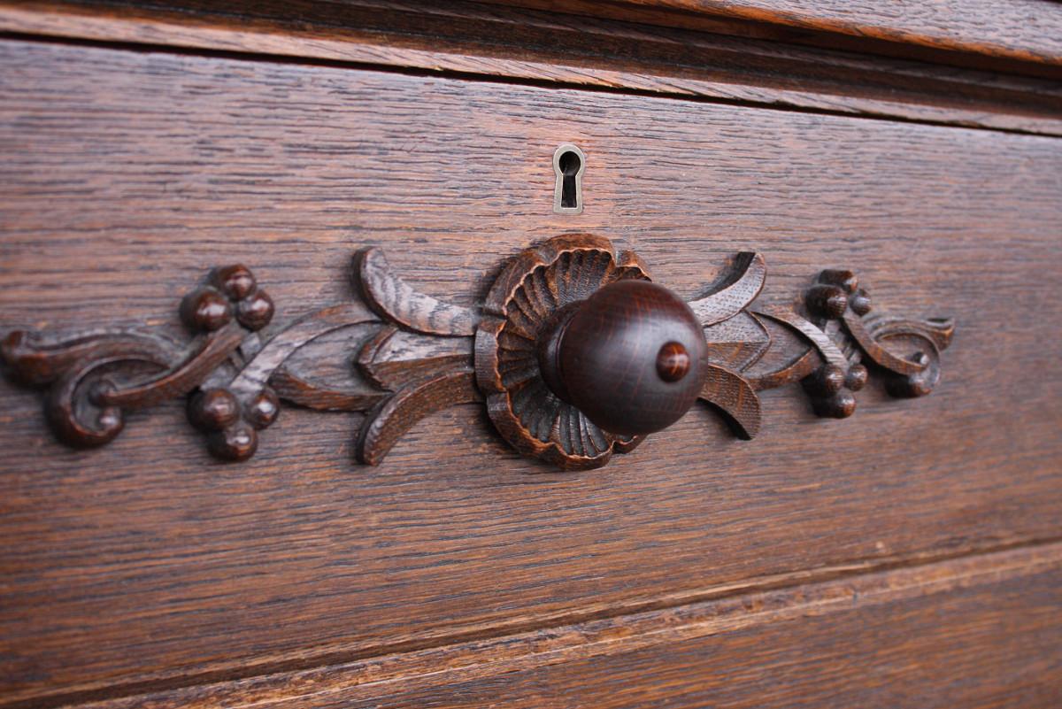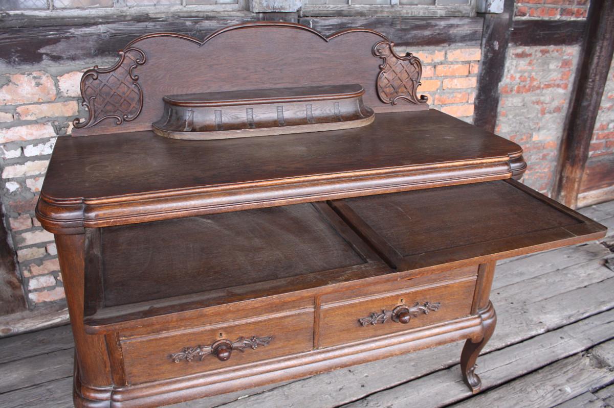 Dębowa komoda-pomocnik z sześcioma szufladami. Uchwyty drewniane, rzeźbione, nogi stosunkowo wysokie, profilowane. Nadstawa z pięknym profilem oraz ciekawymi bocznymi aplikacjami. Funkcjonalności mebla dopełniają dwa wysuwane blaty.
