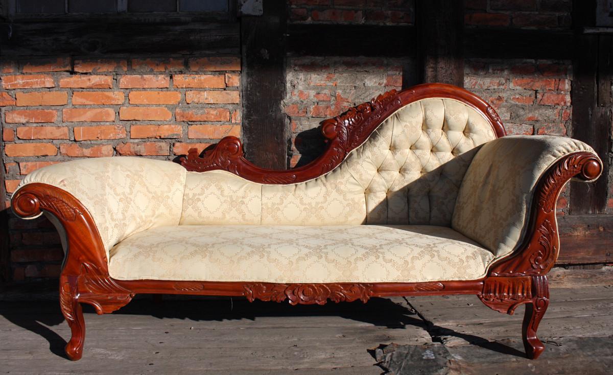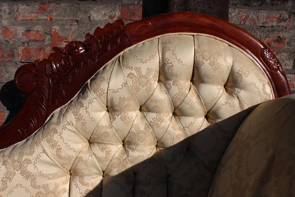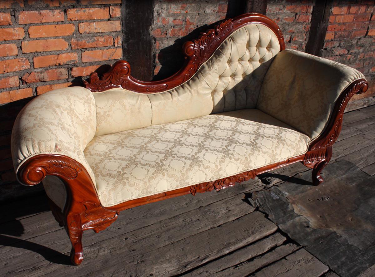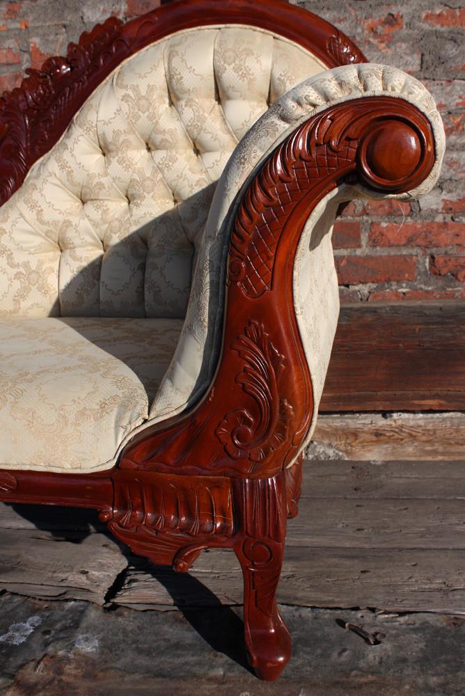 Mahoniowa sofa-szezlong. Stelaż ozdobny z bogatą snycerką. Oparcie przy wezgłowiu pikowane.