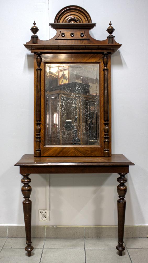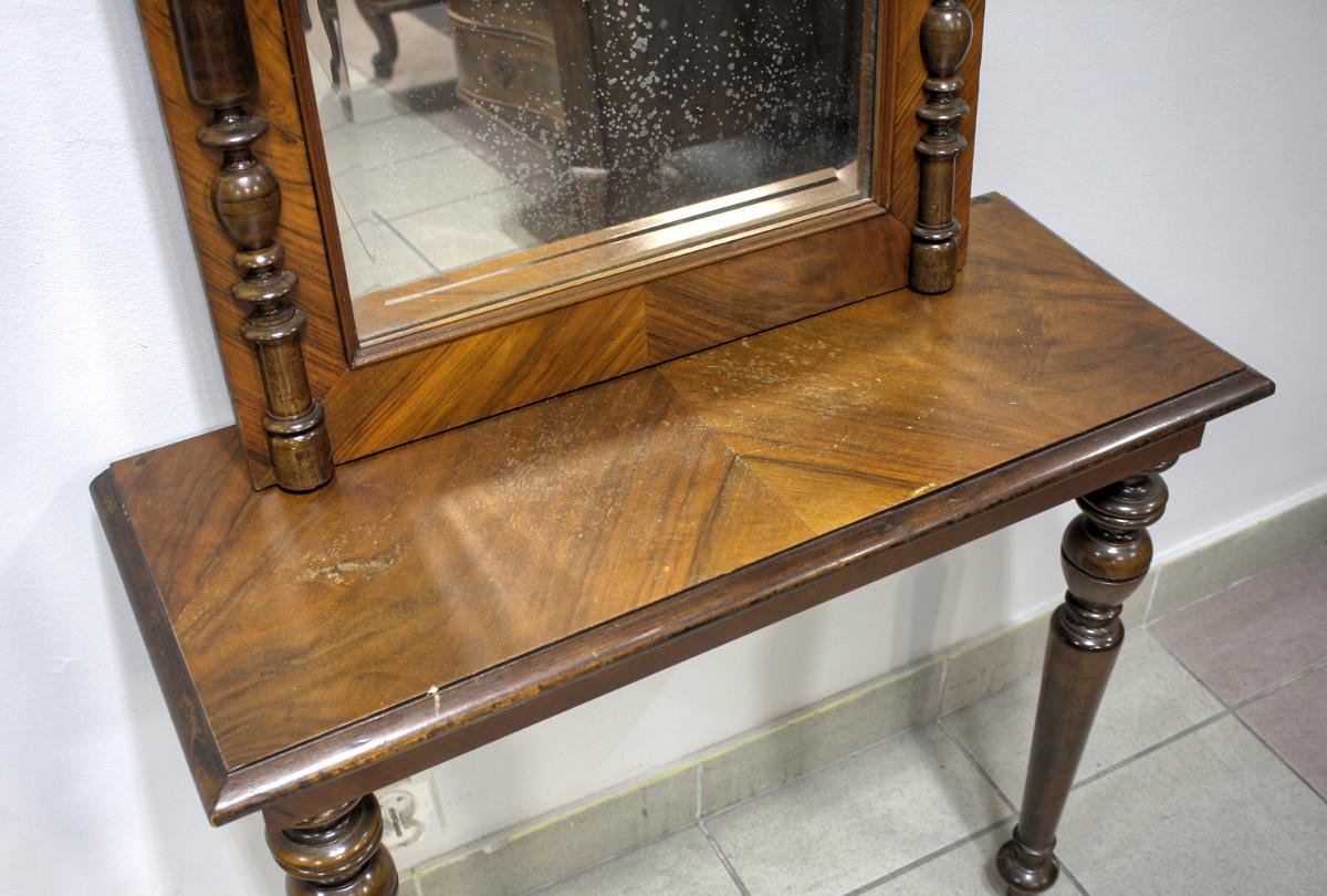 Eklektyczne tremo wykonane w orzechu w komplecie ze zgrabną konsolą. Lustro przystosowane do zawieszenia - niewielka przestrzeń między nim a blatem zdecydowanie zagra na plus.