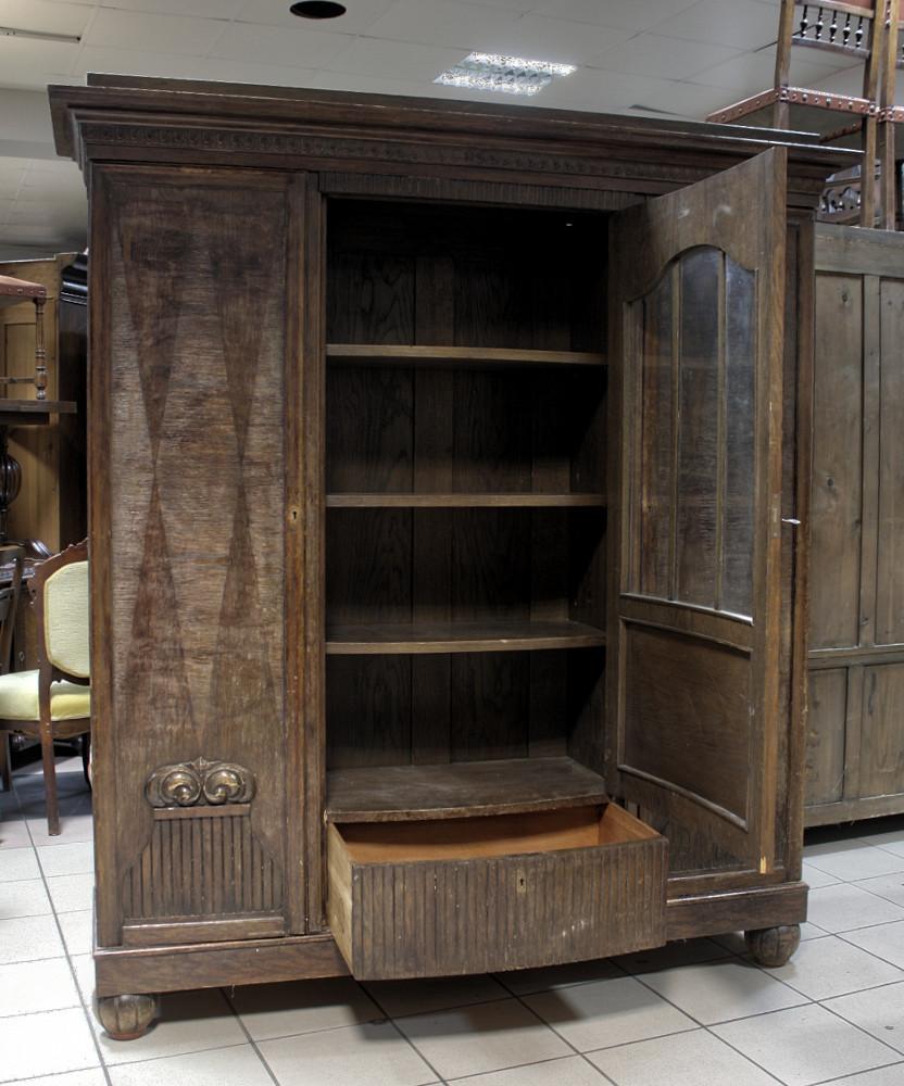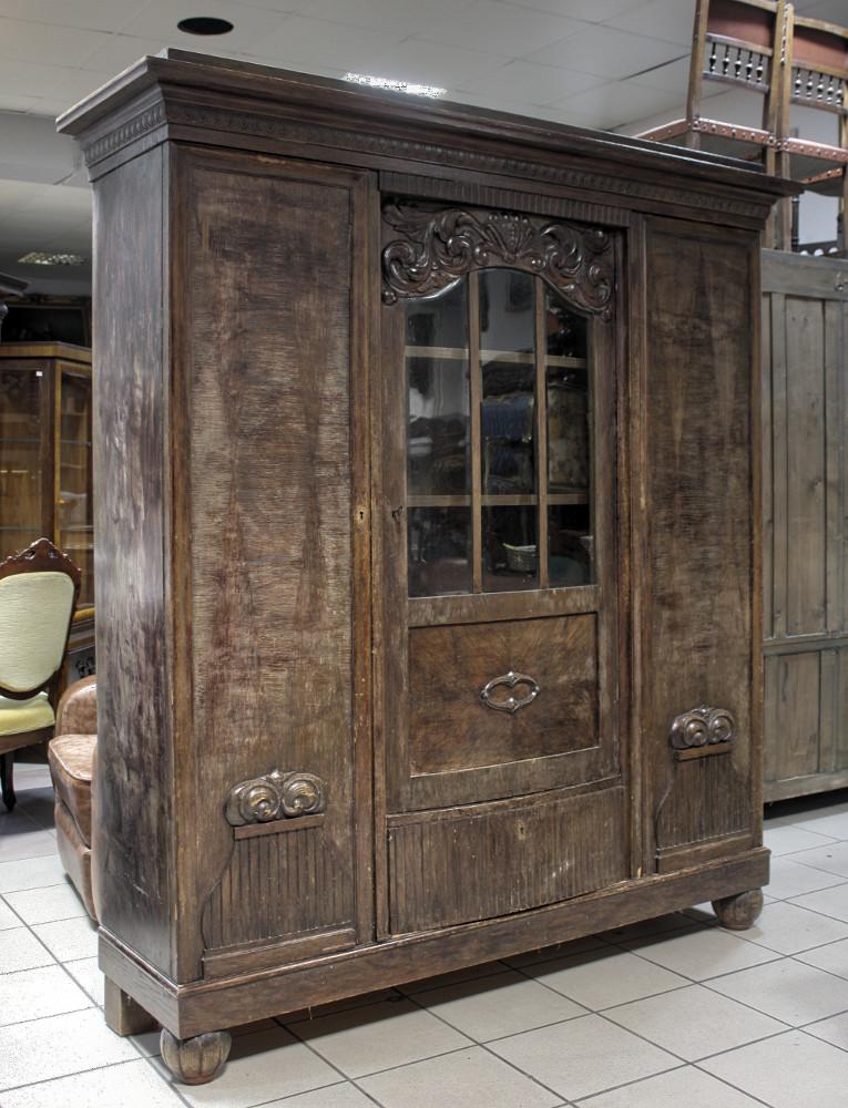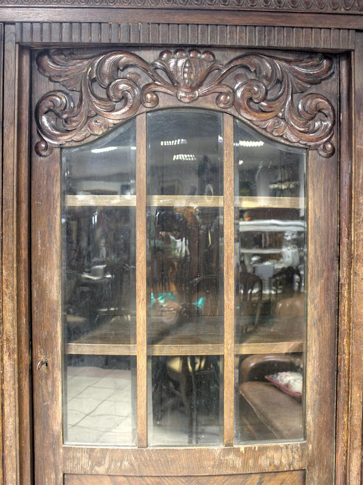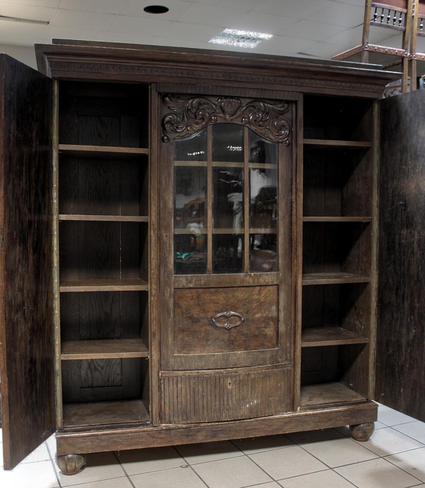 Dębowa biblioteka z początku XX wieku. Mebel zgrabny, z niewielką ilością zdobień. Środkowe drzwi częściowo przeszklone - szyby fazowane. Boczne części zawierają po cztery półki, środkowa trzy. Na dole, w centralnej części mebla znajduje się głęboka i pojemna szuflada, podnosząc tym samym funkcjonalność.