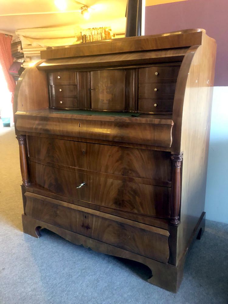 Piękny, bidermeier'owski sekretarzyk. Fornir mahoniowy w piramidalnym układzie - niewątpliwie szata zdobiąca ten fantastyczny mebel. Środkowy schowek dekorowany intarsją, w dolnej części po bokach dwie kolumienki.