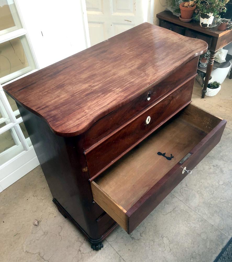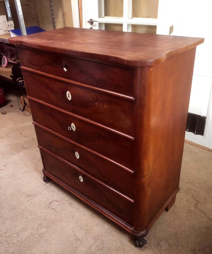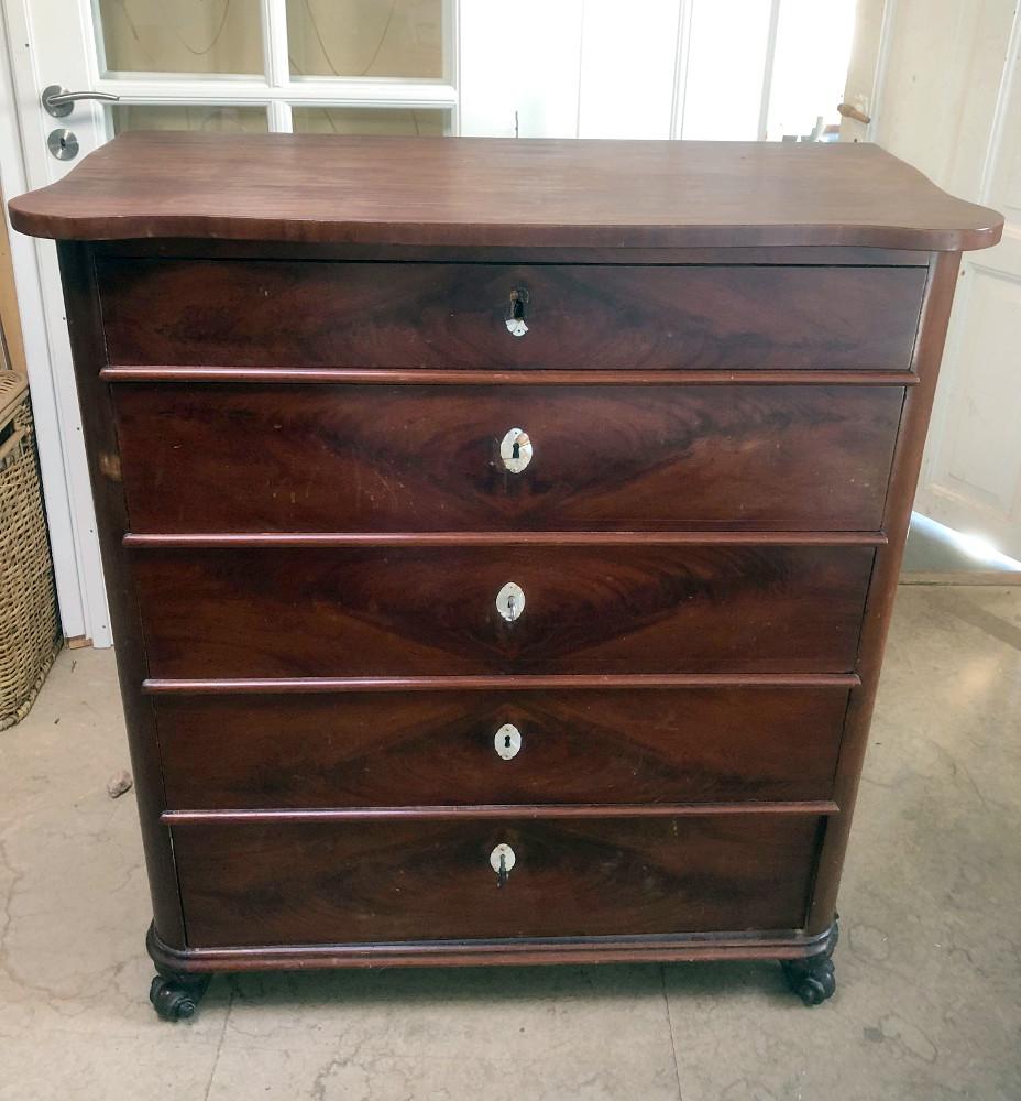 Mahoniowa komoda - szyfoniera z II połowy XIX wieku. Pięć szuflad, przednie nóżki w formie łap drapieżnika.