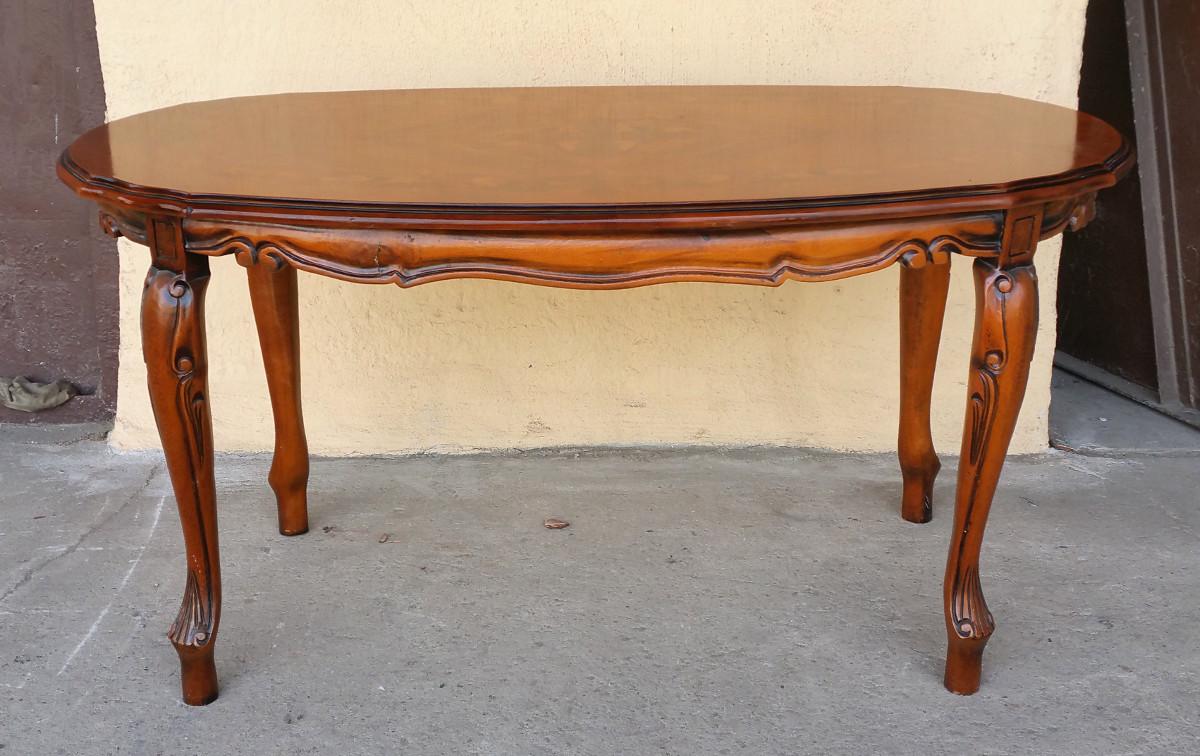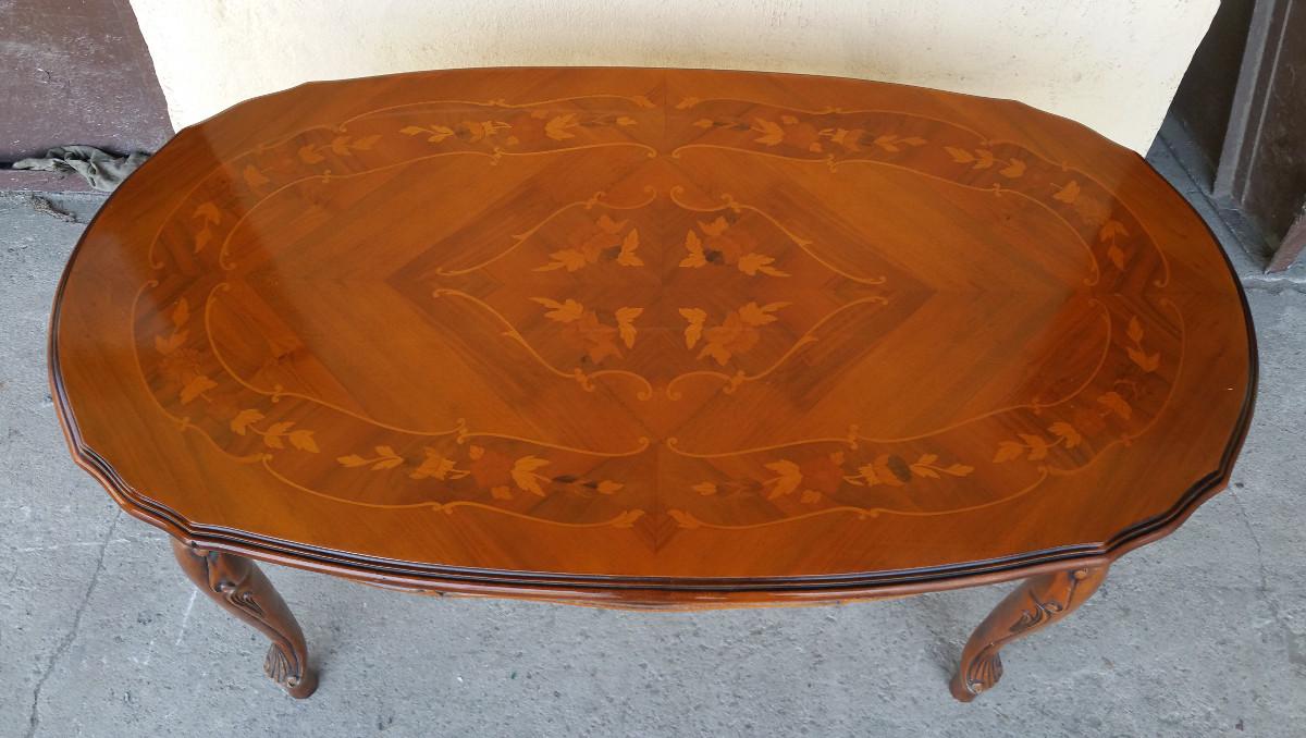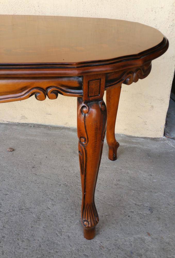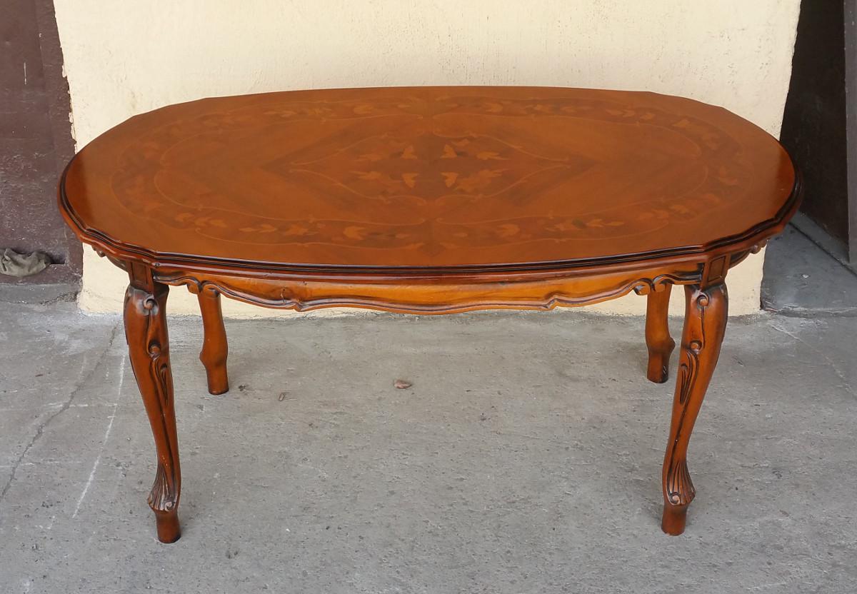 Stylizowana ława z intarsjowanym blatem. Mebel wykonany z drewna orzechowego i bukowego.