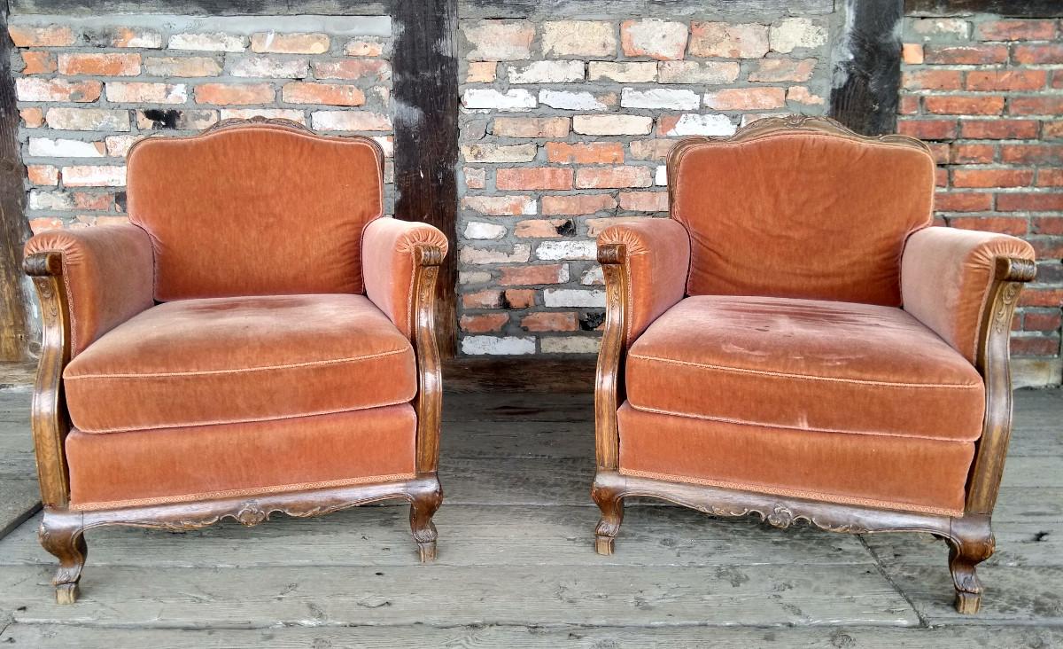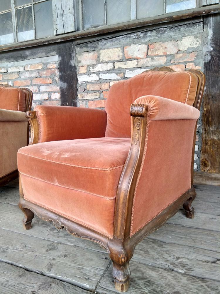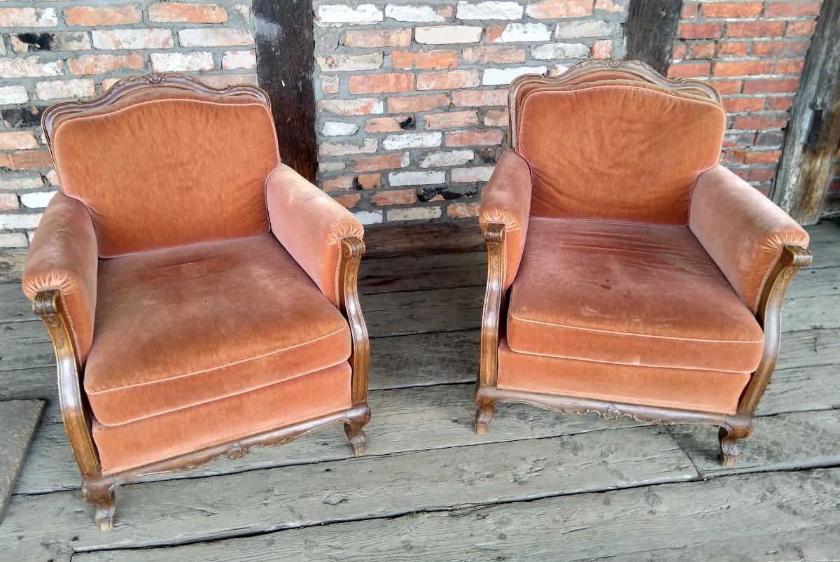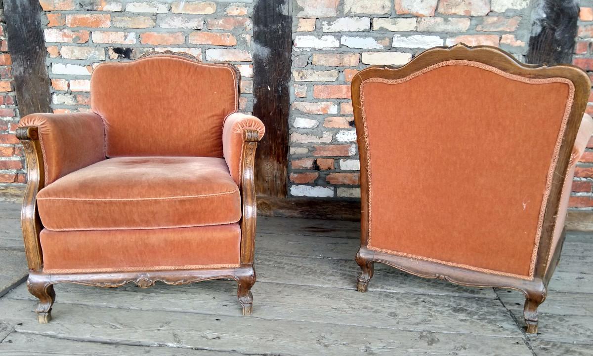 Para foteli chippendale. Stelaż dębowy, charakterystyczny dla stylu. Wygodne, masywne - zdecydowanie wypoczynkowe.