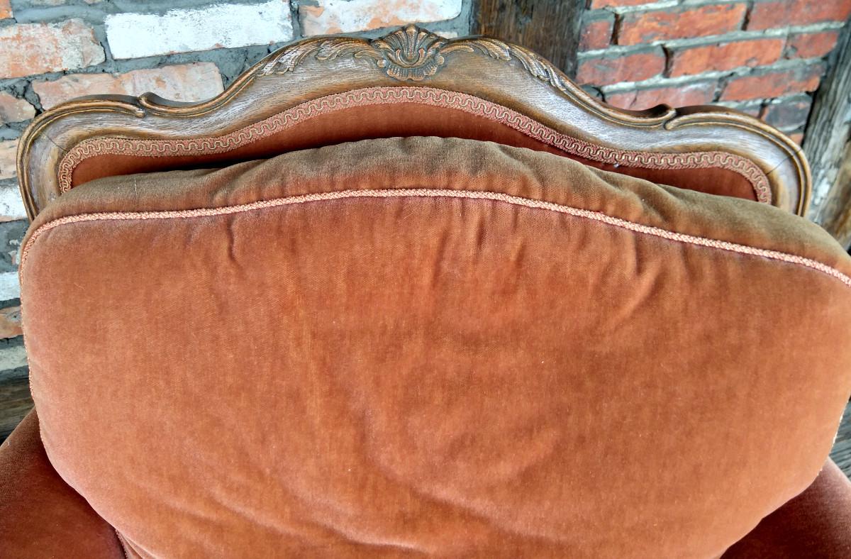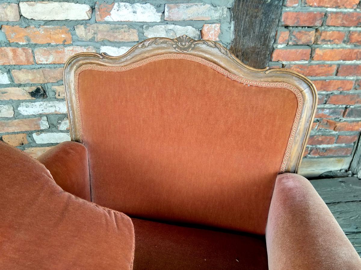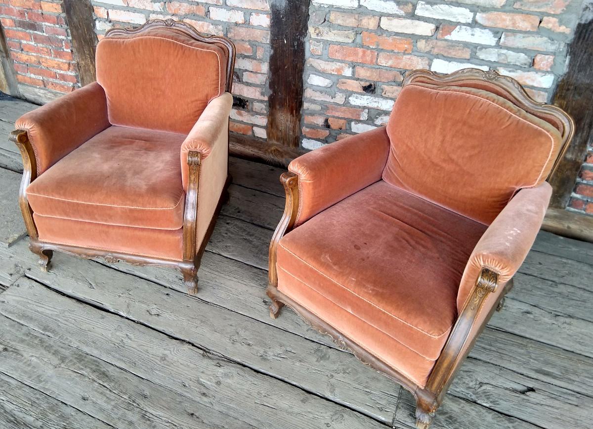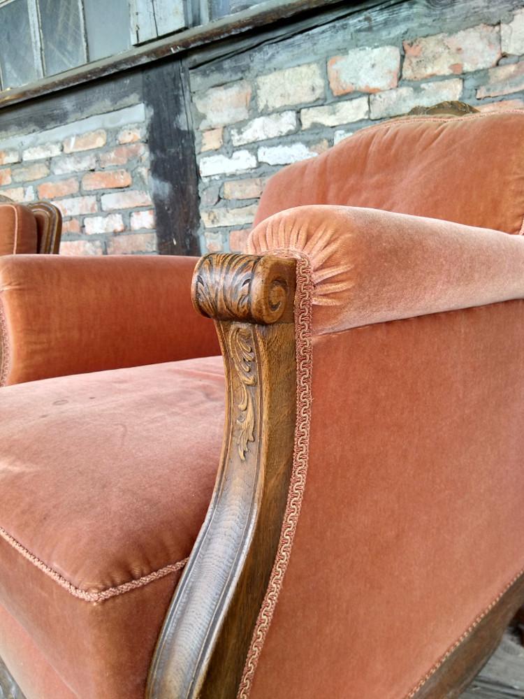 Para foteli chippendale. Stelaż dębowy, charakterystyczny dla stylu. Wygodne, masywne - zdecydowanie wypoczynkowe.