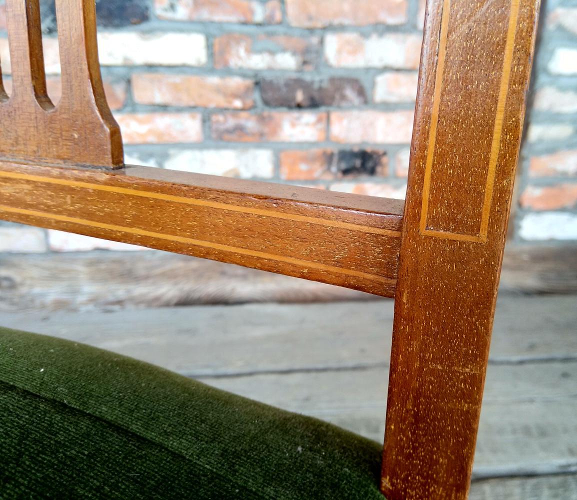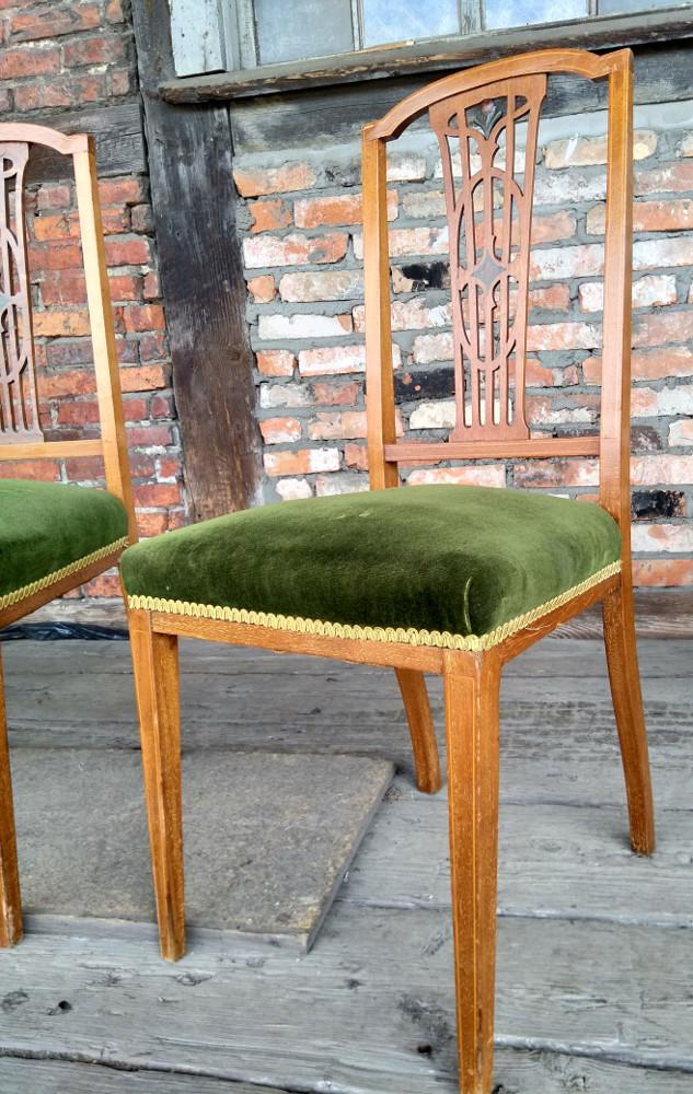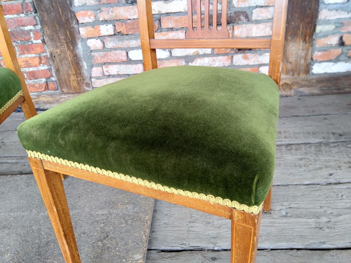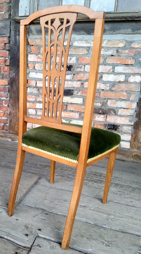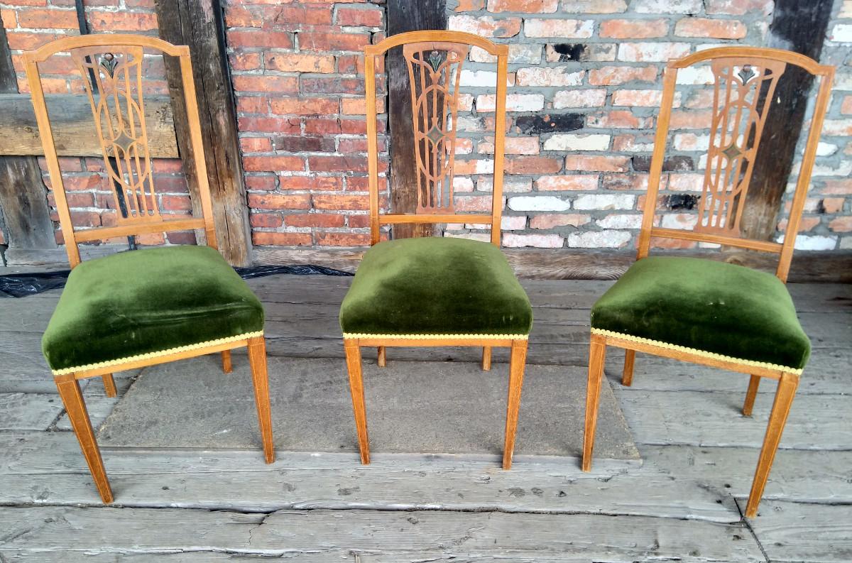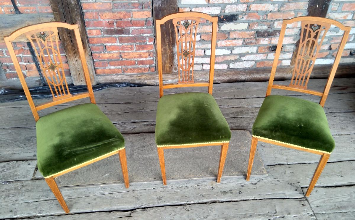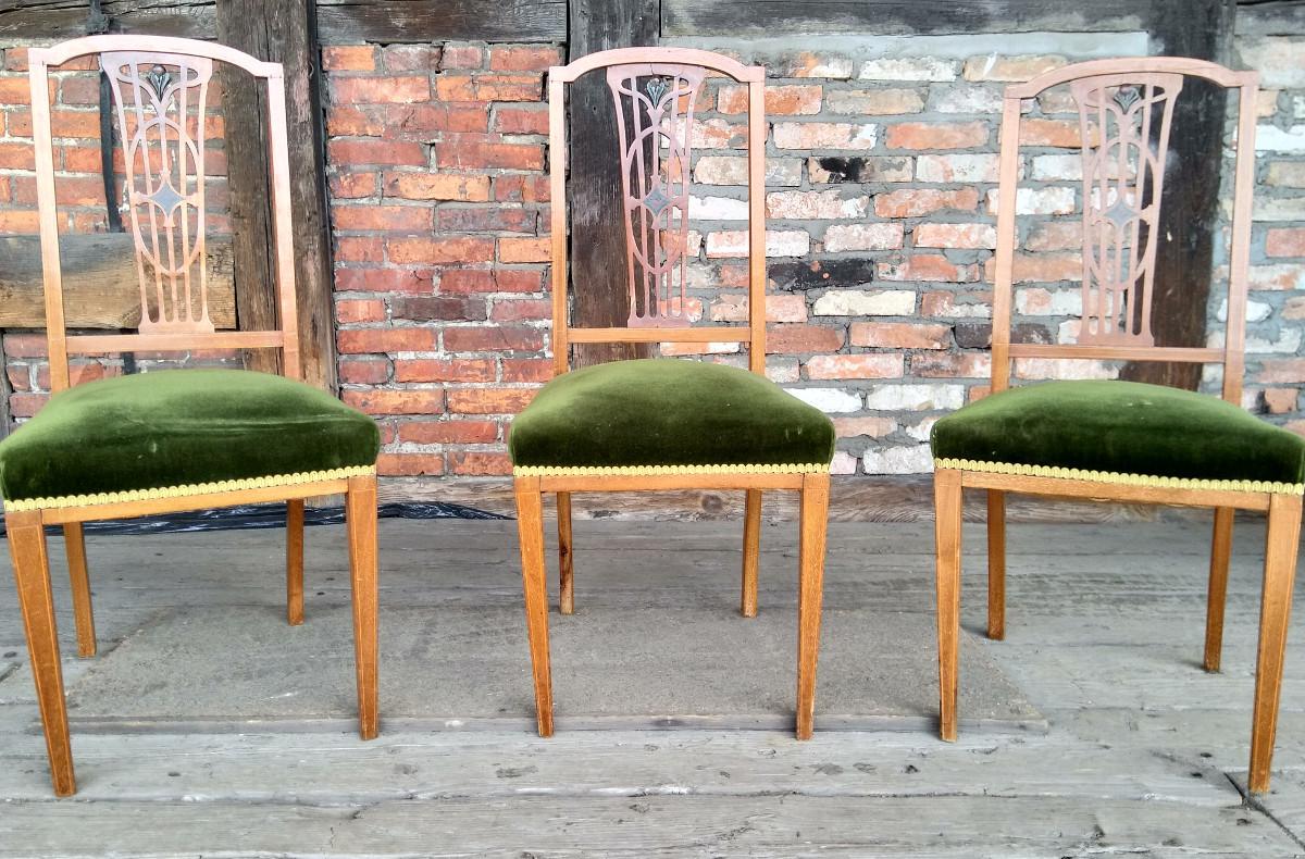Zestaw trzech krzeseł z tapicerowanym siedziskiem. Stelaż dębowy, oparcie ażurowe, zdobienia w postaci intarsji i inkrustacji.