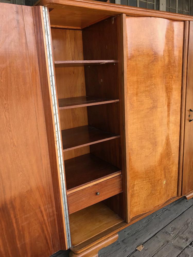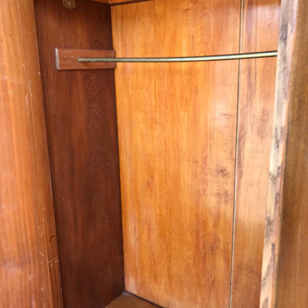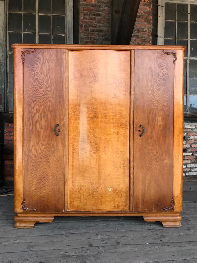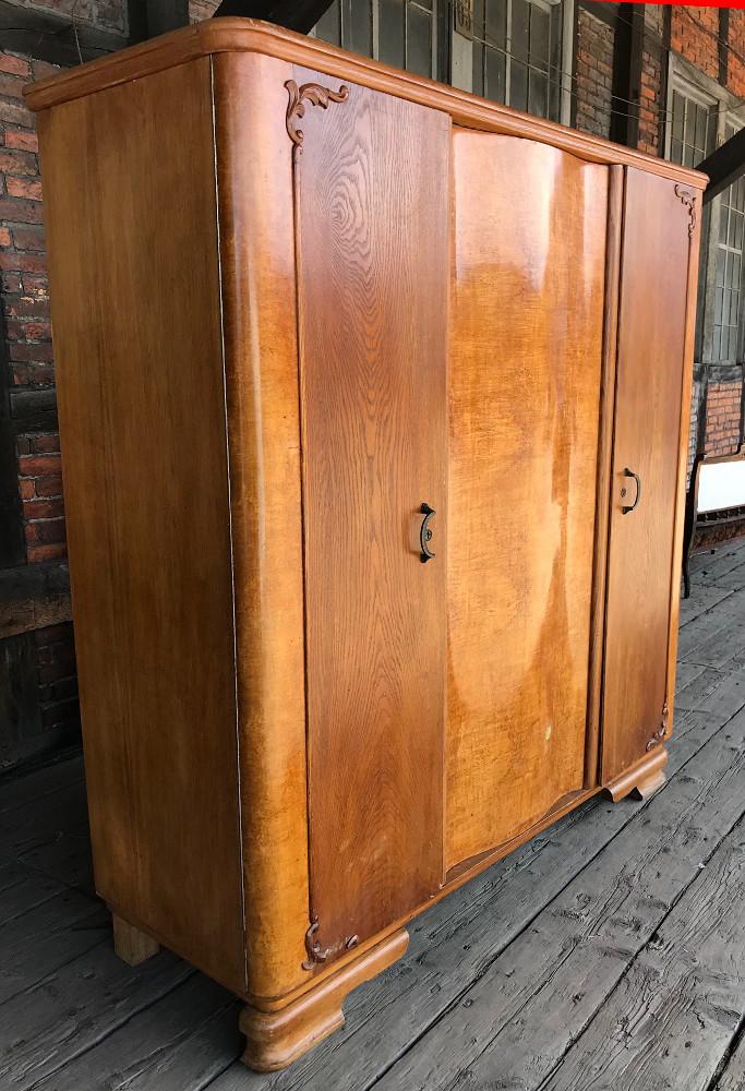 Trzydrzwiowa szafa w stylu chippendale. Mebel fornirowany dębem oraz orzechem - na bocznych drzwiach widoczny piękny rysunek drewna. Nieliczne zdobienia snycerskie. W lewej stronie półki oraz szuflada, w prawej i centralnej drążek na wieszaki.