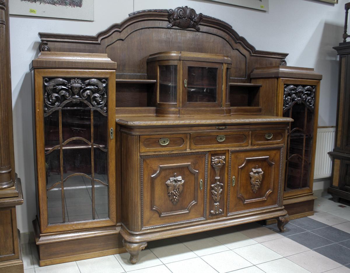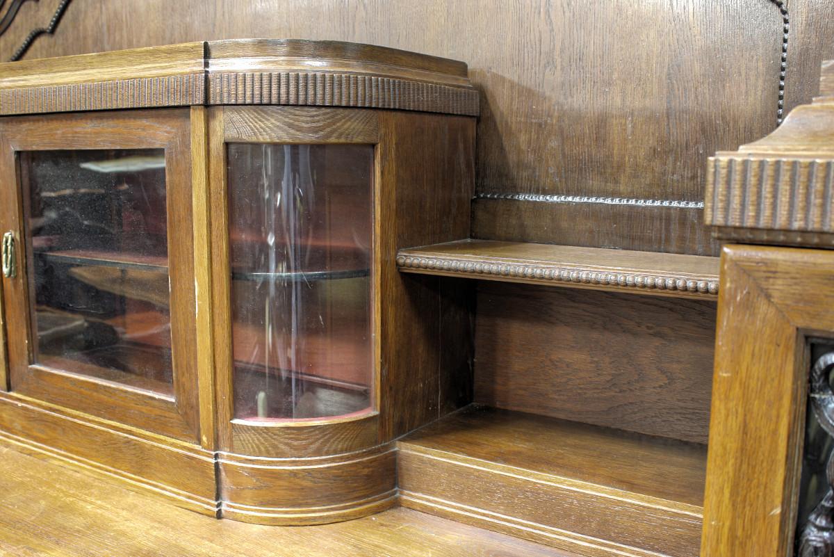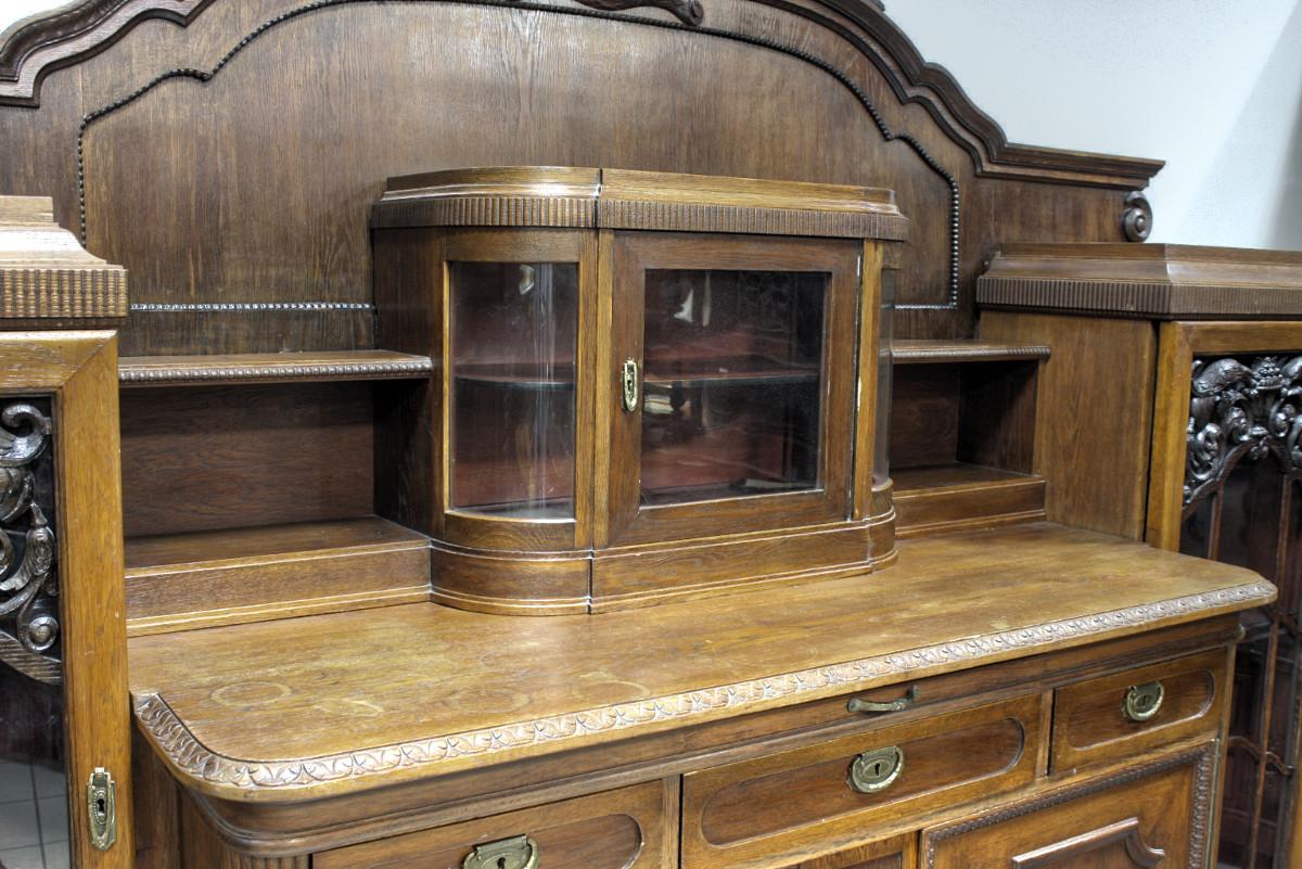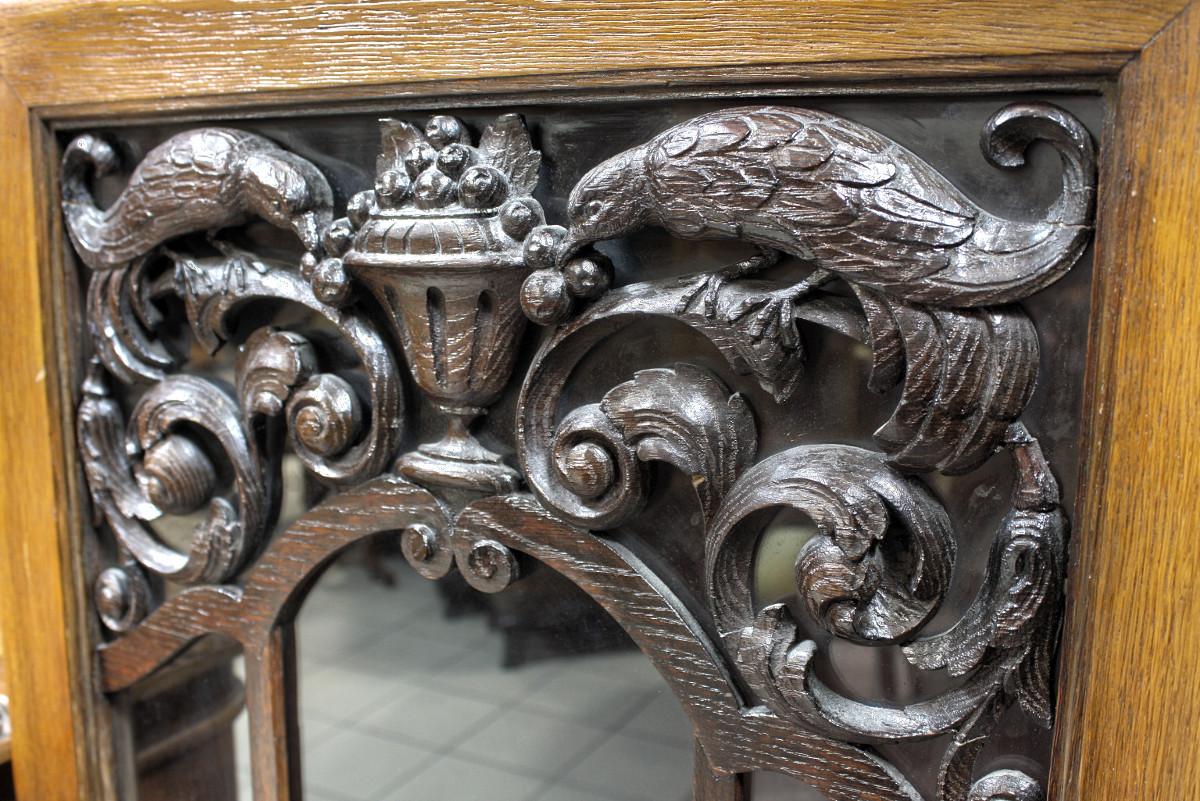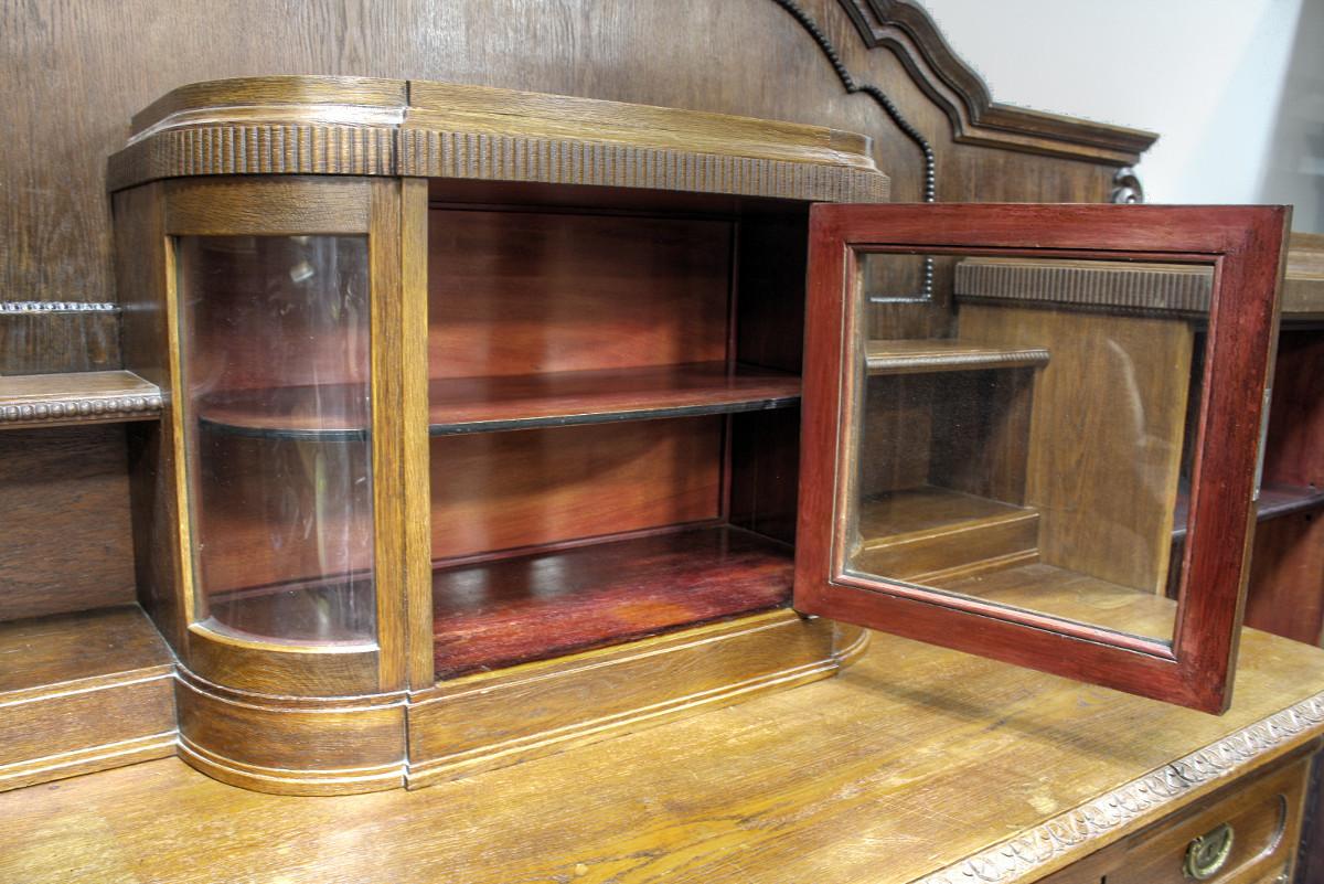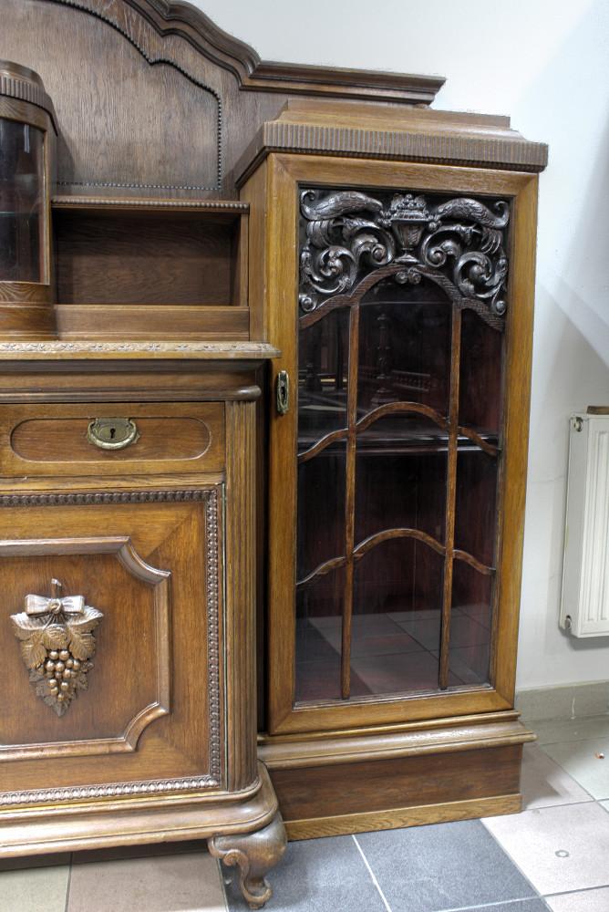 Olbrzymi, dębowy kredens z pięknymi snycerskimi dekoracjami o charakterze floralnym. Szyby bocznych słupków kredensu z ptasim akcentem.