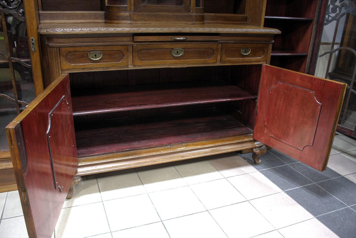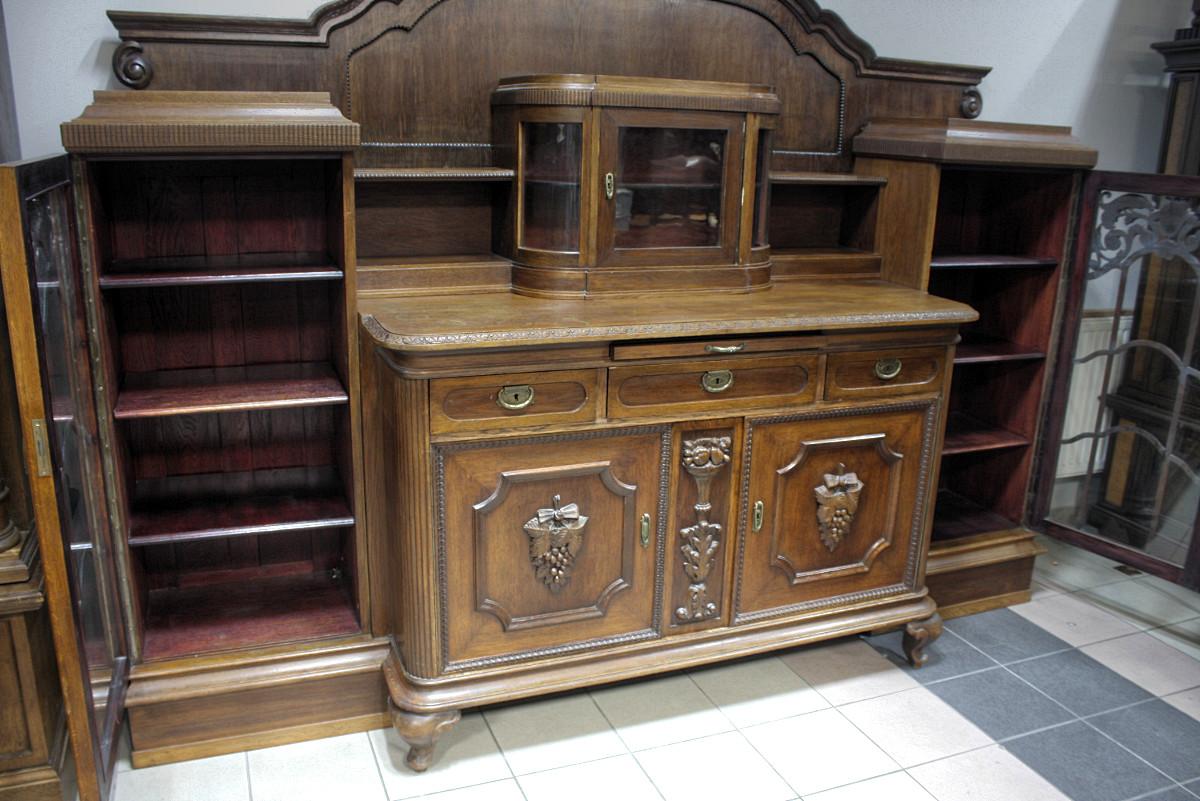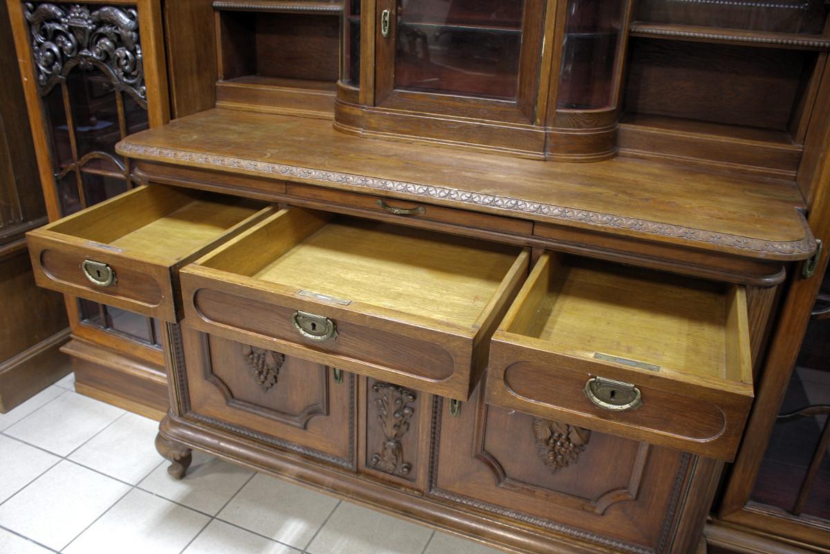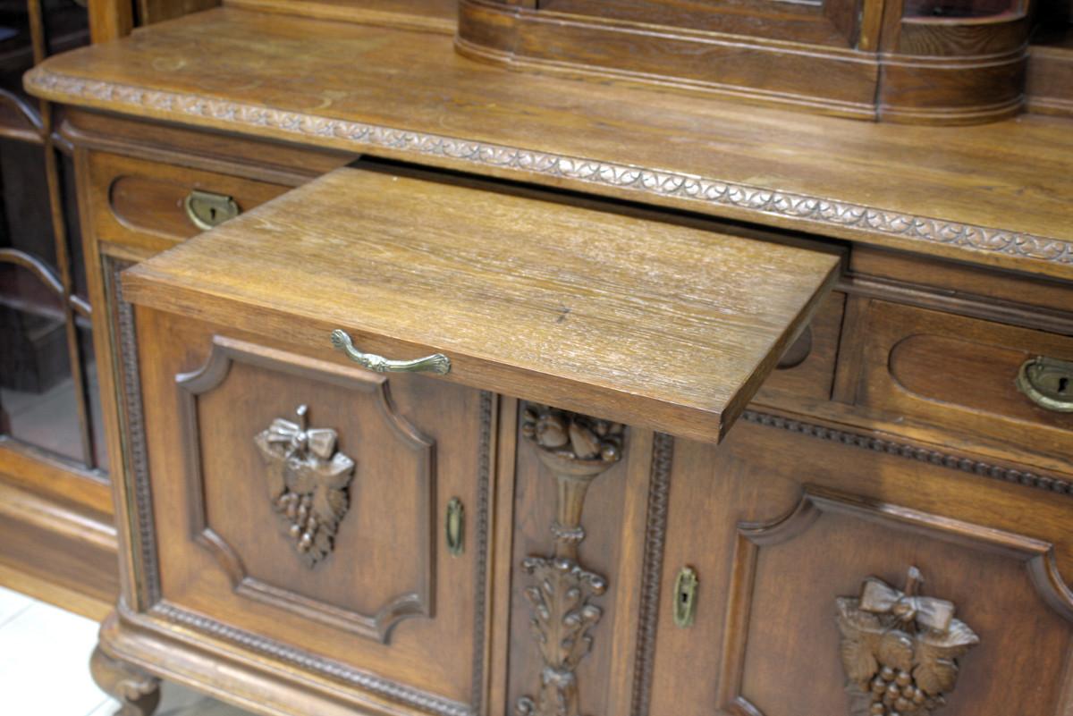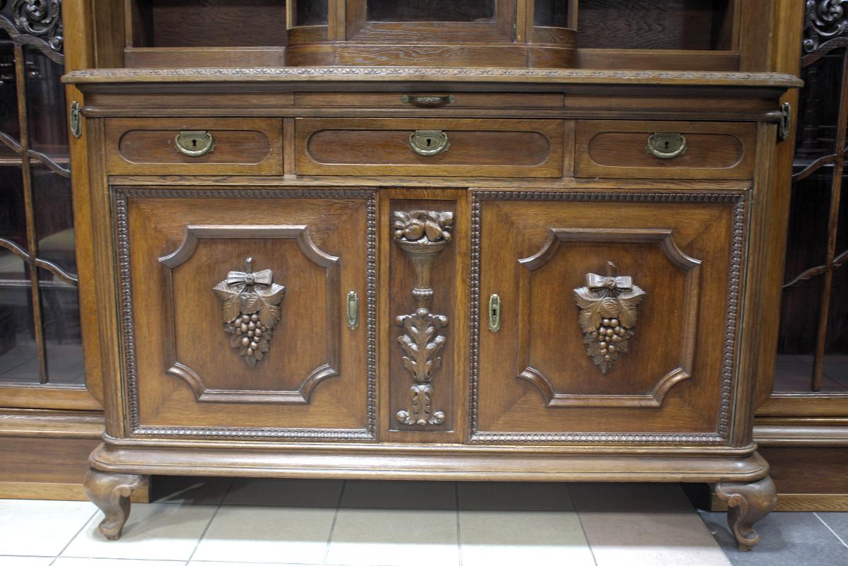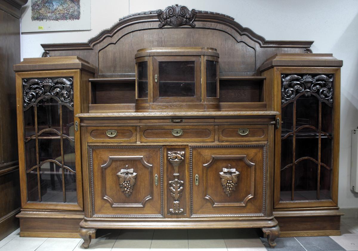 Olbrzymi, dębowy kredens z pięknymi snycerskimi dekoracjami o charakterze floralnym. Szyby bocznych słupków kredensu z ptasim akcentem.