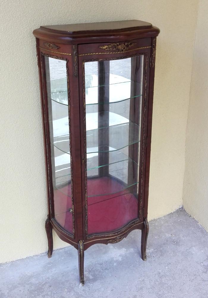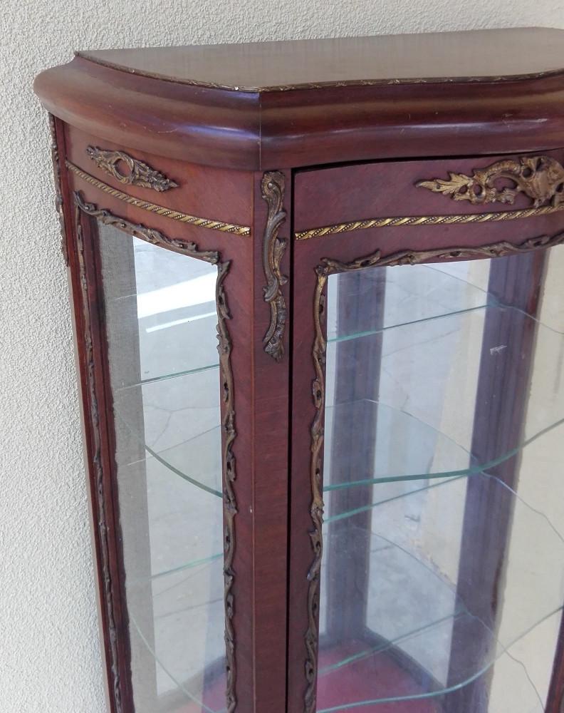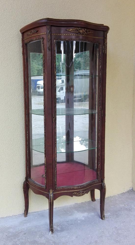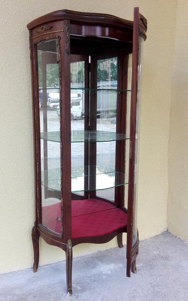 Smukła, neobarokowa serwantka. Mebel wykonany w orzechu z niewielkimi, palisandrowymi wstawkami. Okucia typowe dla stylu, półki szklane.