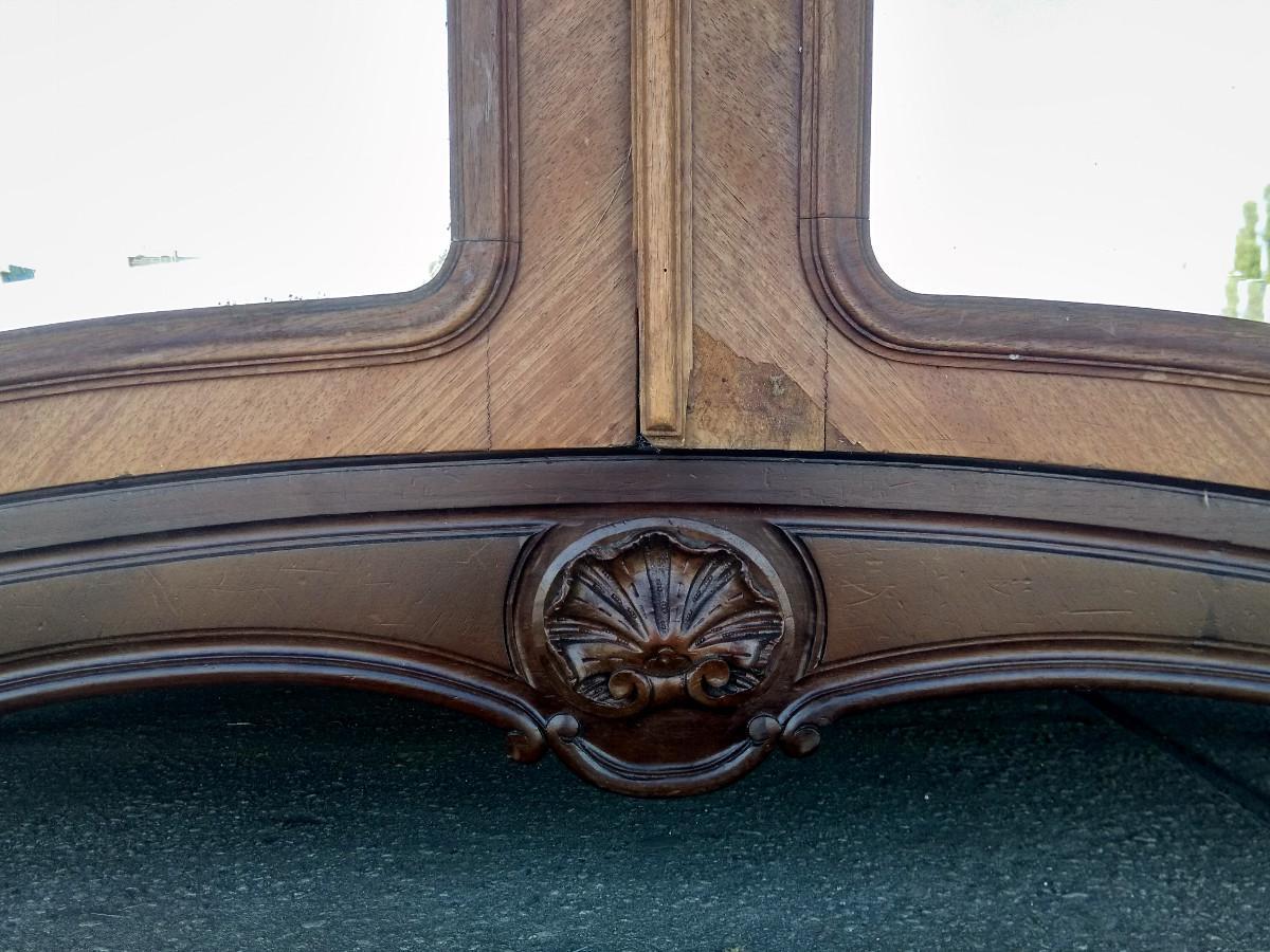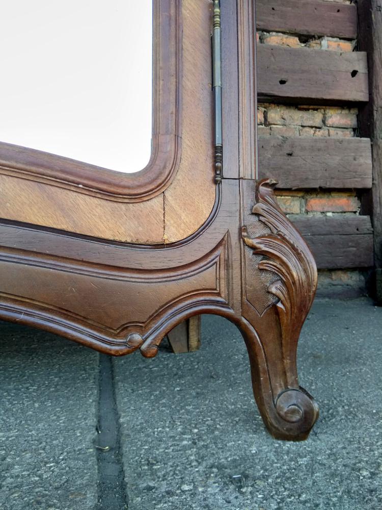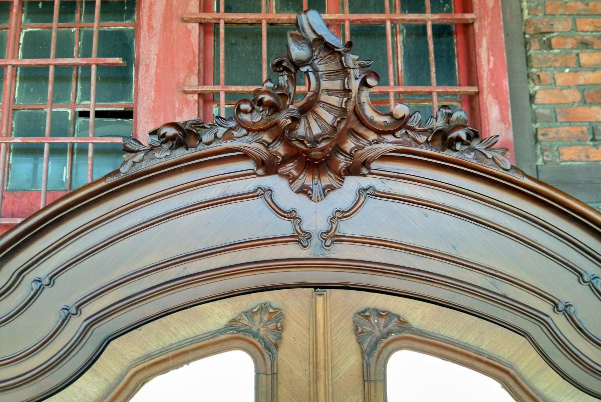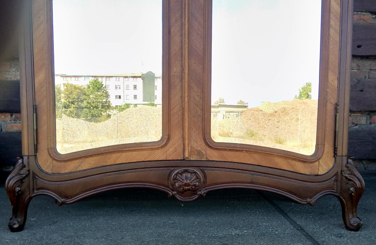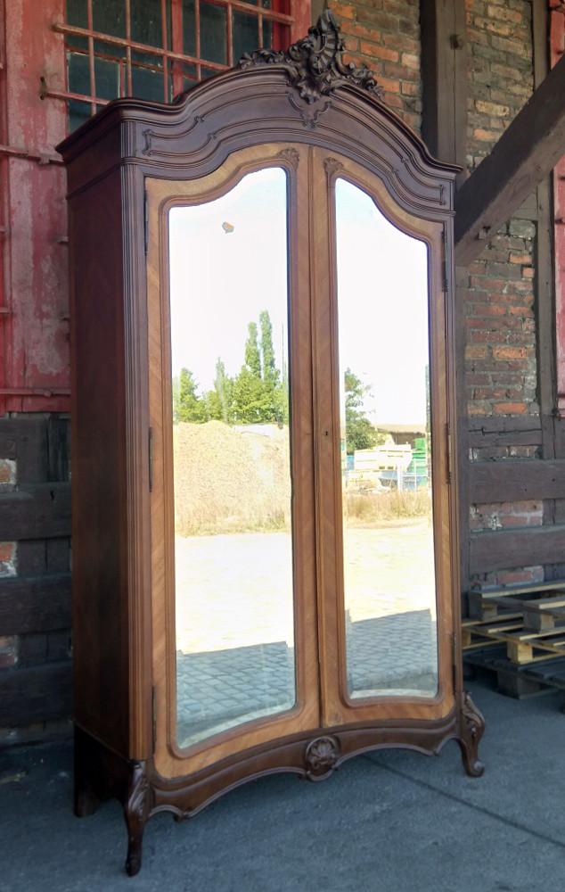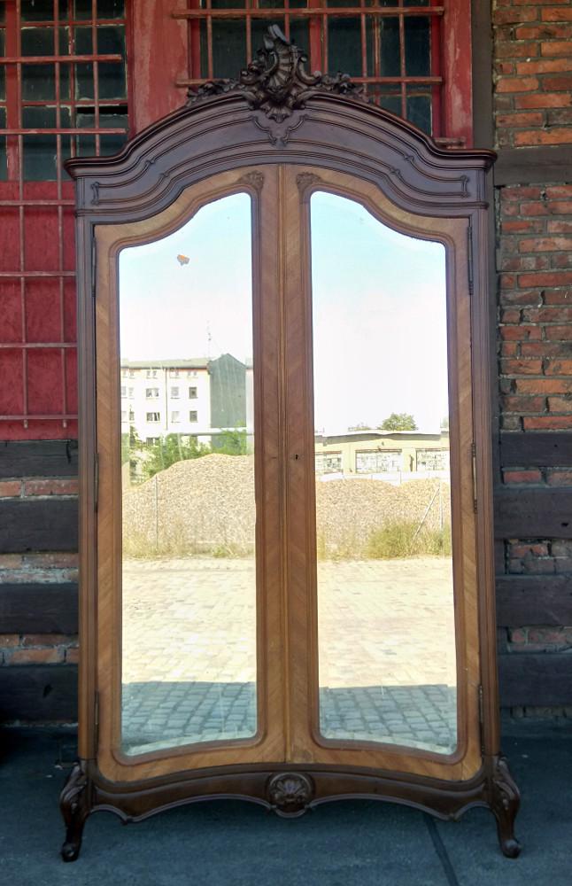 Szafa w stylu rococo. Mebel wykończony w orzechu, płyciny drzwi wyłożone fazowanymi lustrami. Zwieńczenie typowo dla stylu - pięknie rzeźbiony liść akantu. Mebel strzelisty i bardzo wysoki.